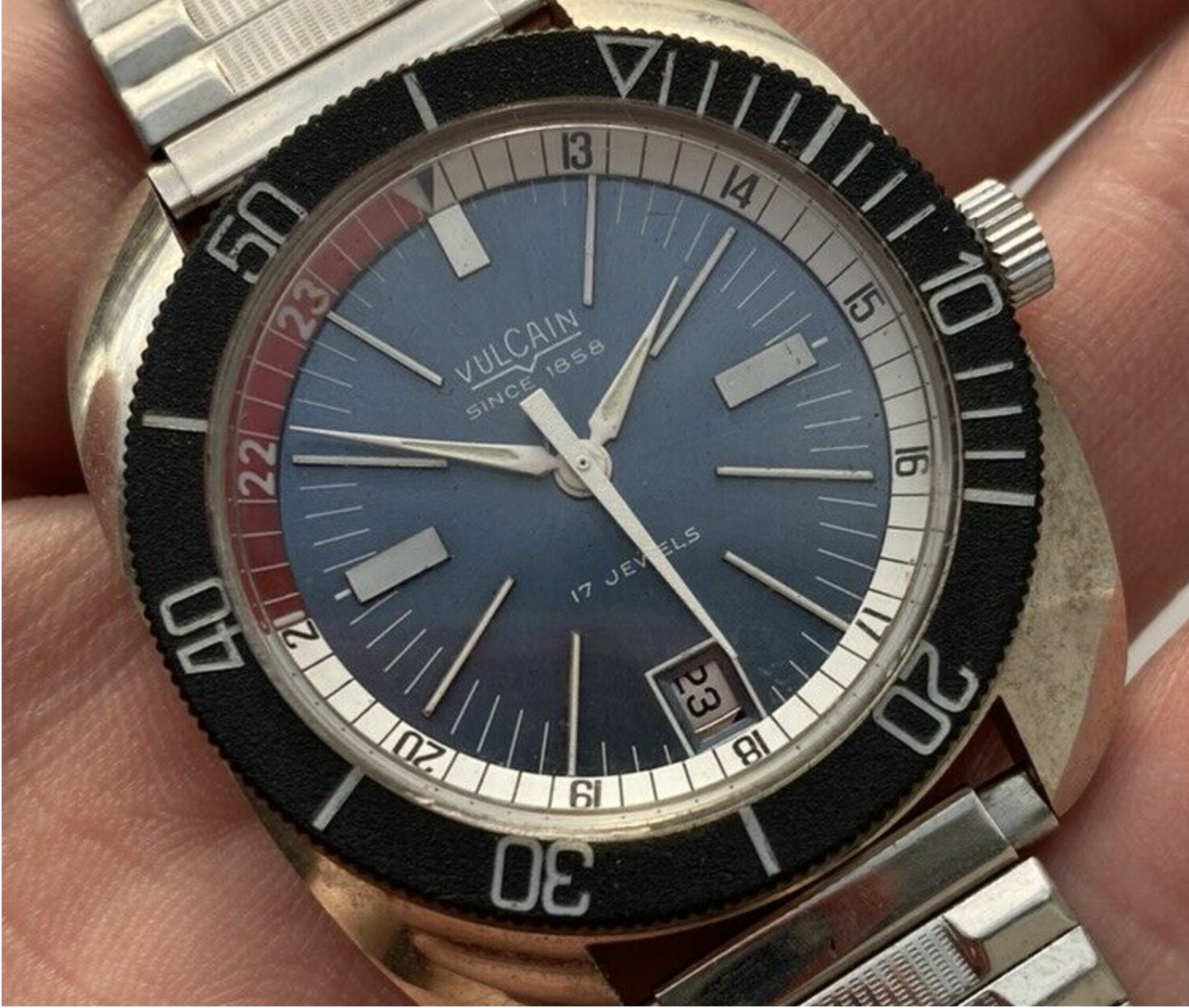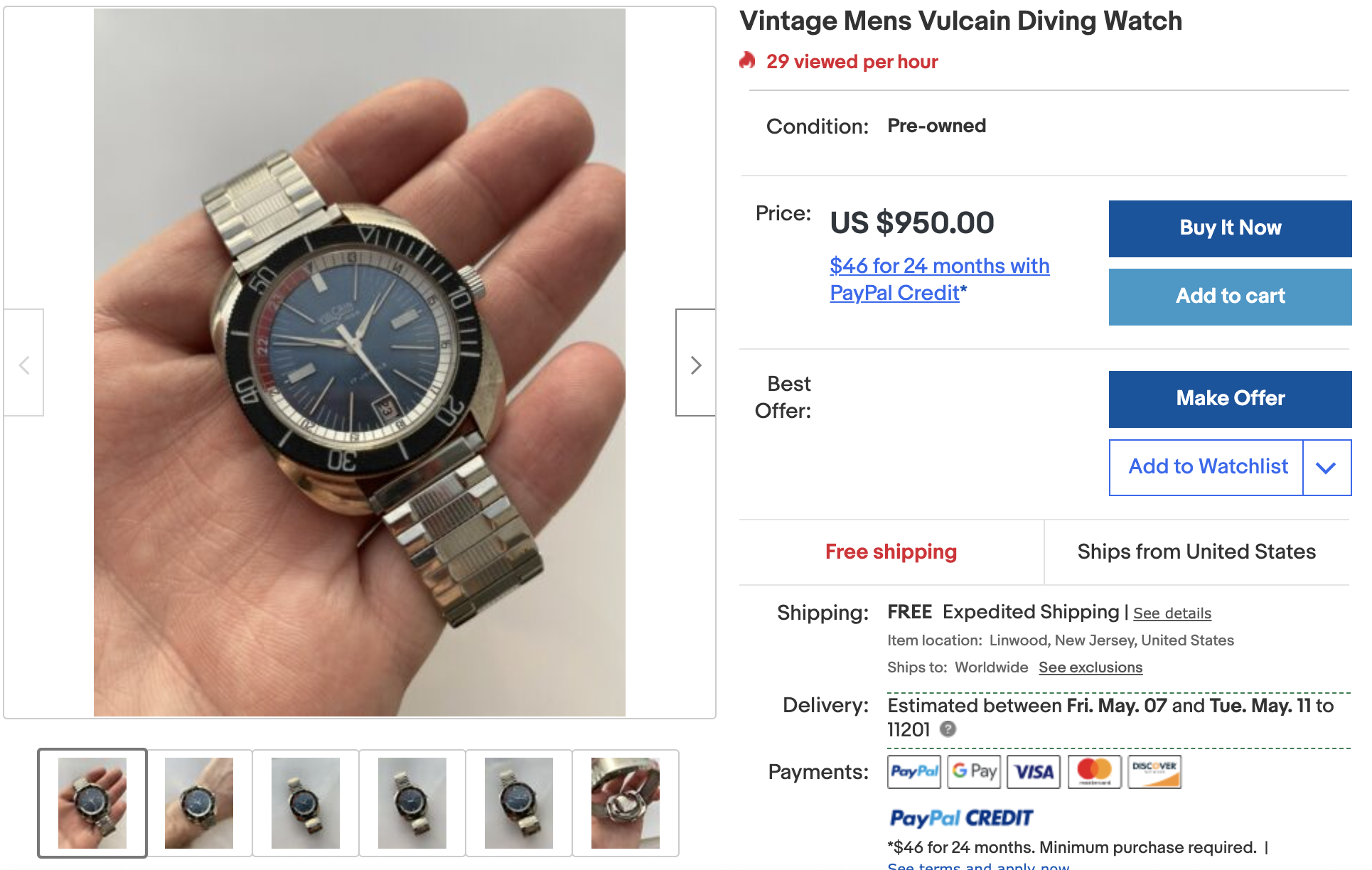 It's priced a bit high, has a chrome plated case and some winding issues, but sill tremendously attractive. The dial, hands and bezel look really amazing with just the right patina. Can't tell if the bracelet is original to the watch but it very well could be. Has make an offer.
