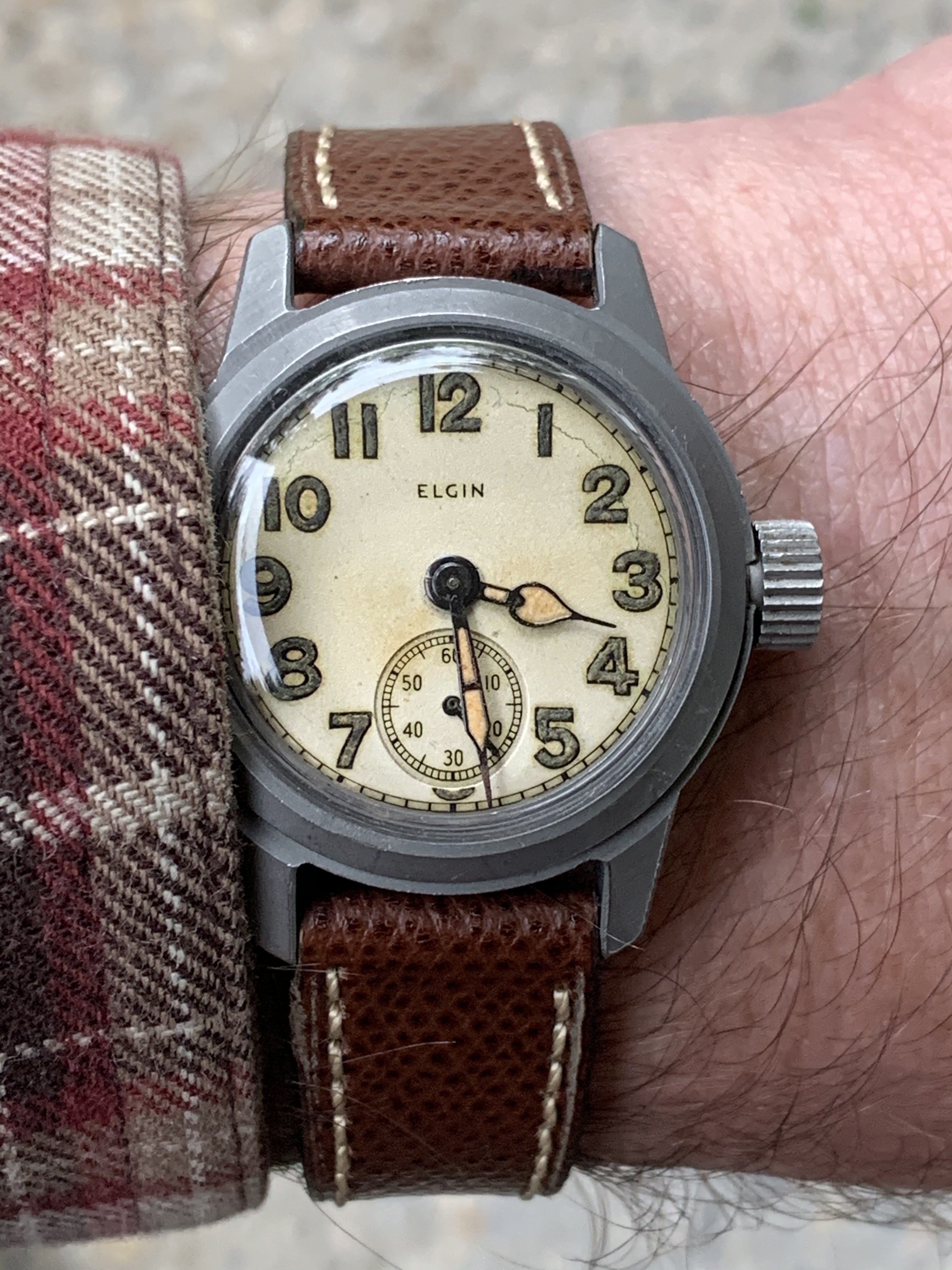 Nice looking Elgin Ord Dept watch. These were typically early watches that were recased by the military post war. This one has a nice dial and hands, some typical marring on the surface but lume is all intact. Seller says recently serviced and running well. Although small at 32mm, these are real military pieces so I wear them with the joy of that in mind- it’s how our grandfathers wore them. Original pass through OD straps still pop up on eBay to make it complete. If I didn’t already own one of these, I would grab this one at the BIN.