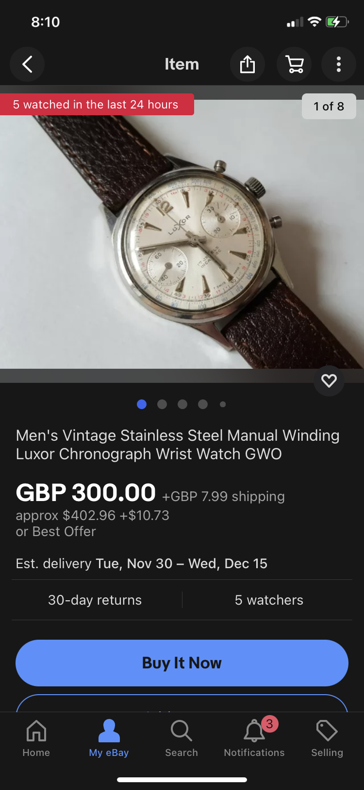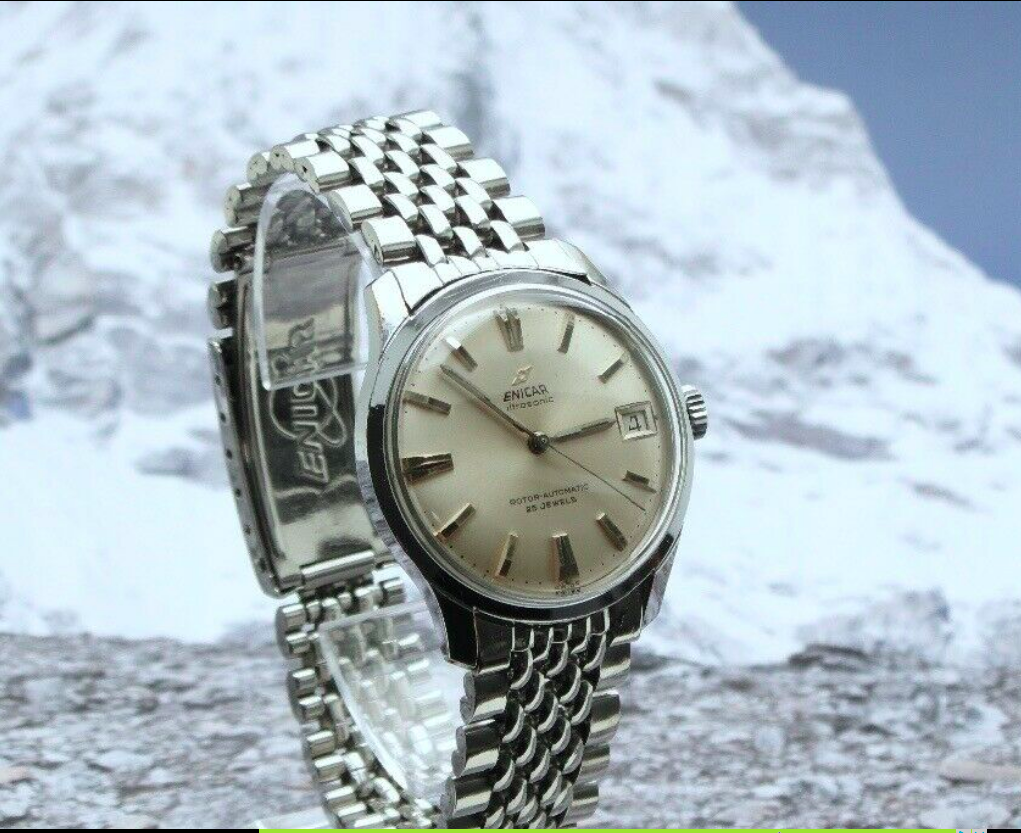 A nice Enicar, recently serviced, with the original BOR bracelet and signed clasp. A bit pricey as listed (£395), but the seller is open to reasonable offers.