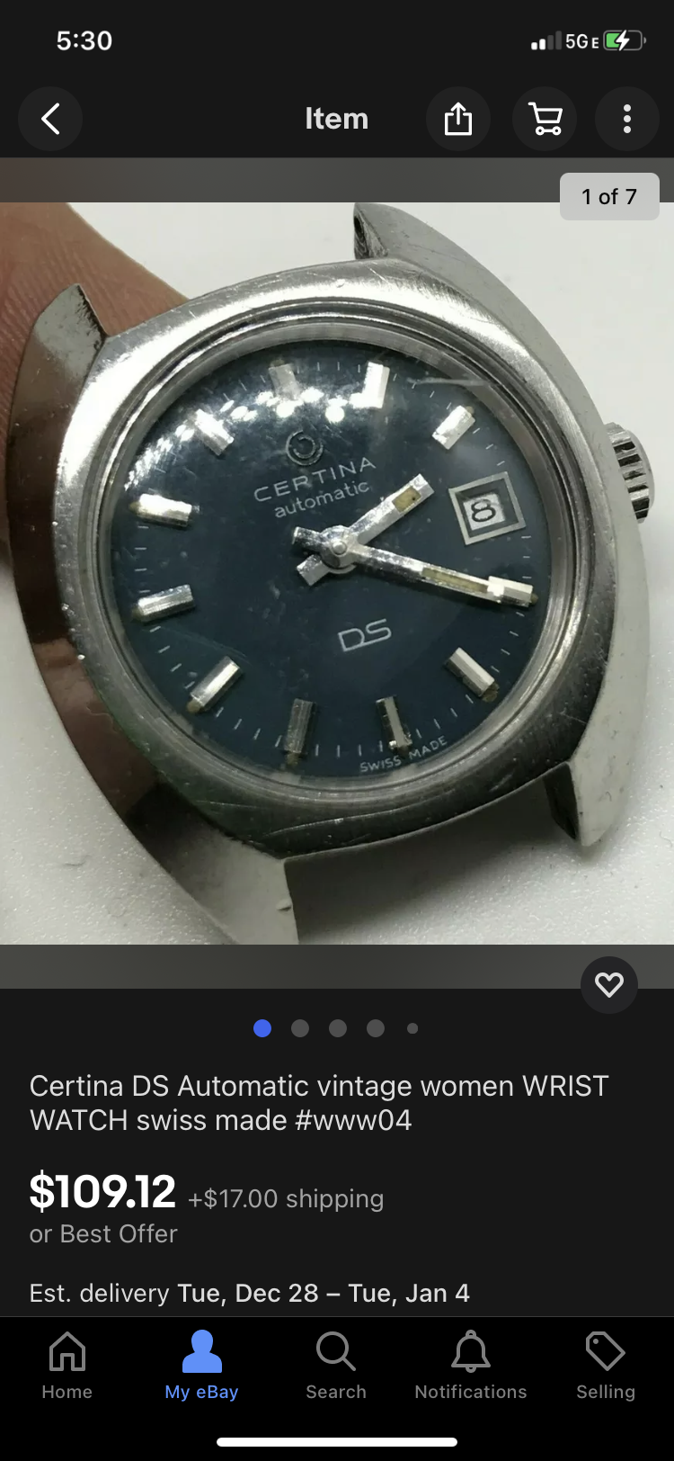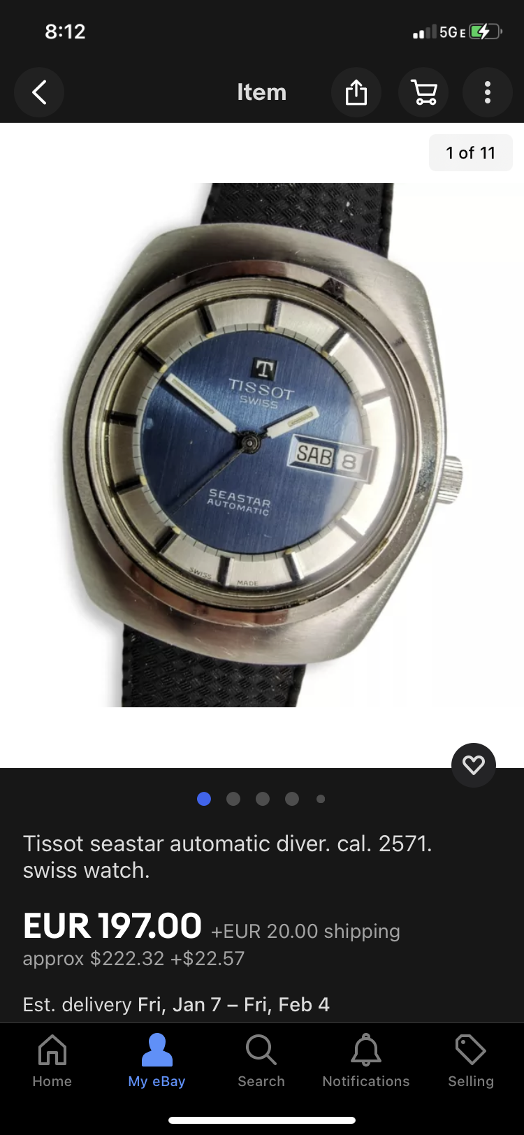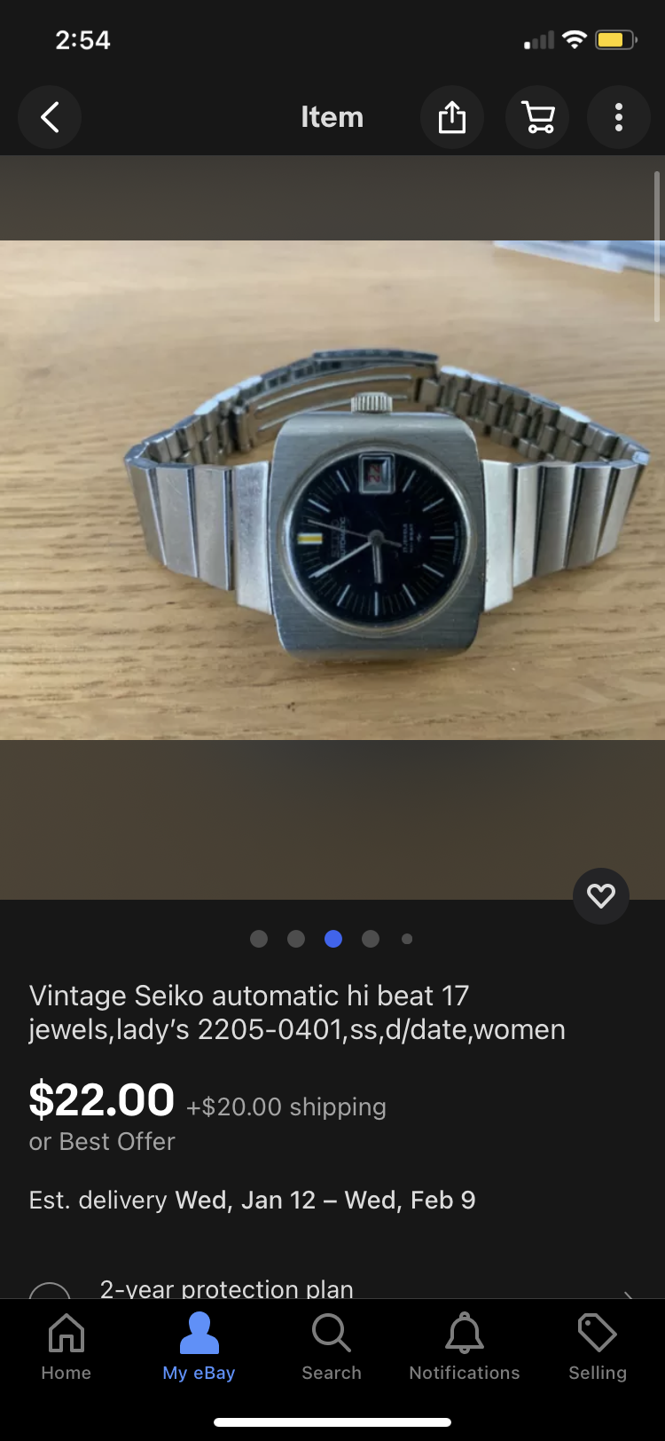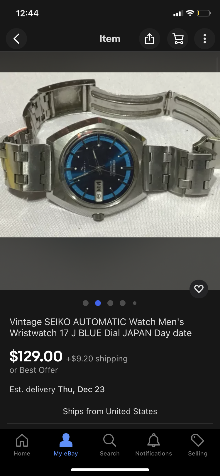 Stainless Seiko with an awesome two-fine blue dial and geometric case. Seller doesn’t say bracelet size and doesn’t specify if running but second has moves position in the pics. Finishes look to be intact- this thing will really pop after a clean-up. Has make offer so may be able to get it around $100.