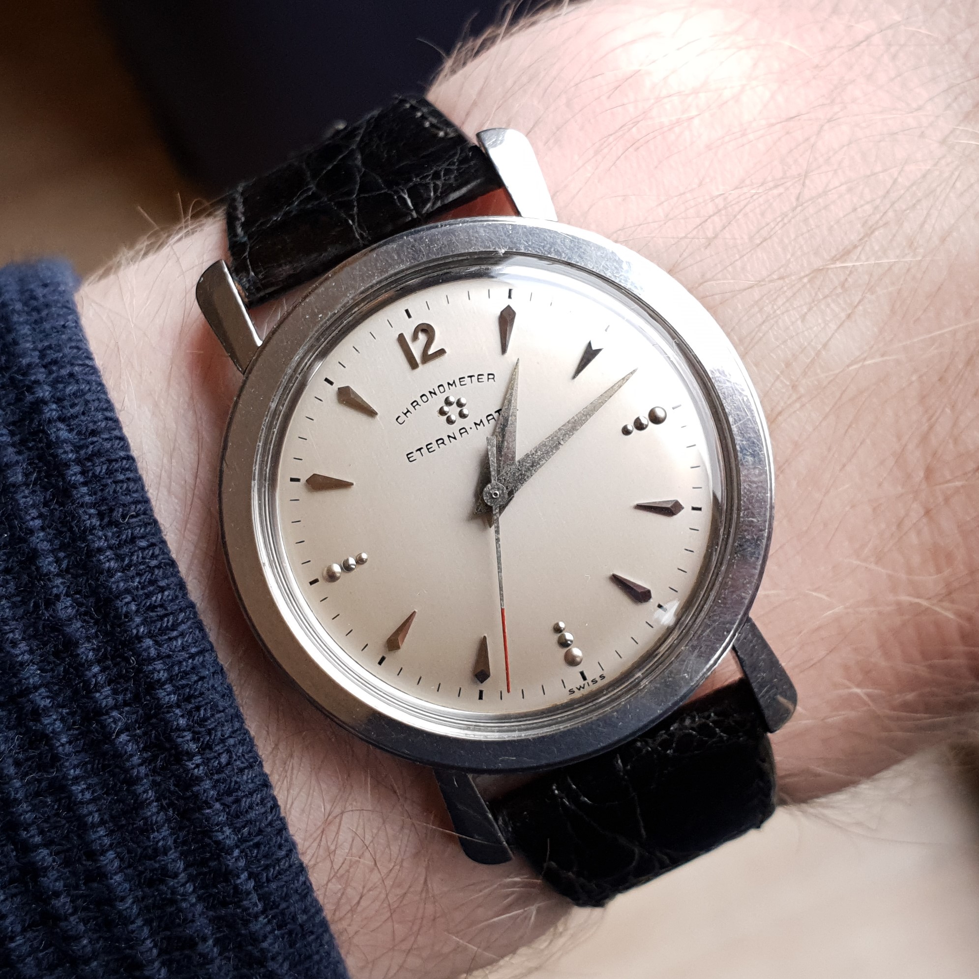 Spectacular stainless Watches of Switzerland Seafarer in EPSA compressor case. Silver sunburst dial, nice little lume pips, original cross-hatched crown, and the back engraving is razor sharp- this looks about as honest and “unpolished” as they come. Date stamp is 1962, and these compressor cases wear beautifully (I know @Bill Sohne has a thing for these). Price is spot on for a high quality Compressor in great shape.