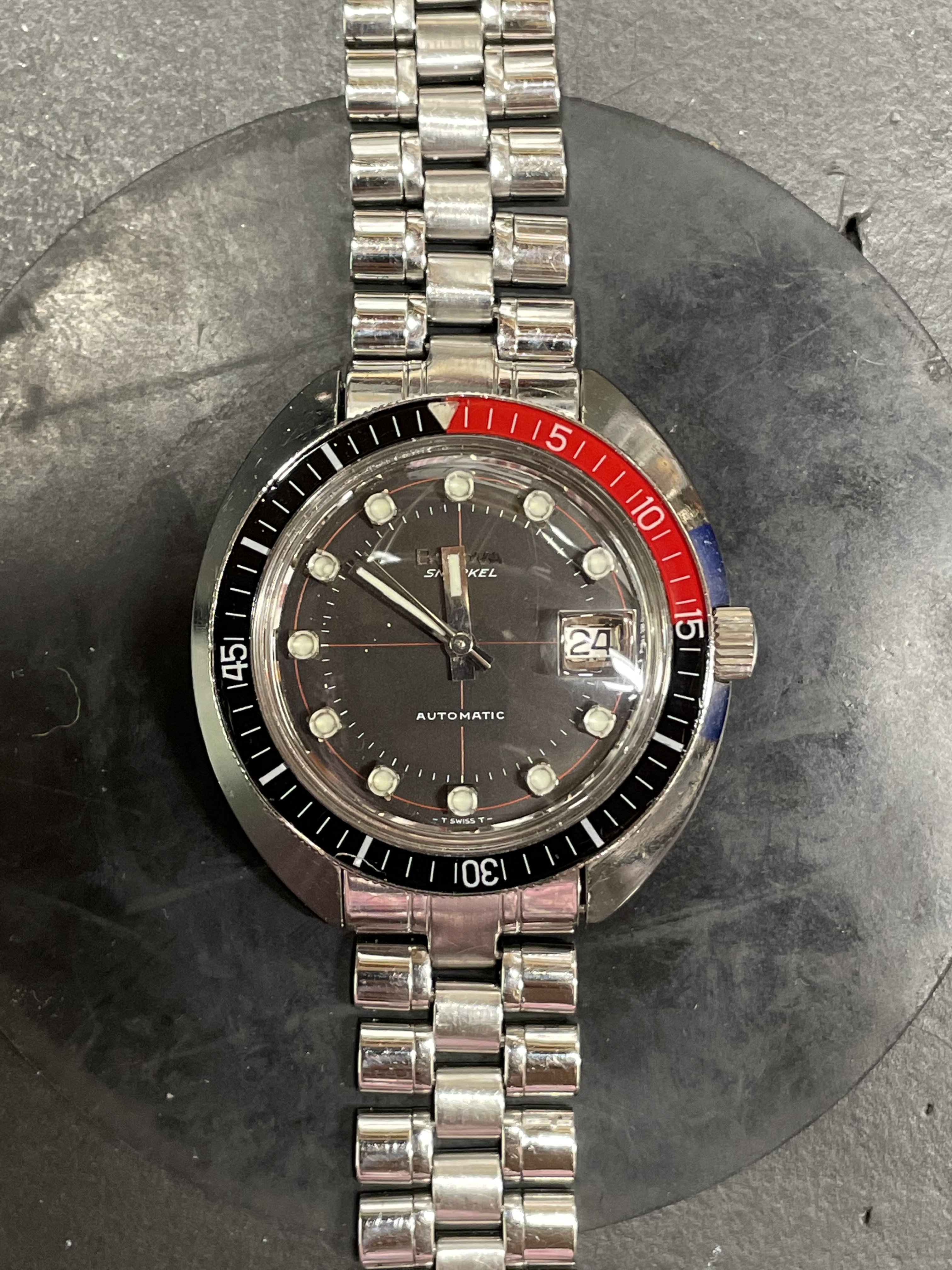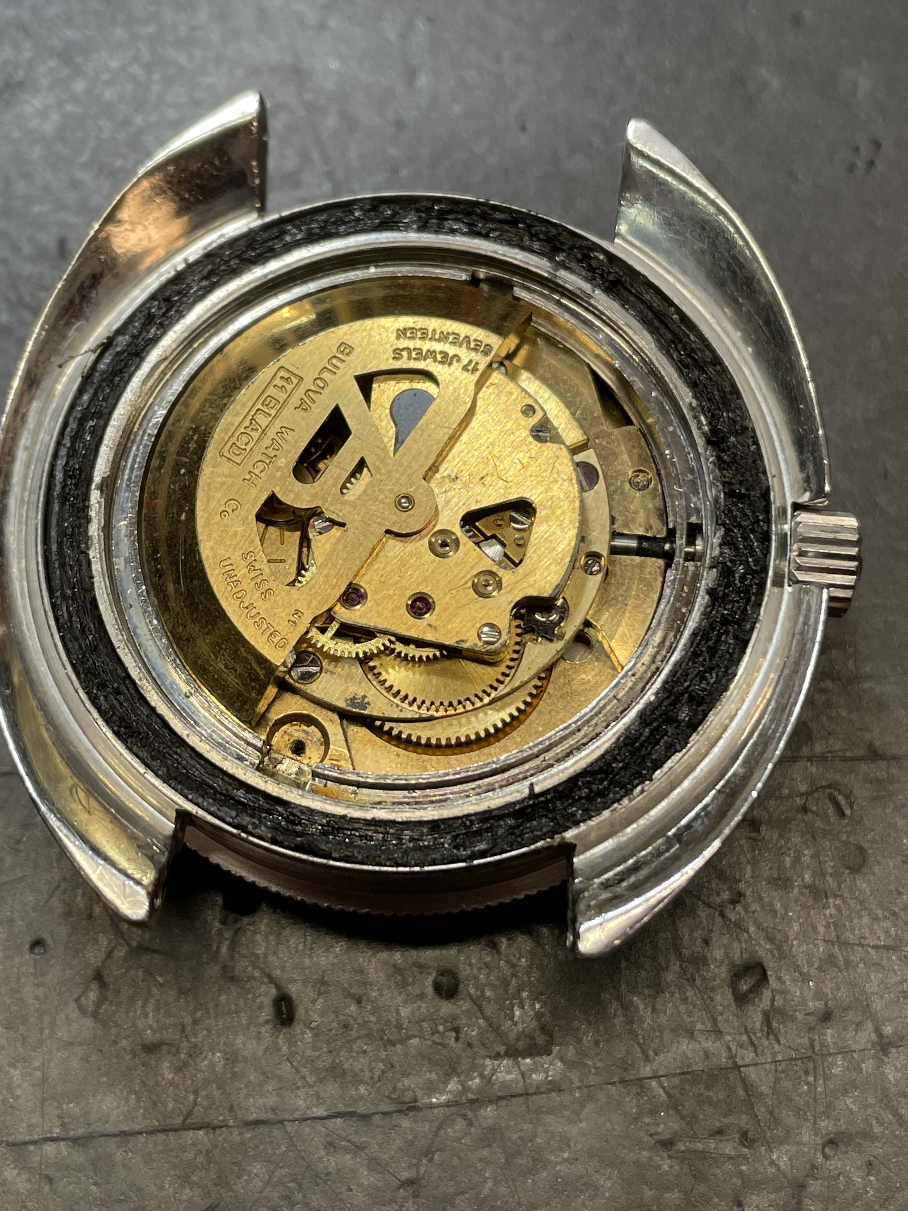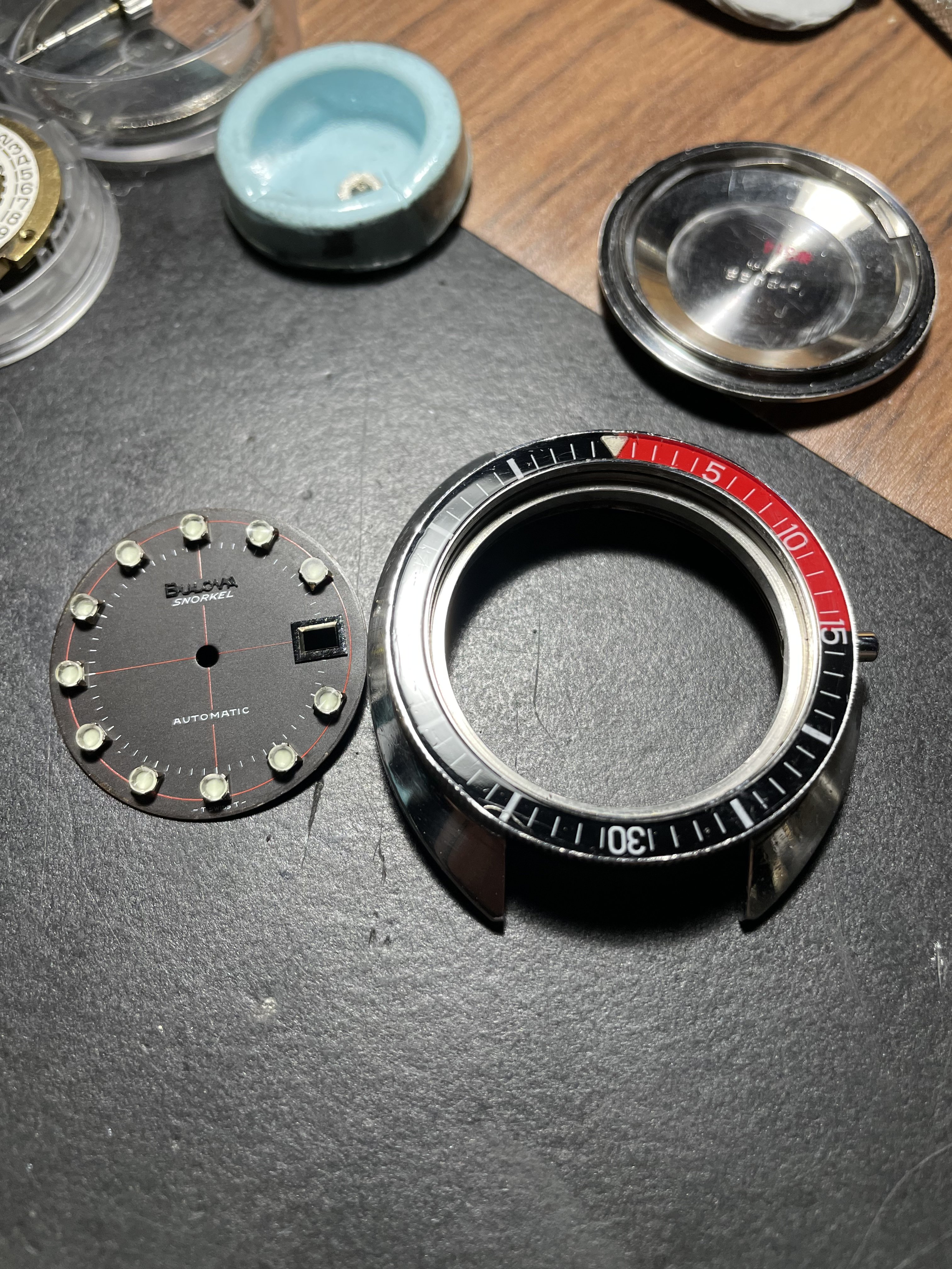 The bracelet was stretched out and bent up, the crystal was so crazed you could barely see through it. The crown had been replaced with an Accutron crown (most likely from the 702 Deep Sea), but the bezel was crack free, case had sharp lines and I luckily had hoarded parts for these, so knew going in I had what I needed provided the bones were solid.