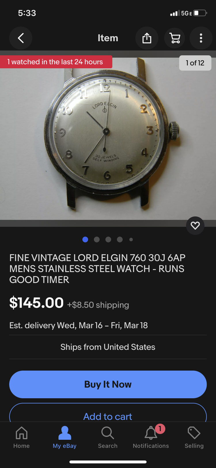 A truly rare bird, Stainless Lord Elgin 760 auto- one of the very few made in USA automatic movements. This one is particularly clean and a lovely example. seller says running well and 36mm with crown so assume 33-34mm. If I were still collecting this style of watch, I would grab this.