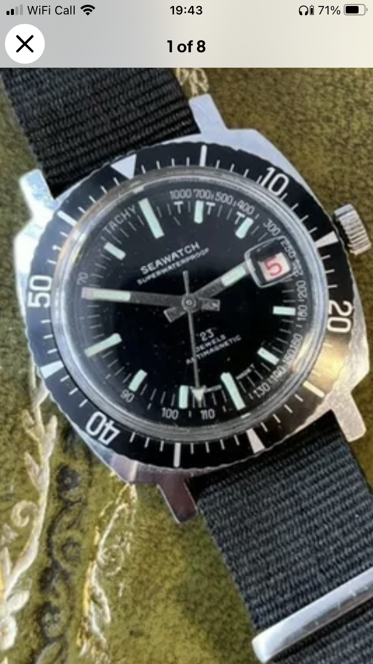 I do love the cushion case, plating is in nice shape, red date wheel with cyclops. The tachy scale is funny though…it’s a diver!