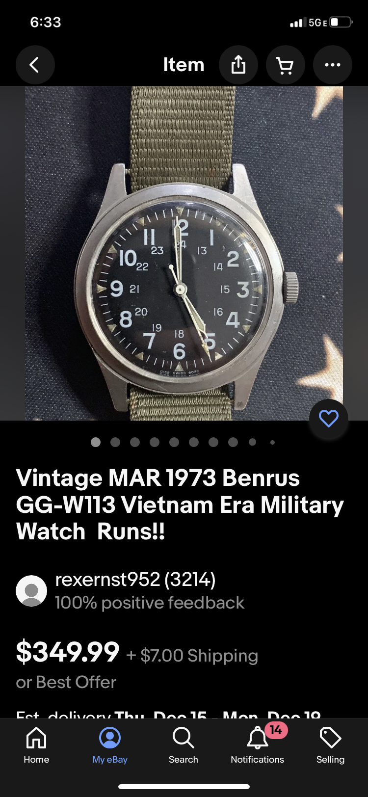 1982 Hamilton GG-W-113, this is the hacking pilot watch. Lume on the dial and hands looks spectacular- usually these are pretty ashy. Case looks decent but pics suck of course. Not sure on crown- it doesn’t have the step like mine does but I have lost track of what’s correct and what’s not for crowns on each marker/generation. Seller doesn’t mention running but condition is listed as good and working so there is recourse. Strap is whatever it is, original military 16mm OD straps (yes, 16mm was correct even though the lugs are 18) are available on eBay for a Jefferson.