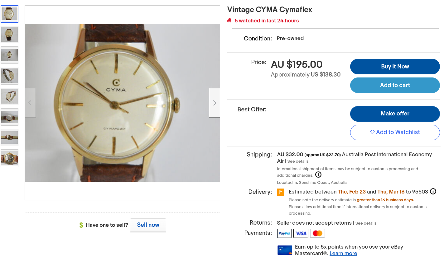 ·Nice gold plate 35mm case, thin hand winding Cyma $195AUD = $138USD. Make an offer.