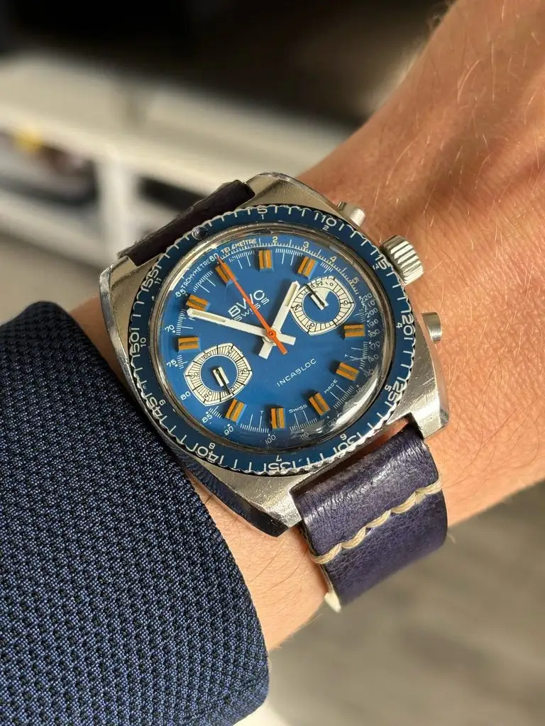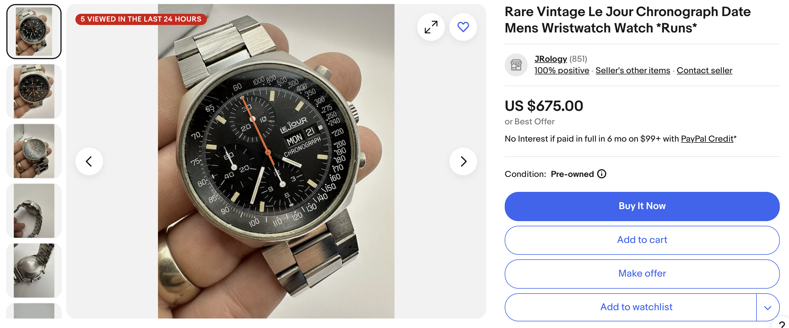 ·These LeJour chronos are cool and sturdy, with a reliable and easy to service Valjoux 7750 movement. This one runs and seller accepts offers. Perhaps a nice deal to be made.