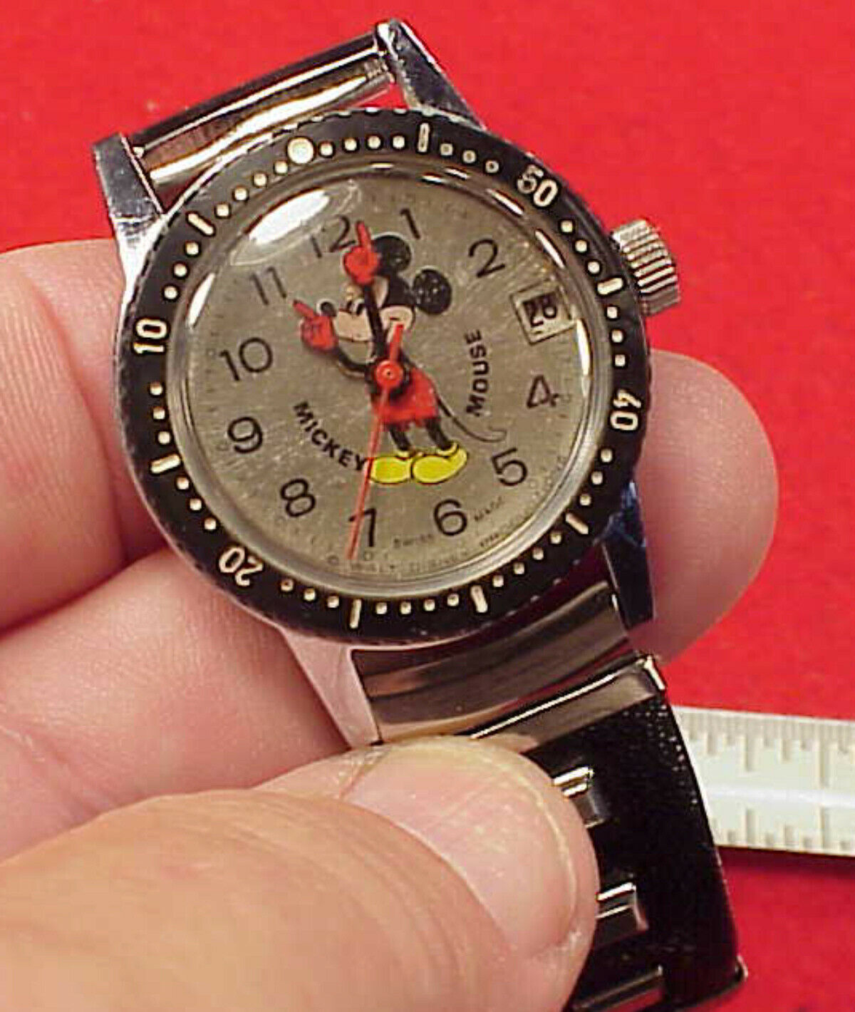 New to me: a Mickey Mouse dive watch. Also new: the bezel numbers run counter-clockwise. Decent size and great shape, though.