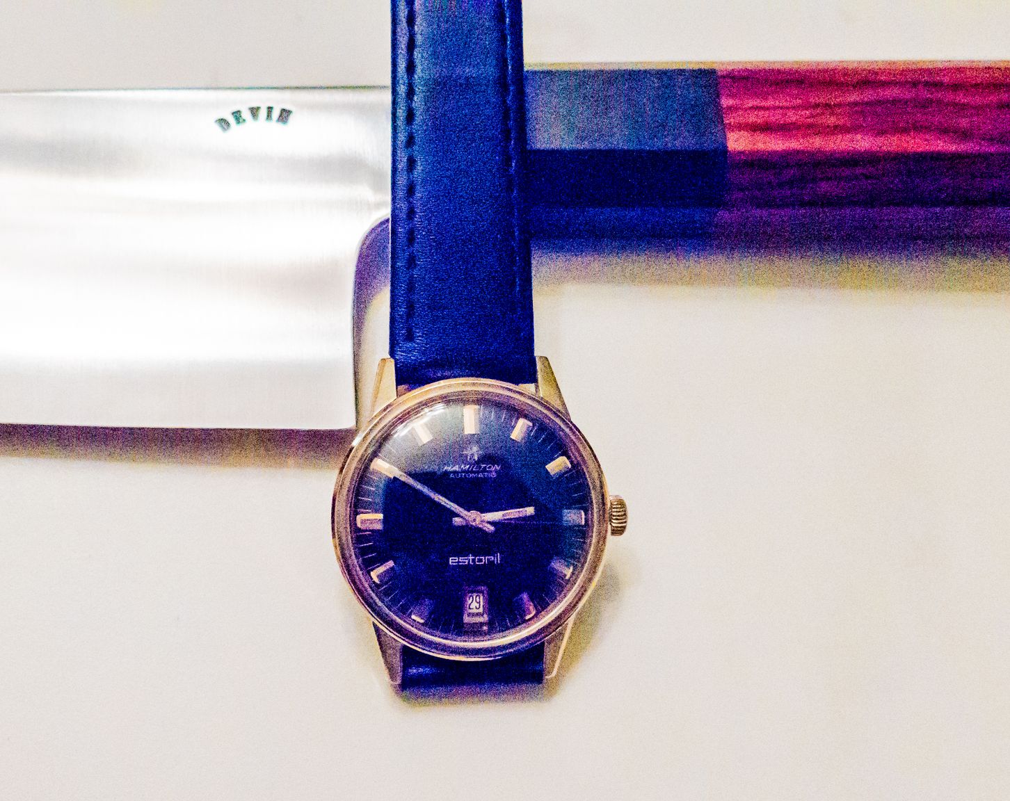 Right out of the box I was unable to wind it, so I opened it up. Turns out the seller, after taking the movement shot, had replaced the retaining ring incorrectly so it pushed against the stem. I fixed that and it wound easily. Timegrapher performance was poor (+225 s/d), so I spent some time adjusting it and got it to +1 s/d. Amplitude is good at 270. There was a large piece of lint on the dial, so I removed the watch from the case and blew off the dial. The dial is 100% flawless, and the markers gleam as though it came off the line yesterday. A quick buff of the crystal and it's ready to rock. Shown below with a gratuitous Devin Thomas gyuto.