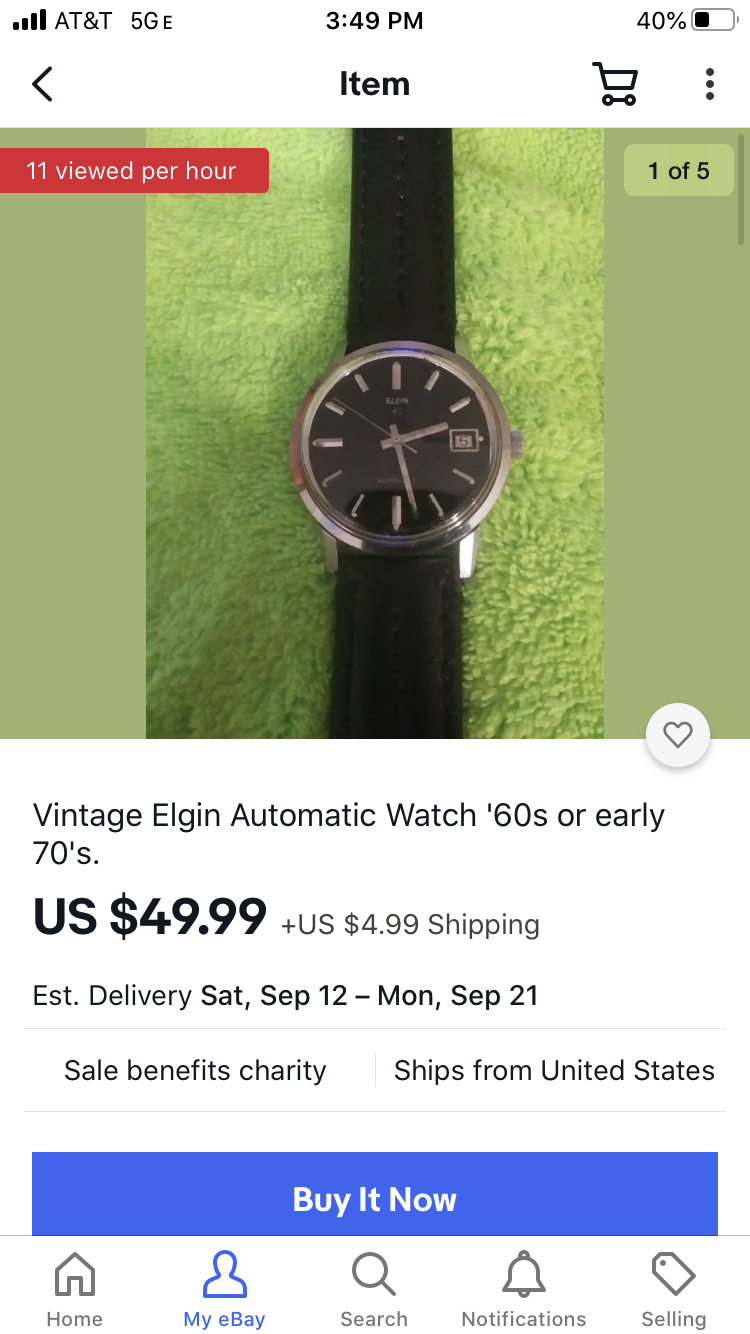 ·SS Black dialed Elgin. Pics suck but lume looks bright on both hands and pips, can't make out the dial condition but considering the sharpness of the case and the bright lume, probably excellent. Also proceeds go to charity.