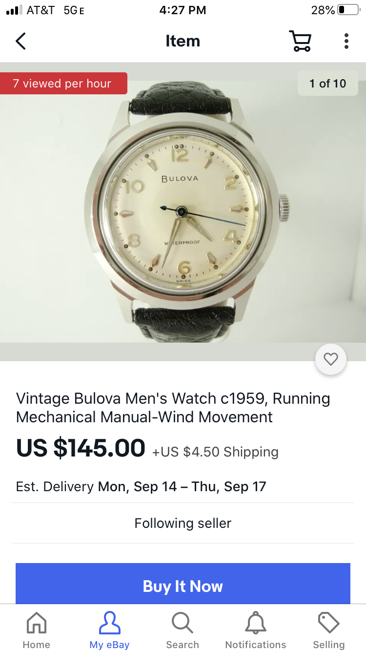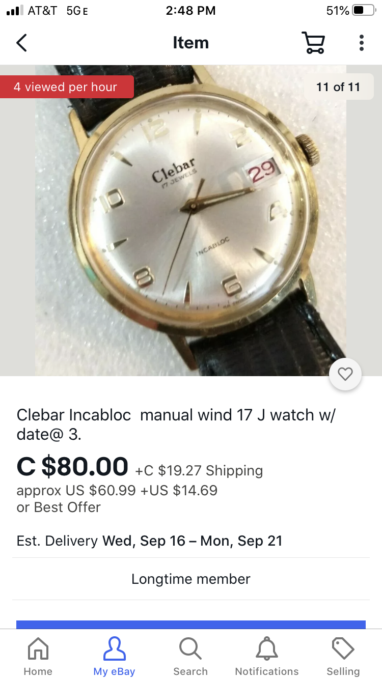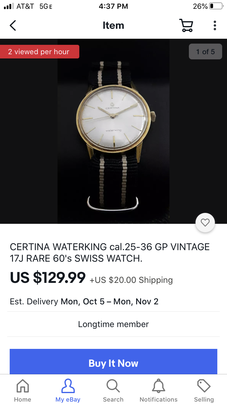 Another Certina- GP looks to be in nice shape and has taken on a tarnish- would probably shine up with a Cape Cod cloth. Dial looks excellent with lume pips intact, factory crown. This is a smart looking watch. Seller has other goodies, check them out.