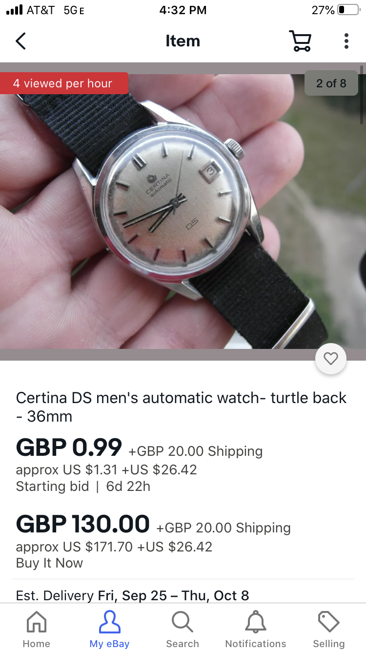 Lovely Certina DS with turtle back in the UK. Dial has slight water damage at the bottom, if it didn't I would have already bought this. Case is sharp, lugs are awesome, crown is original. The patina is far less than we normally see on these and price is better than we usually see.