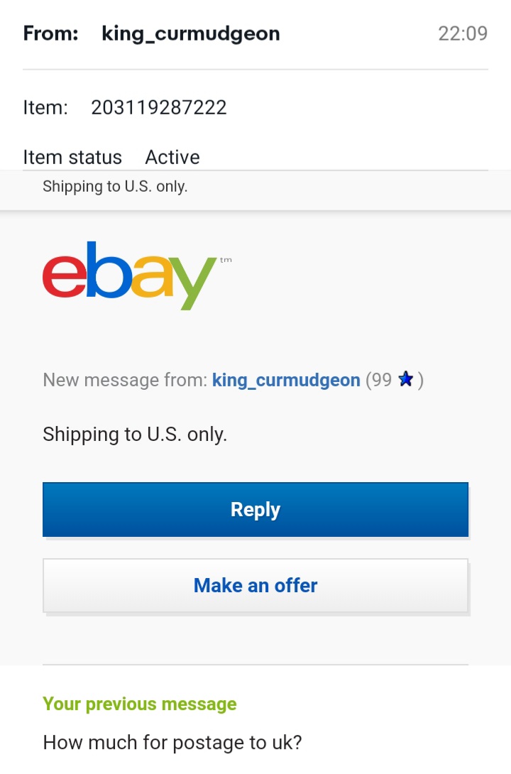 He is clearly confident he will sell this. Just tried to put in a bid but he has refused to ship to the uk 😕