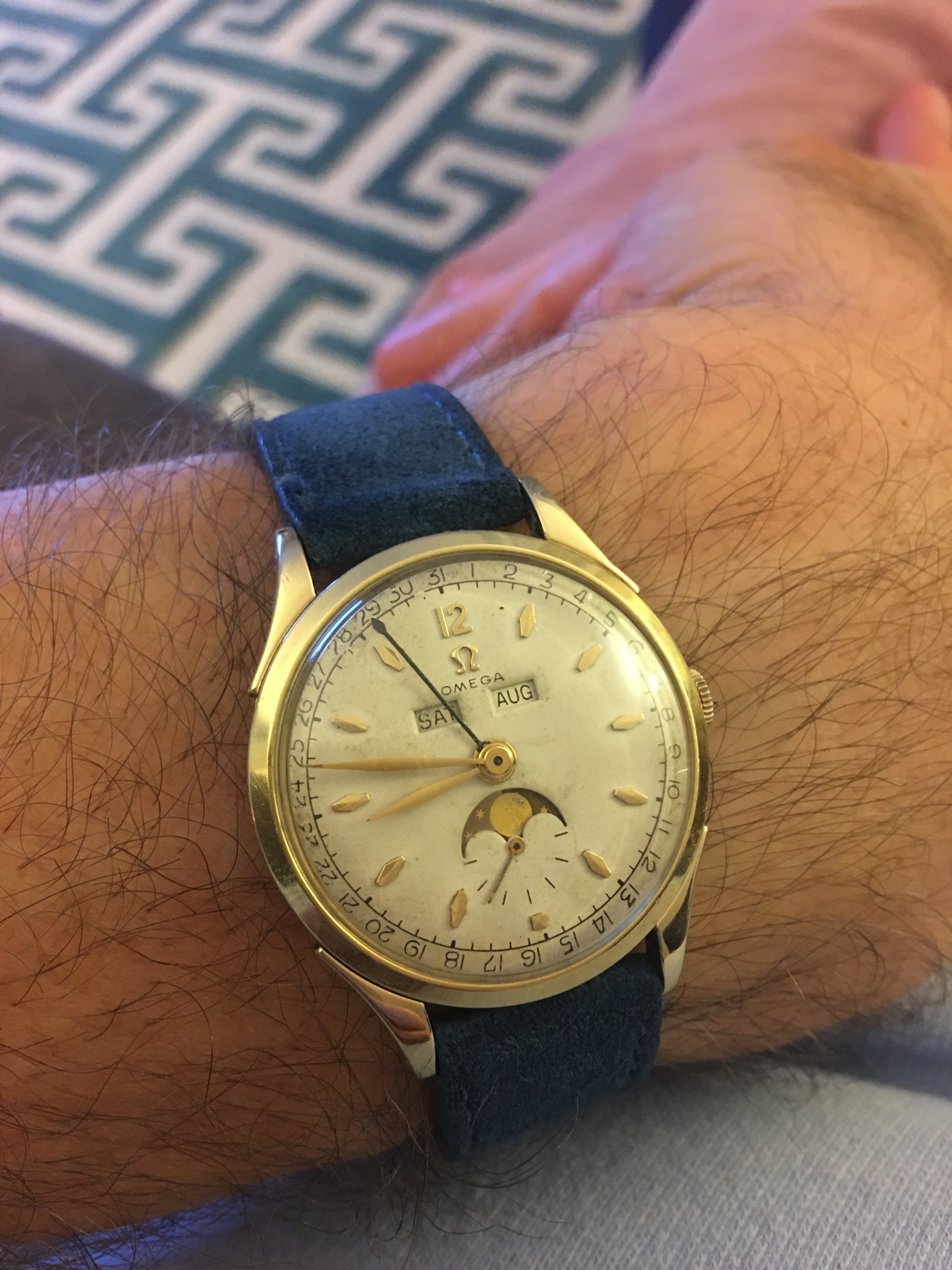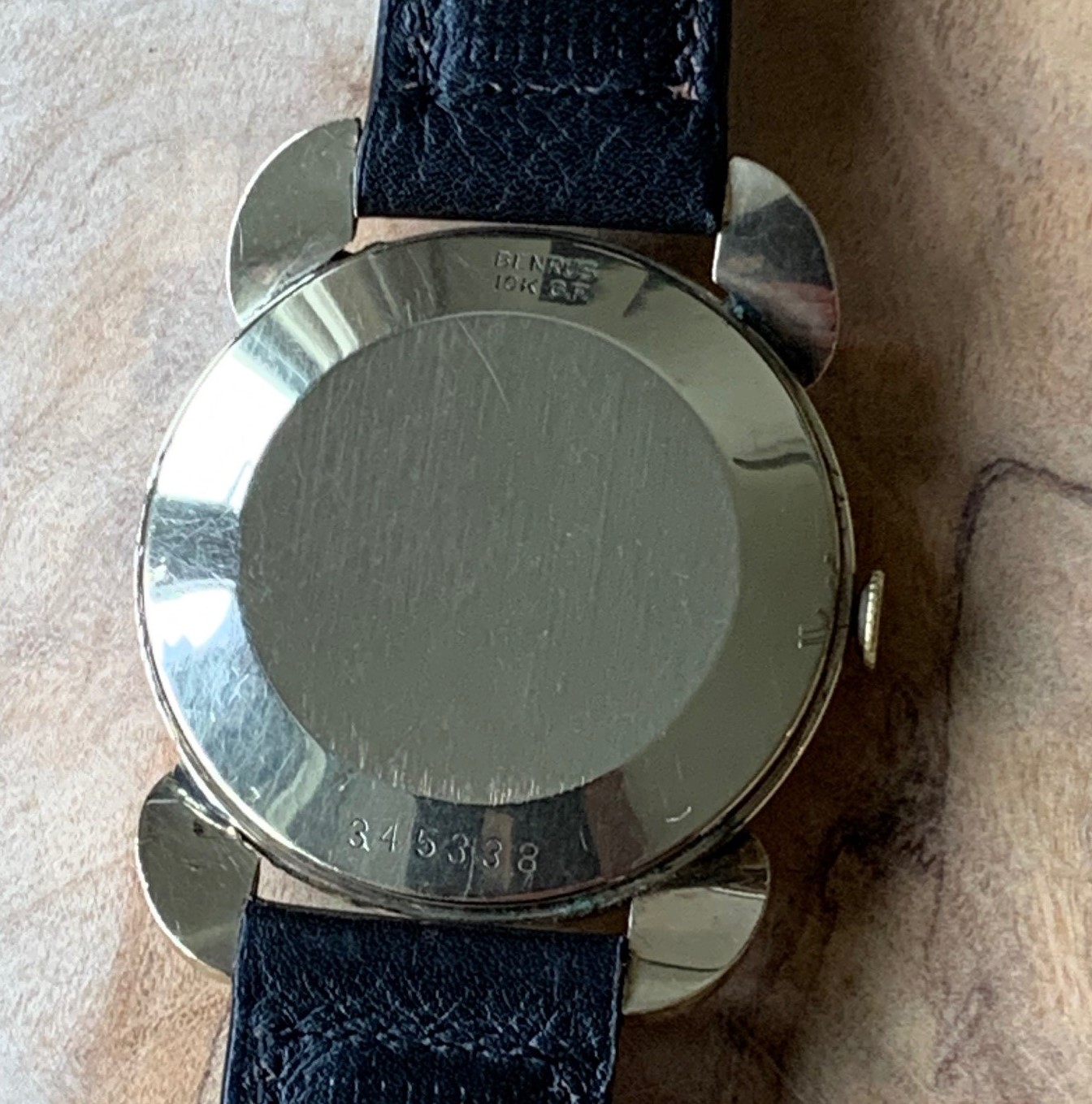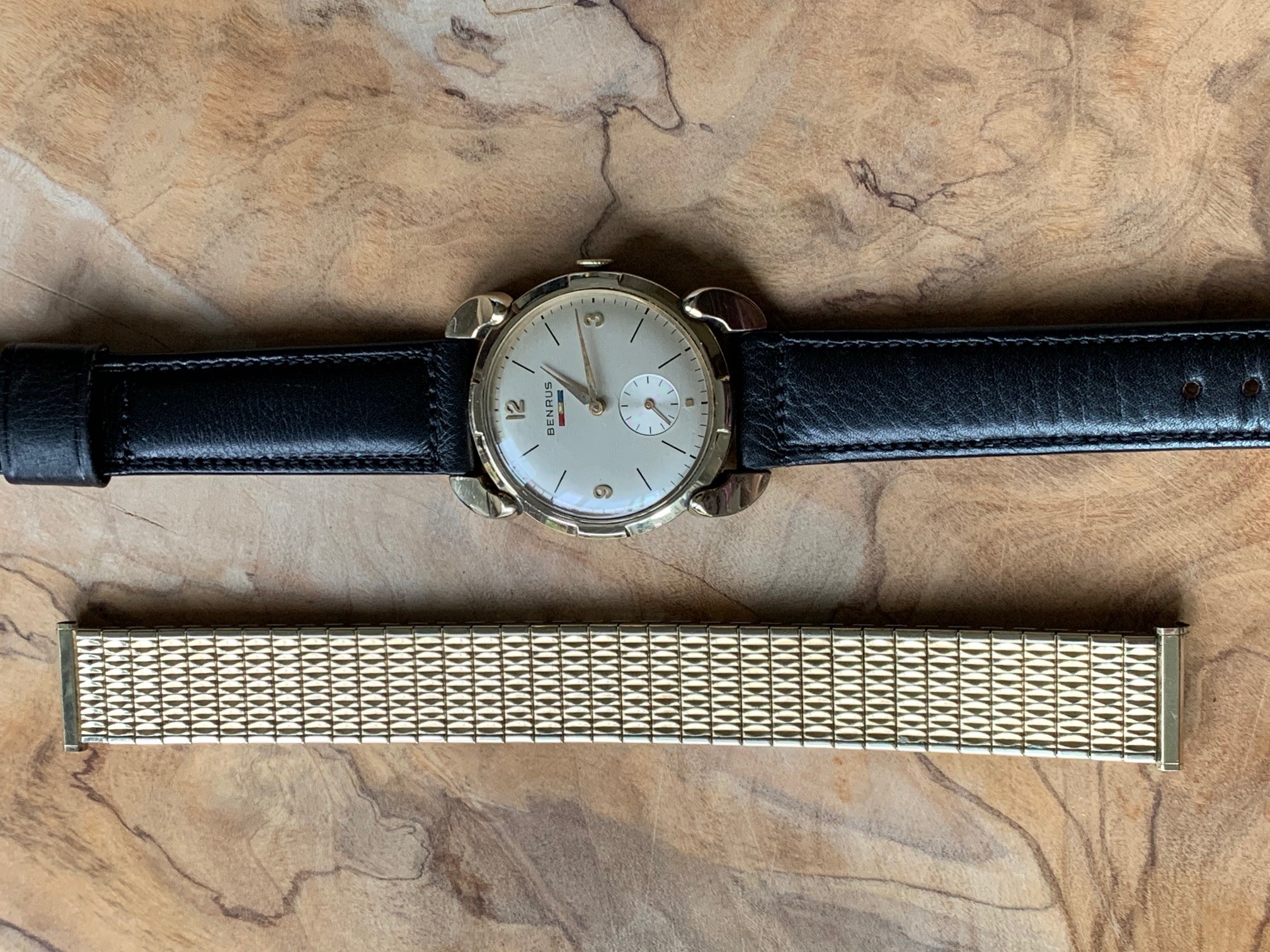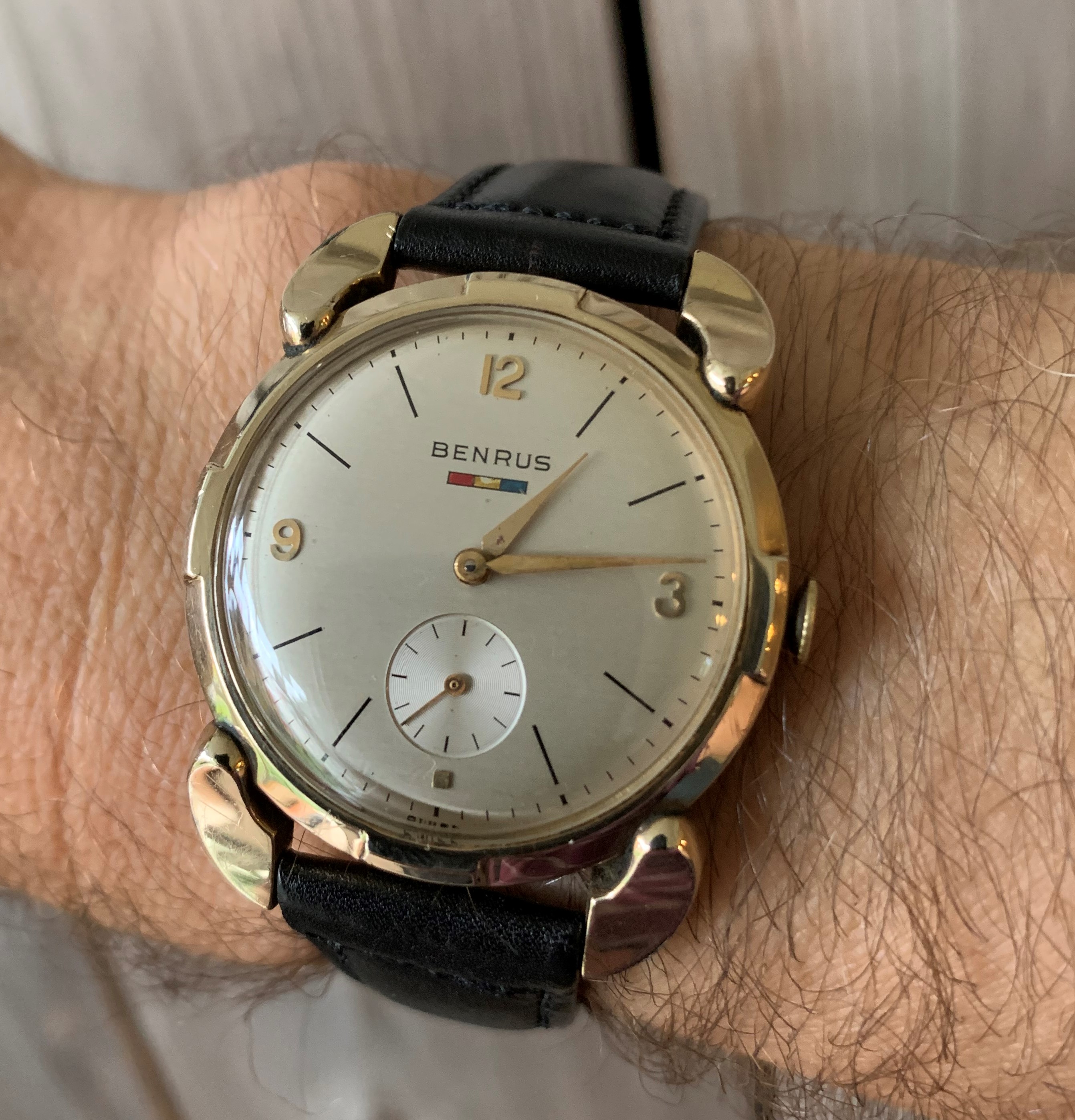 And this, this is some circa 1950’s chutzpah! 😎 This Citation-line Benrus is front and back 10k rolled gold, complete with the original flex band that is also 10k RG on the top. These stretchy bands are so so comfortable, but like so many people nowadays, I am not a fan of the look 🤮 I’ll store the band away for some later day or owner. It is powered by a 17 jewel Benrus BB 14 movement, which I believe is an ETA 900. At 34mm w/o the crown, it actually wears quite large on the wrist - that's what you get with 43mm lug to lug. I’ve put it on this 18mm vintage Bulova strap for now. It's a kooky look, and I am absolutely in love with it. I do wonder what demographic was the target audience for these fancy lug watches ☕