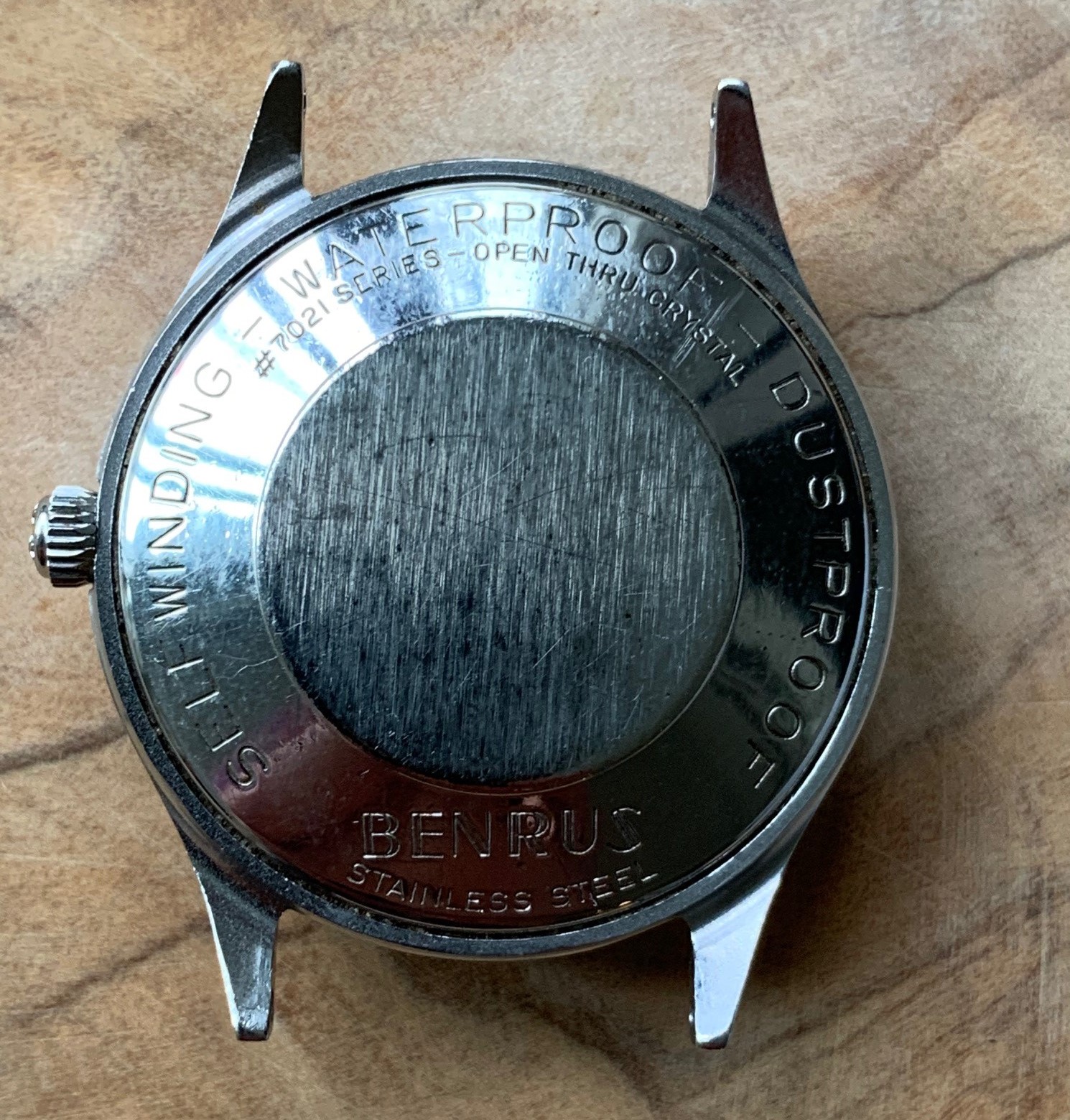 The all-steel three star Benrus is a handsome piece with an interesting number arrangement on the dial. It’s small at 31.5mm w/o the crown, so I’m going to make a bund strap for it similar to the one @Alpha gave me, but in 16mm. Since it’s a front loader I’m not able to open it to see inside, but it keeps very good time. Dial is amazing, just a mark under the crystal at 2:00 I can't get at, and dang I see I have somehow scratched is at 9:00 👎. Thanks again to @JwRosenthal for the logistical assist!