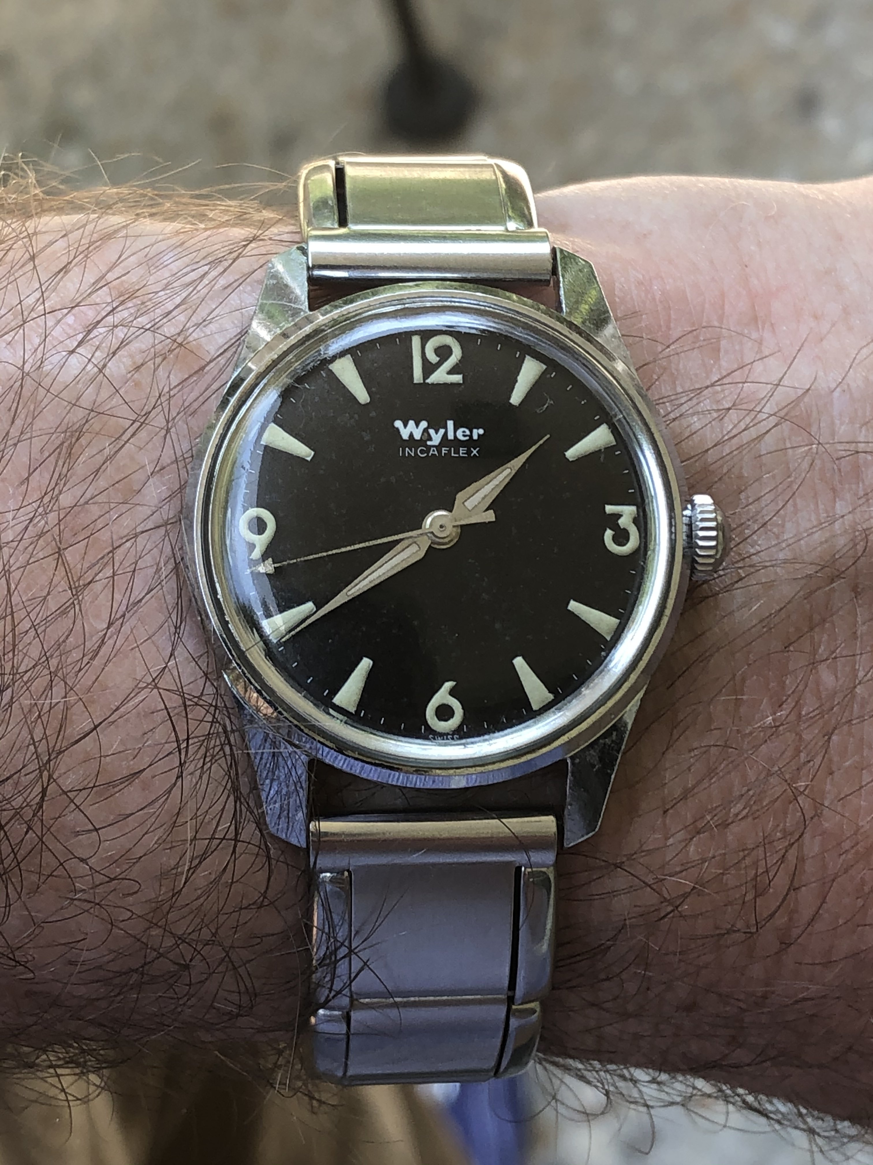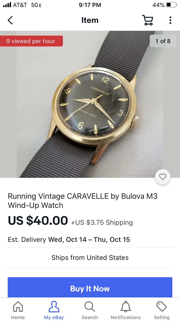 ·Black dialed gold plated Caravelle. This is a very pretty watch with the coffin markers- crystal should clean up with a wet sand