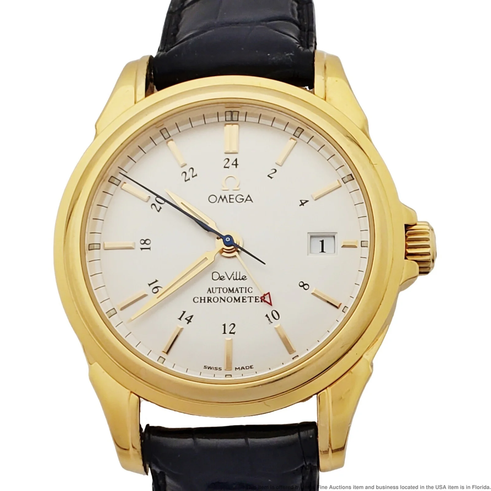 A rather rare De Ville Co-Axial GMT In 18K Solid Gold going no reserve, a very good value all-gold dress watch that will likely go cheap