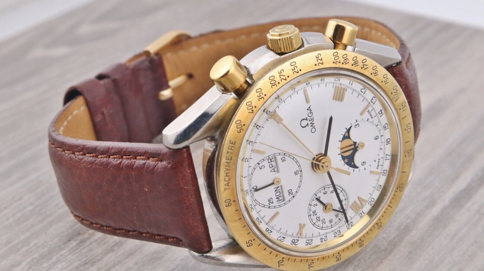 Really nice condition Speedmaster Triple-date Moonphase in two tone on strap going no reserve. Great accurate complicated watches.