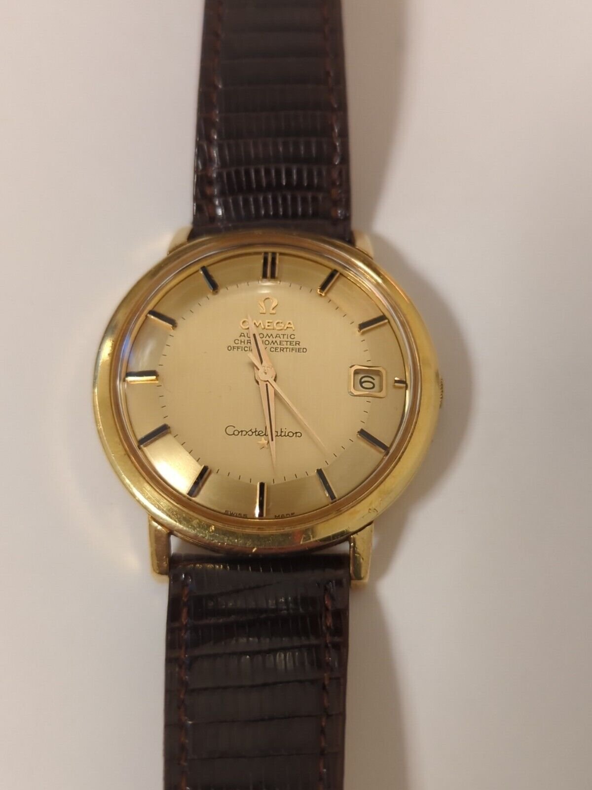 18K solid gold Constellation pie-pan deluxe 168.005/6 dogleg, has has had some polishing but not too bad, dial is very nice