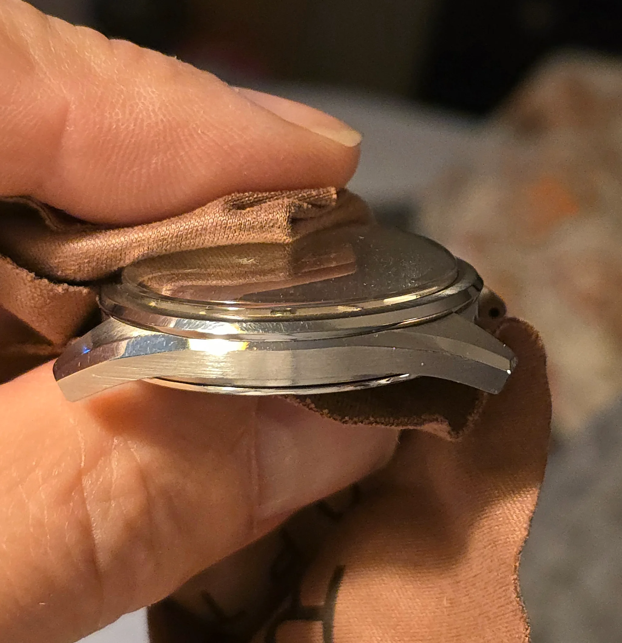 The watch is very good, worn as expected,but with strong edges and intact brushing. As delivered, it had plenty of DNA and some crystal swirls.
