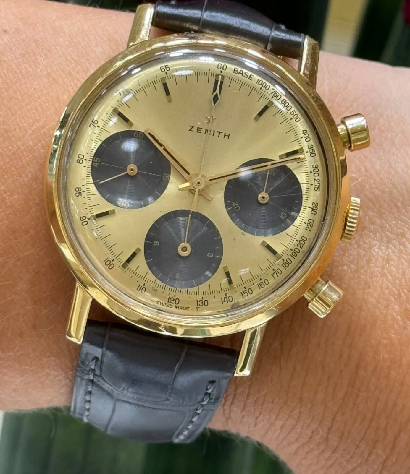 Posts 54 Likes 20 WoundupLA ·May 3, 2025 I’ll jump in, Vintage Zeniths on Ebay are pretty slim pickings these days. Lots of refinished dials and over polished cases.. I don’t buy gold watches but these two caught my eye: