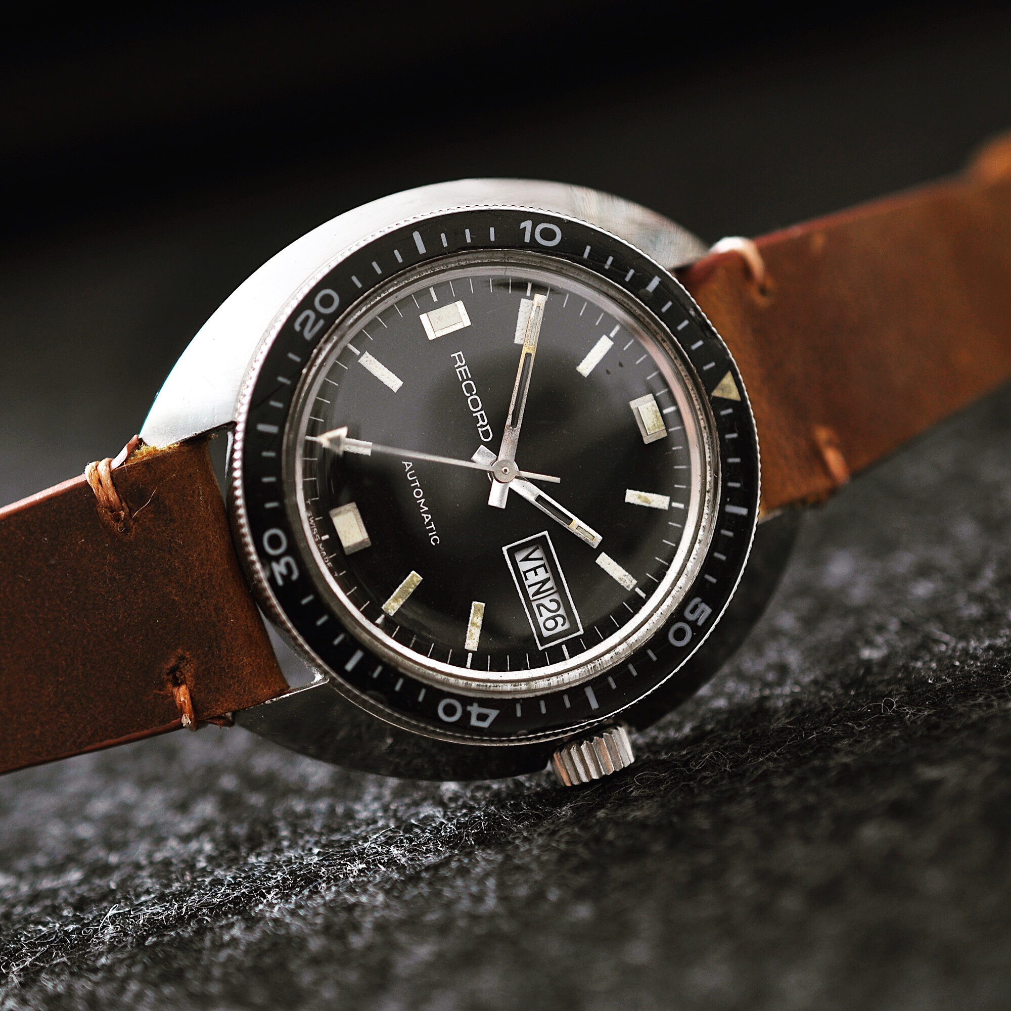 I am selling this nice diver, made by Record. Record was a brand of Longines in the 60s. The shown one seems to be a very early one, since the dial just states "Record". Later ones also show the Longines name on the dial.