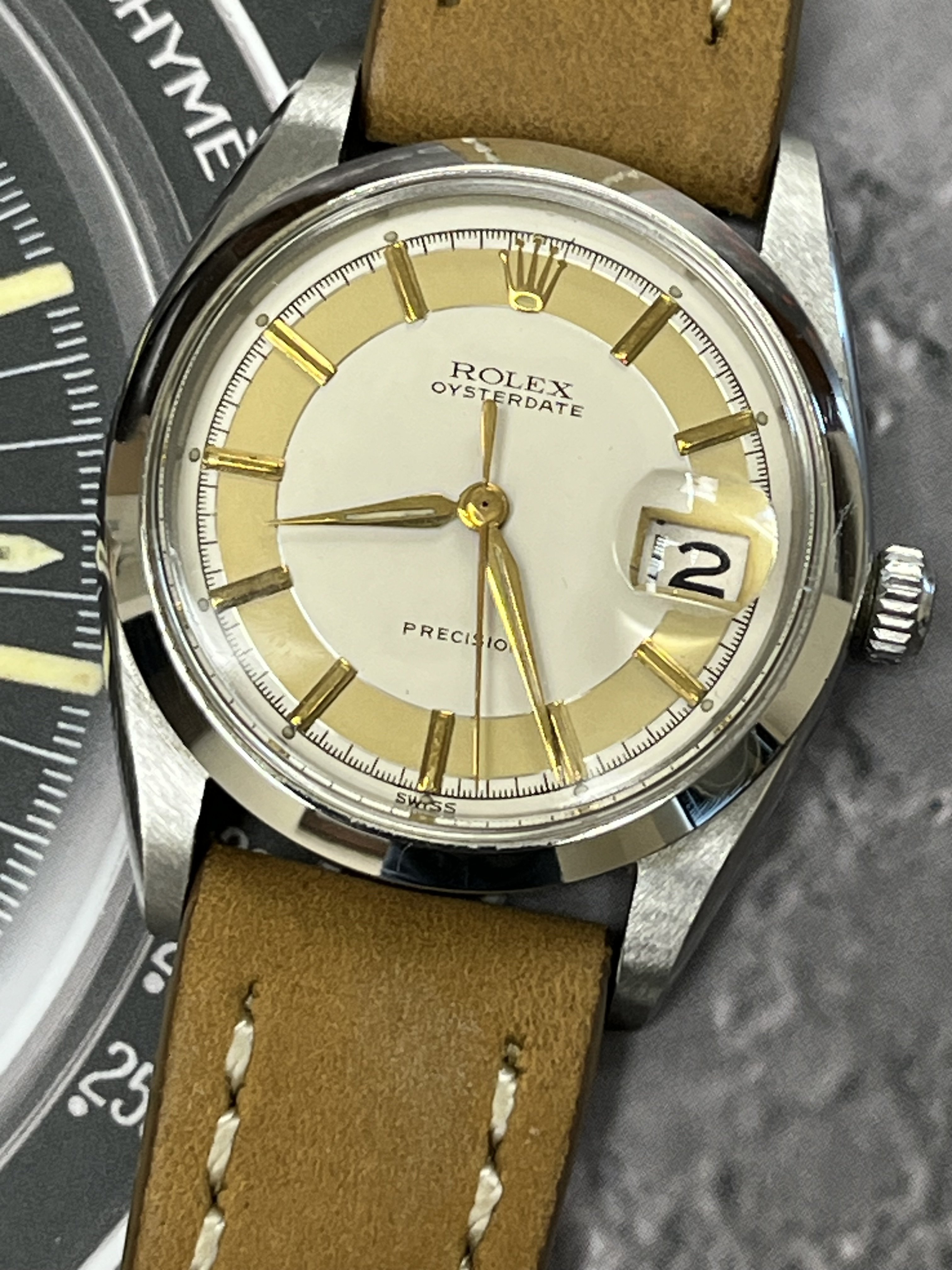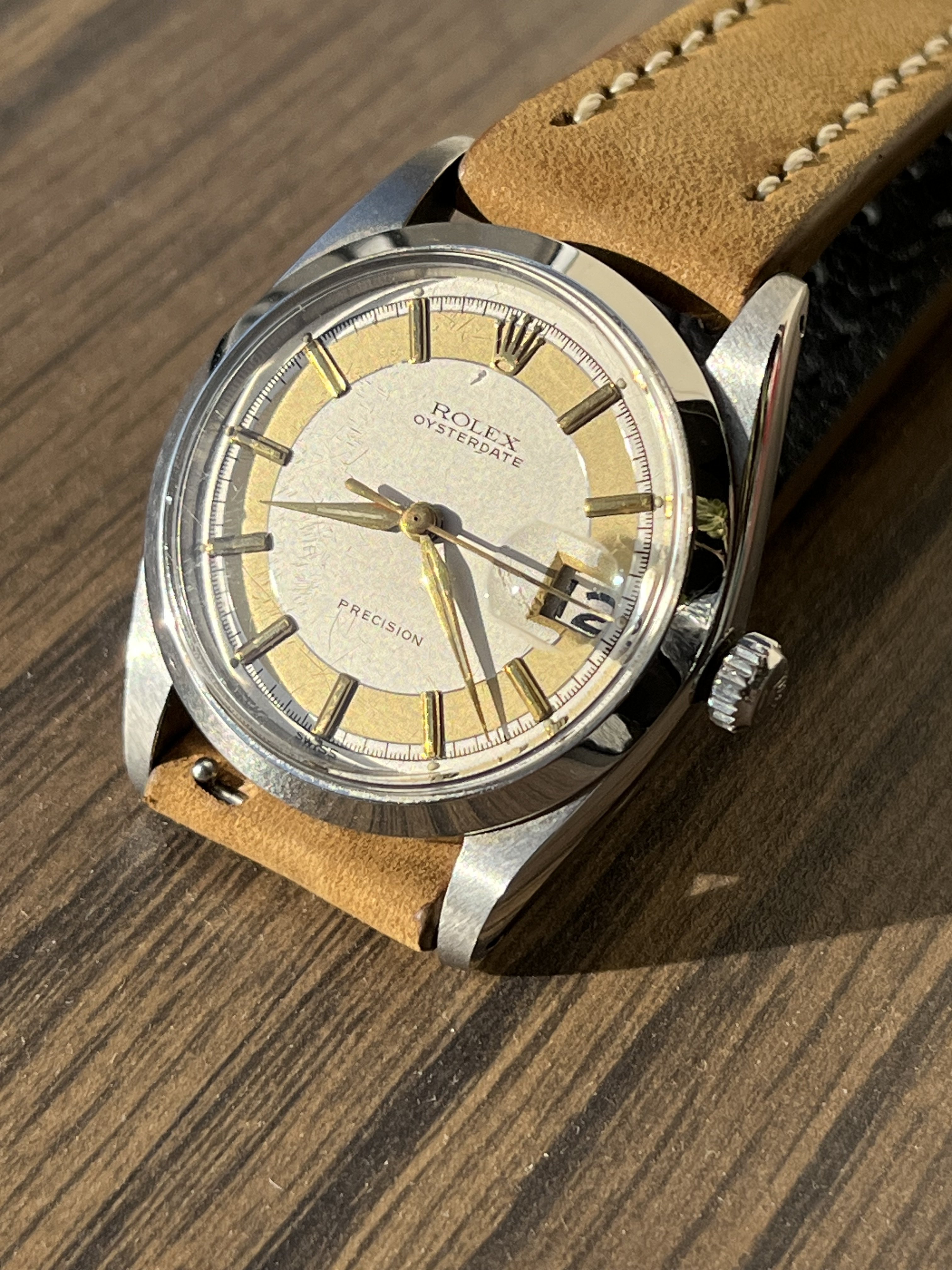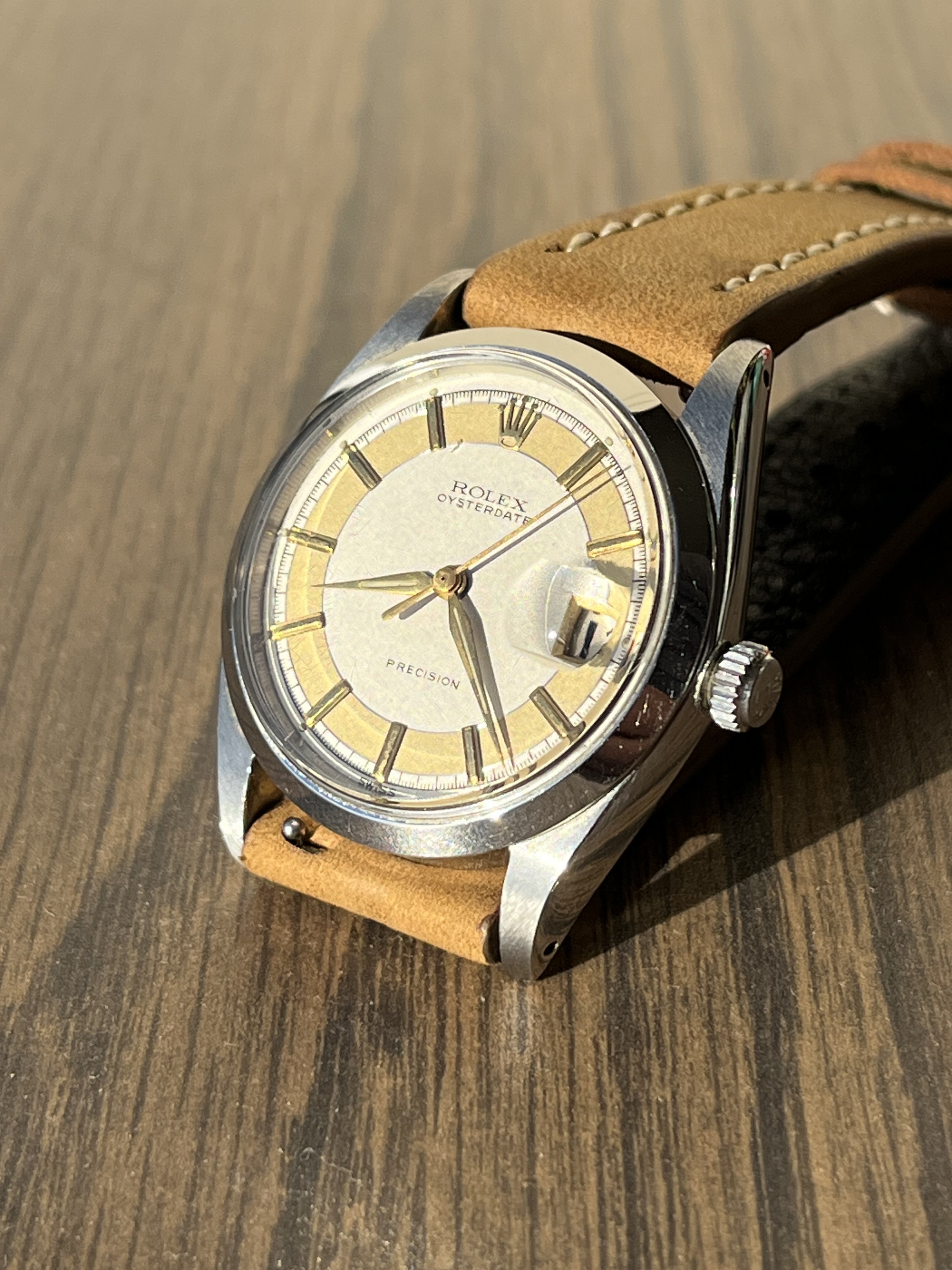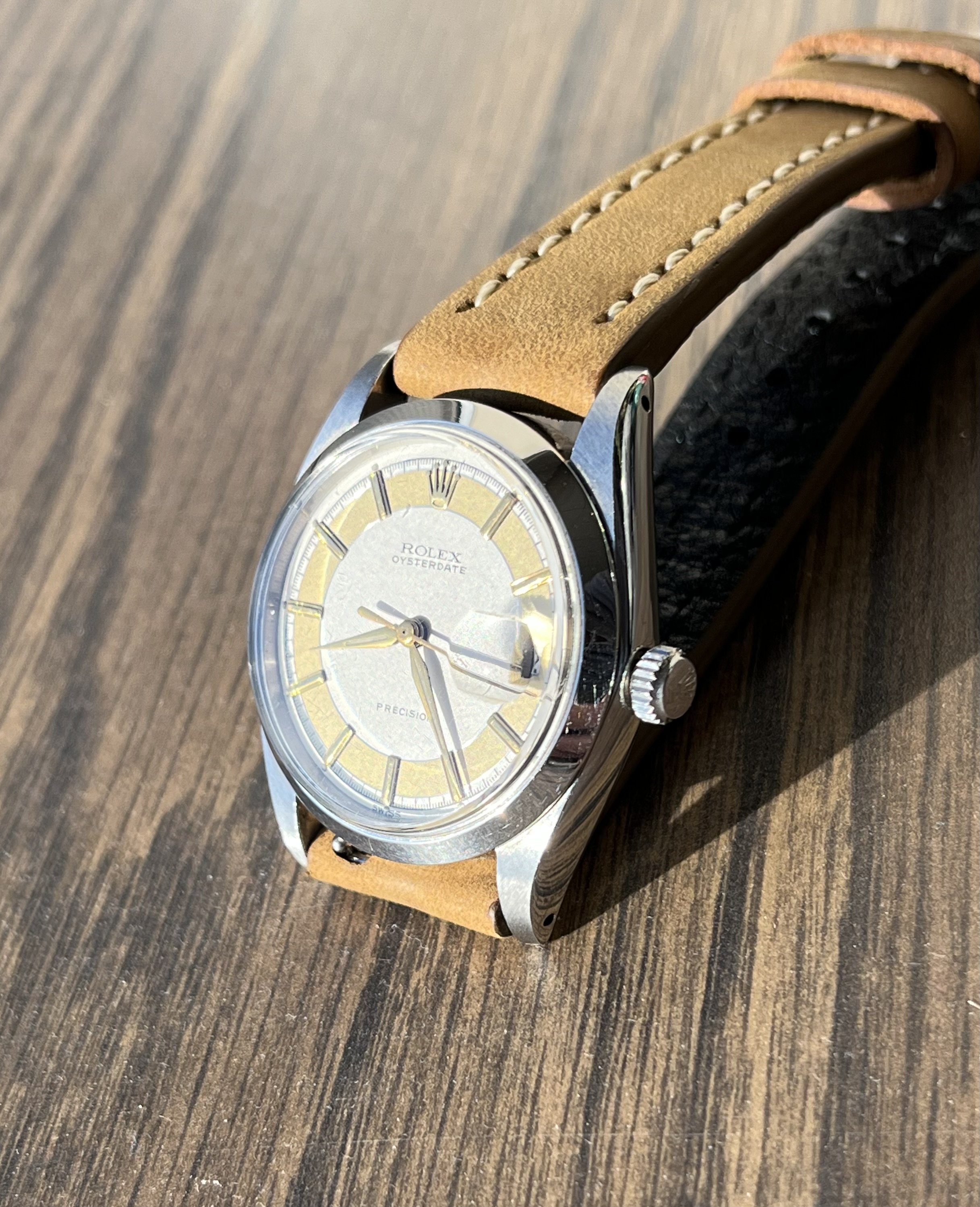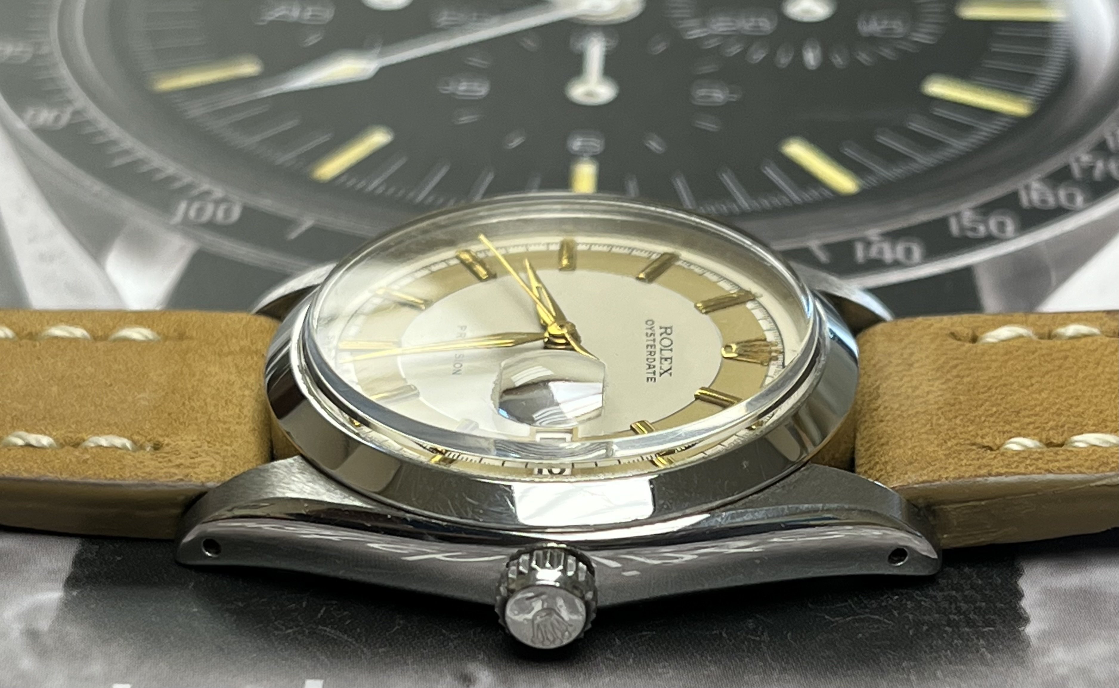 ·Hello up for sale is a circa 1963 Rolex Oysterdate Precision 6694, with an excellent condition case, measuring 34mm. It’s been polished in the past, but the case retains fat lugs and very attractive lines. A Strapsco 19mm leather quick release strap is included in the sale. 1.02X.XXX Serial and writings between lugs are crisp and clear (caseback stamped 6694 II.66). Black date wheel functions properly and is centered in dial window.