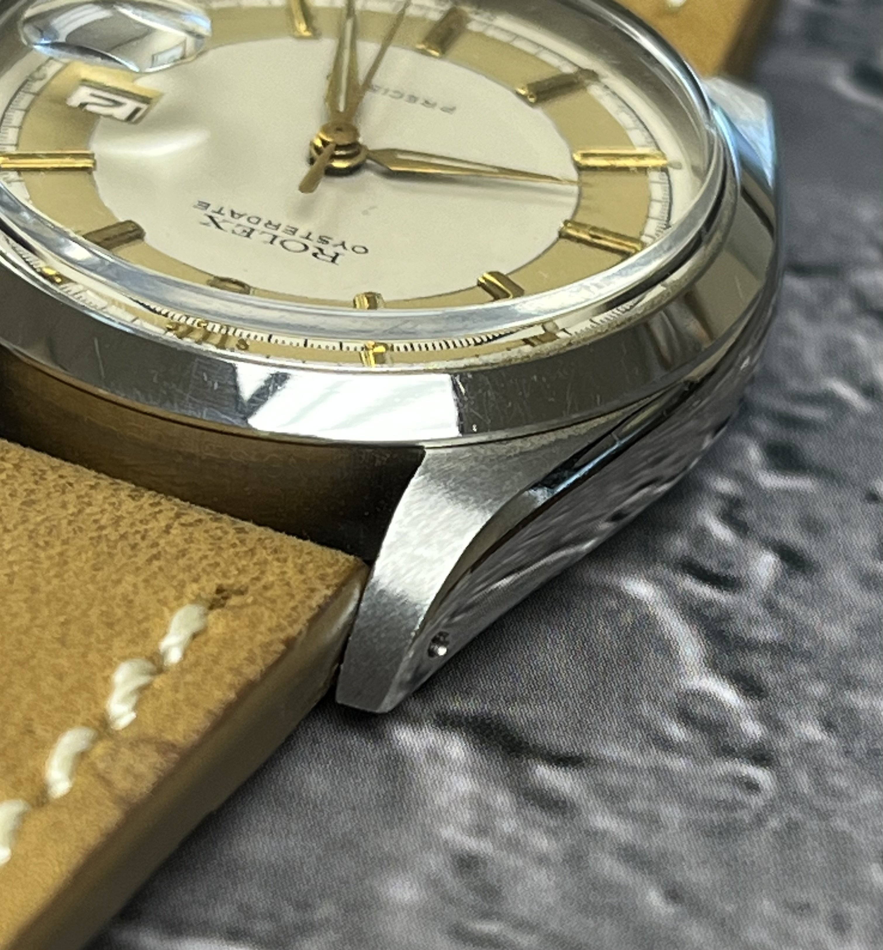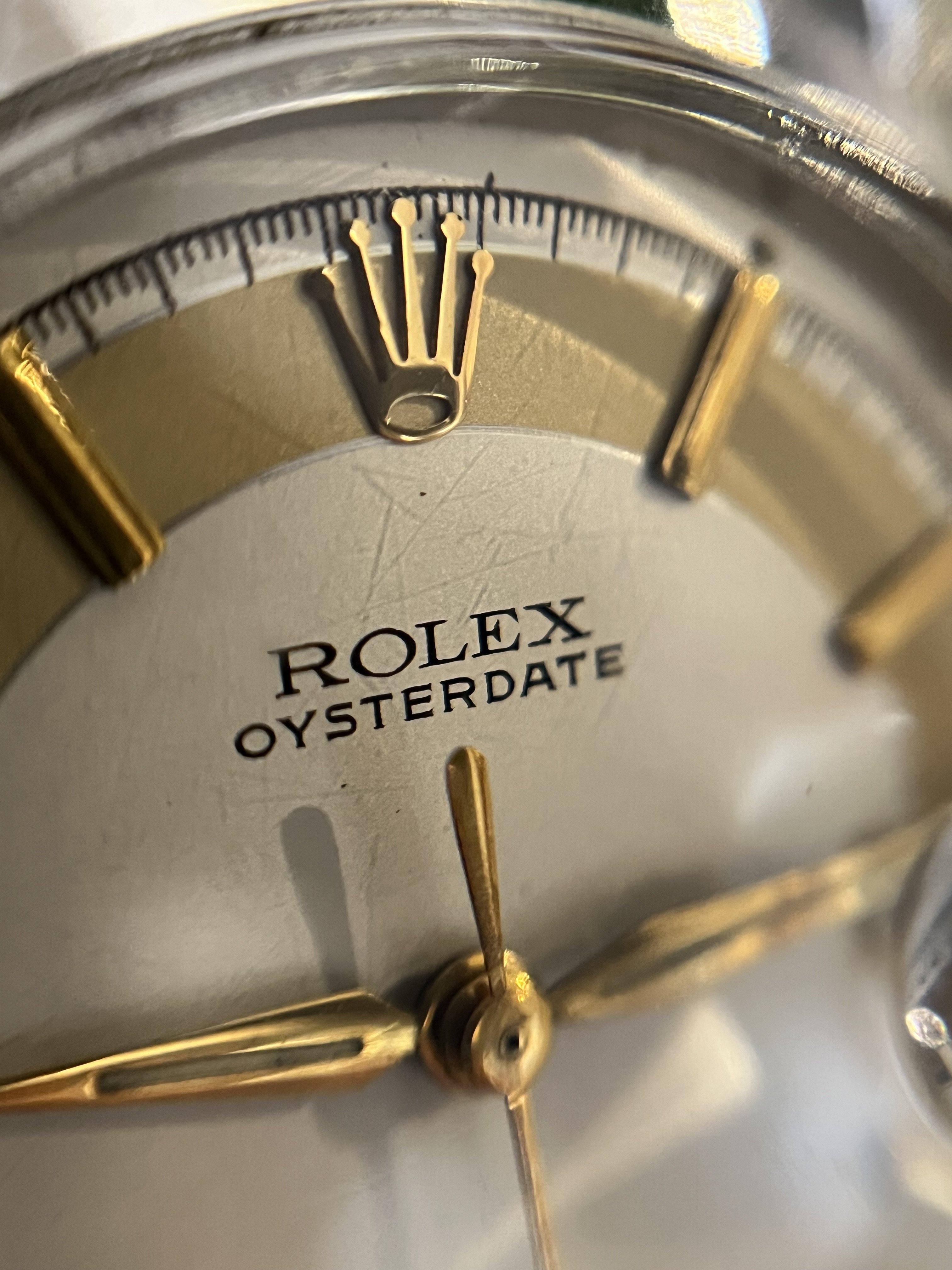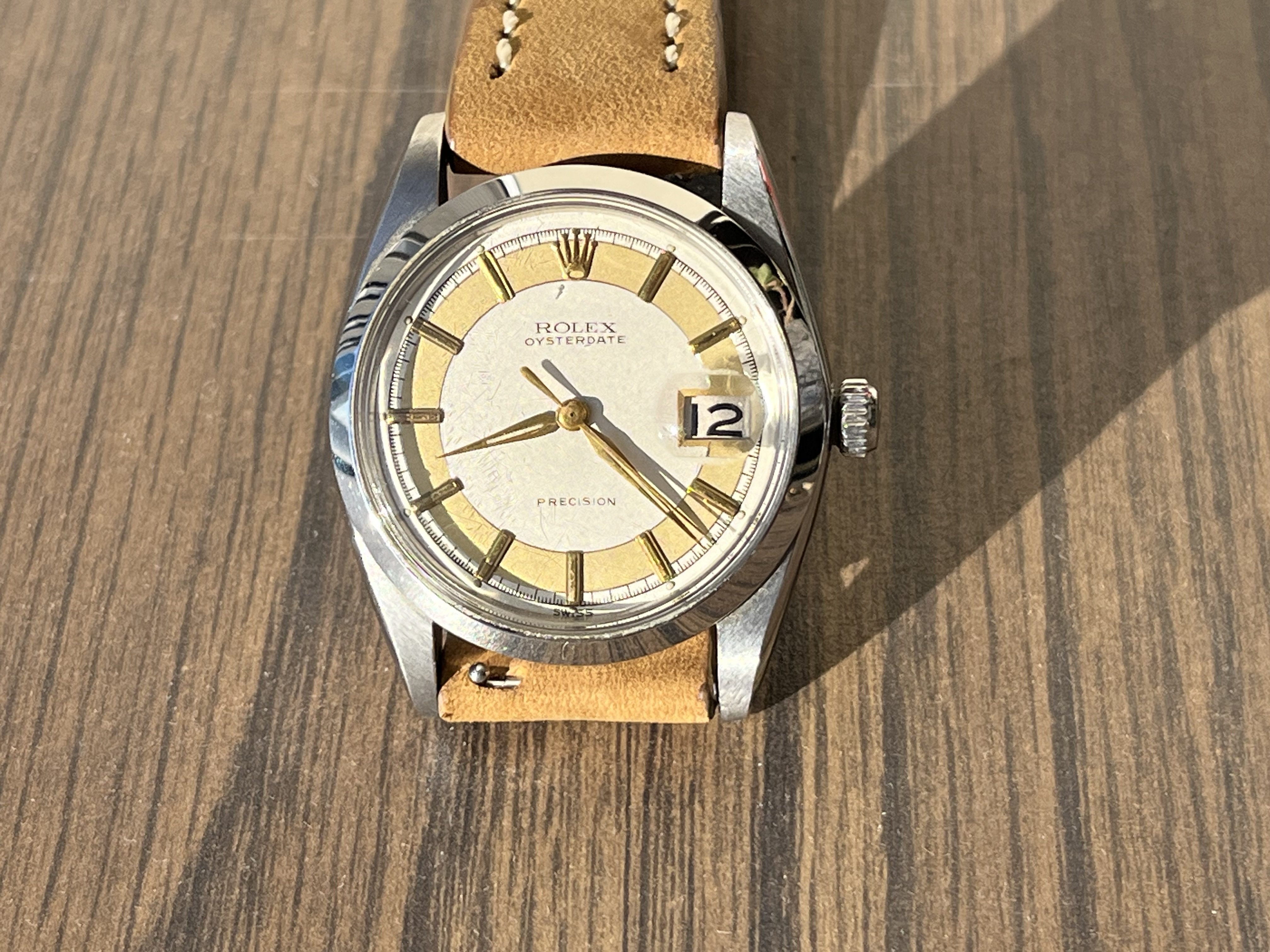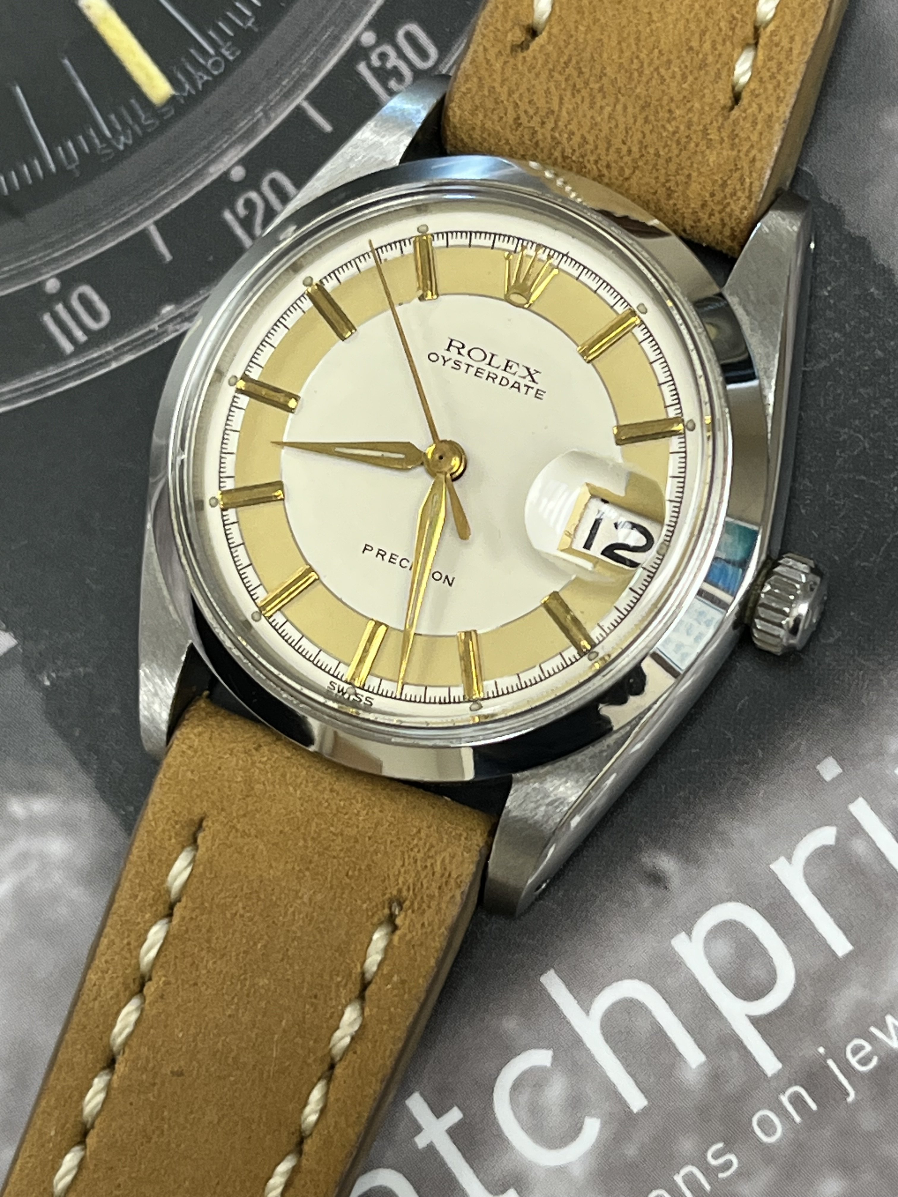 ·Hello up for sale is a circa 1963 Rolex Oysterdate Precision 6694, with an excellent condition case, measuring 34mm. It’s been polished in the past, but the case retains fat lugs and very attractive lines. A Strapsco 19mm leather quick release strap is included in the sale. 1.02X.XXX Serial and writings between lugs are crisp and clear (caseback stamped 6694 II.66). Black date wheel functions properly and is centered in dial window.