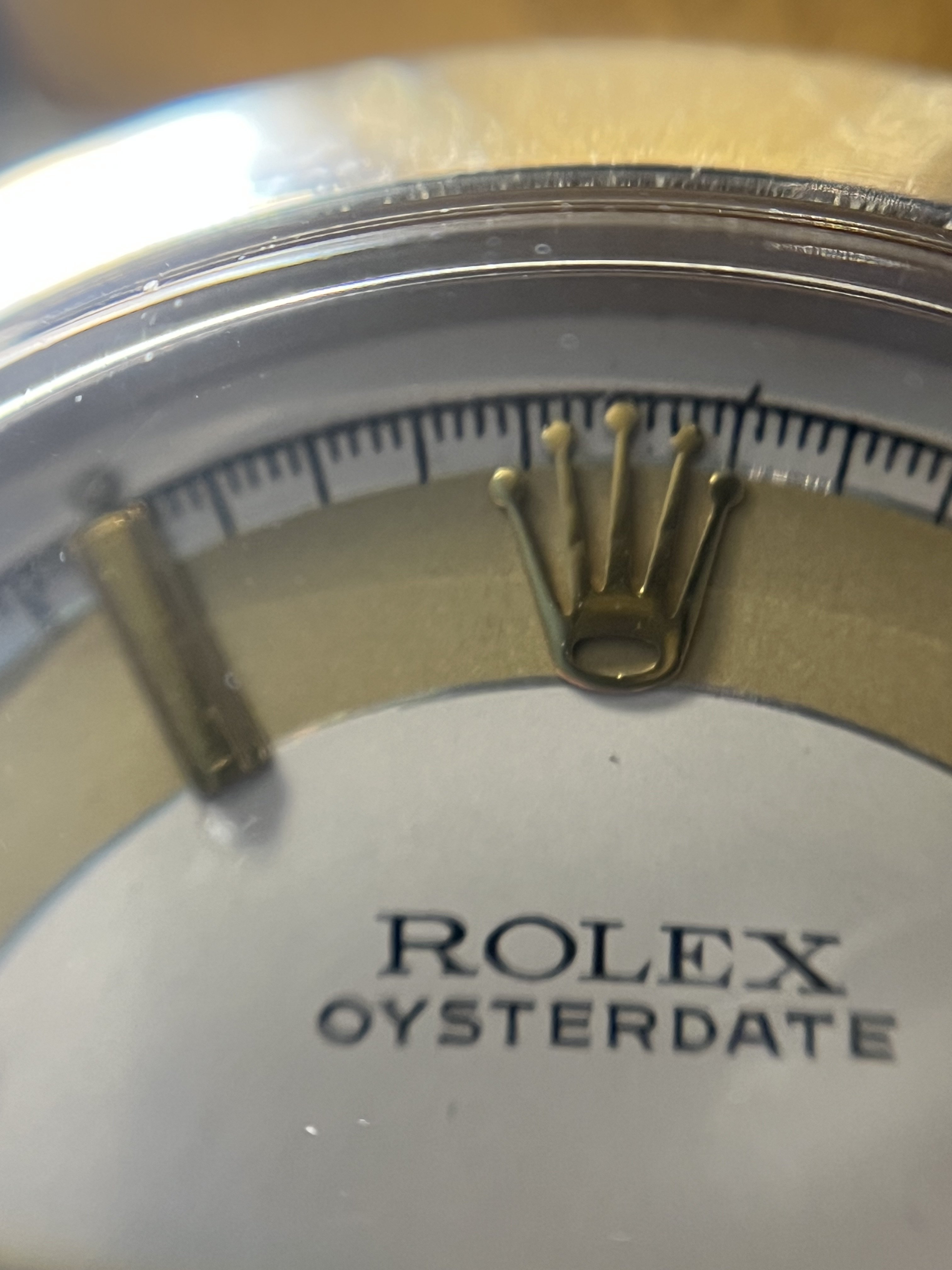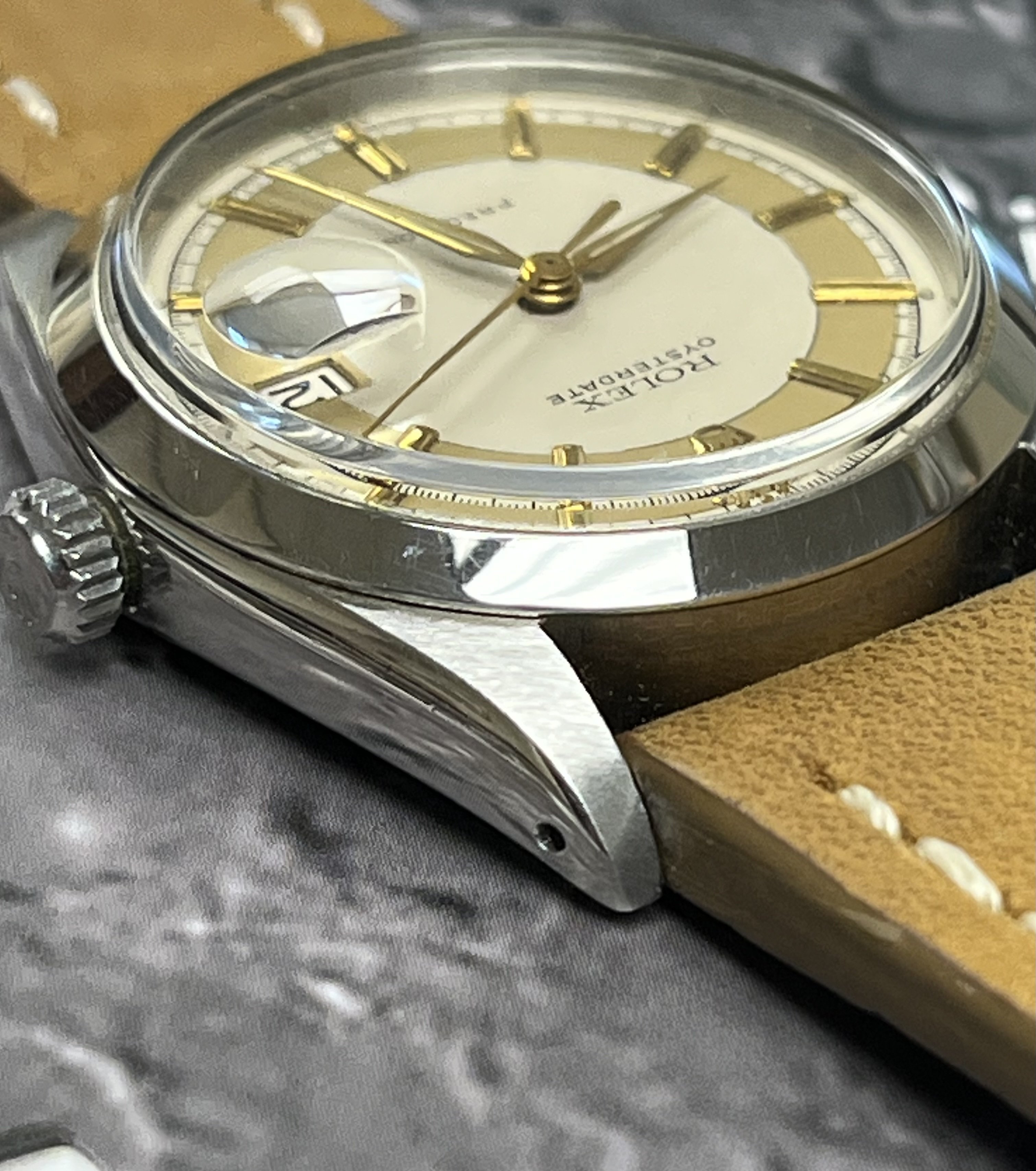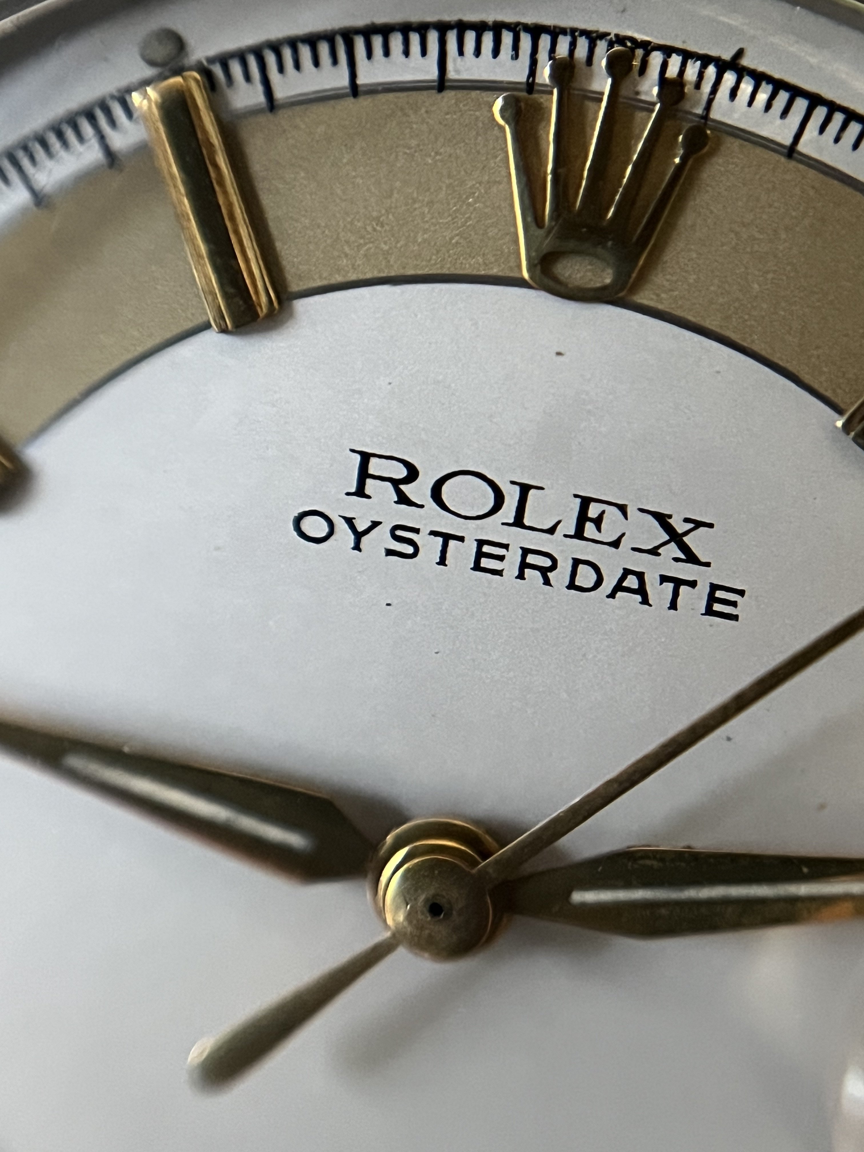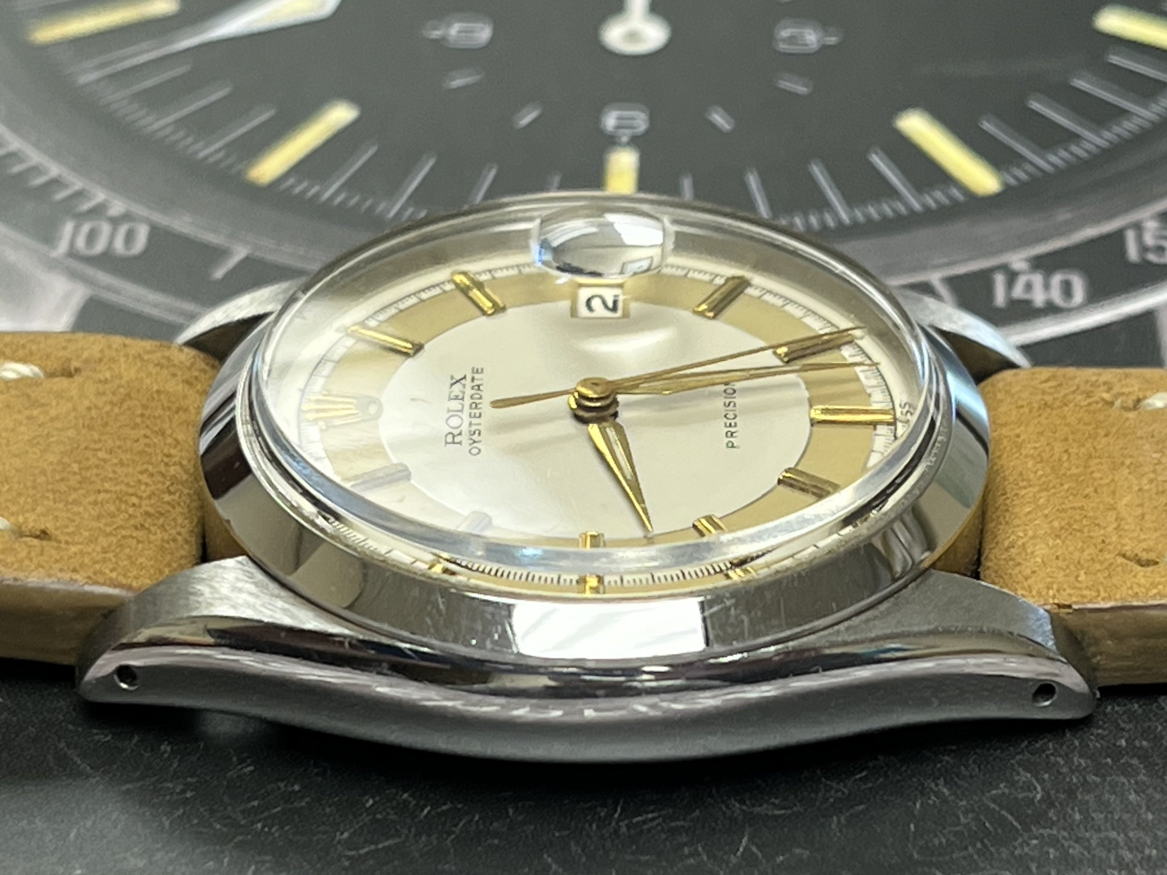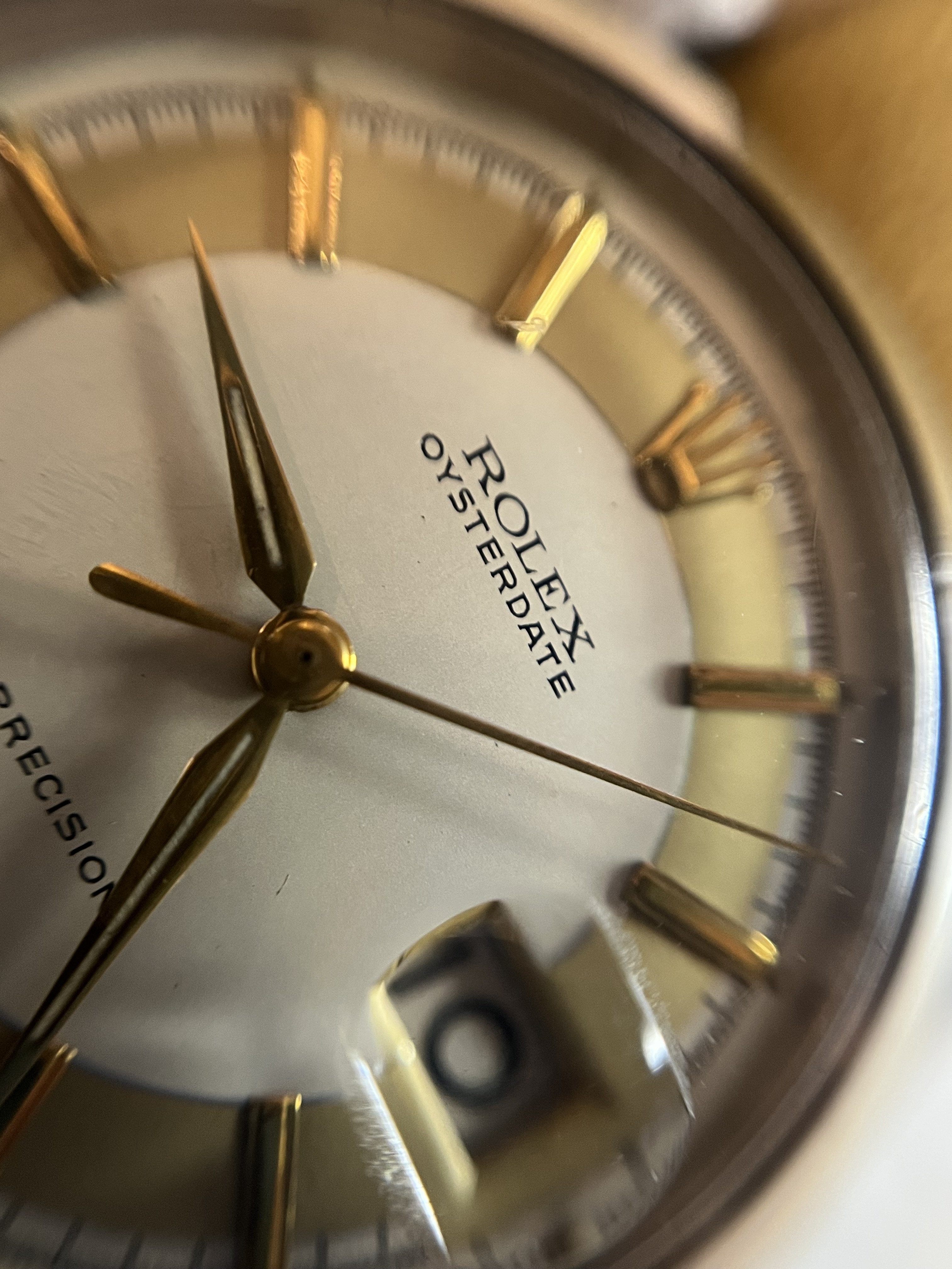 ·Hello up for sale is a circa 1963 Rolex Oysterdate Precision 6694, with an excellent condition case, measuring 34mm. It’s been polished in the past, but the case retains fat lugs and very attractive lines. A Strapsco 19mm leather quick release strap is included in the sale. 1.02X.XXX Serial and writings between lugs are crisp and clear (caseback stamped 6694 II.66). Black date wheel functions properly and is centered in dial window.