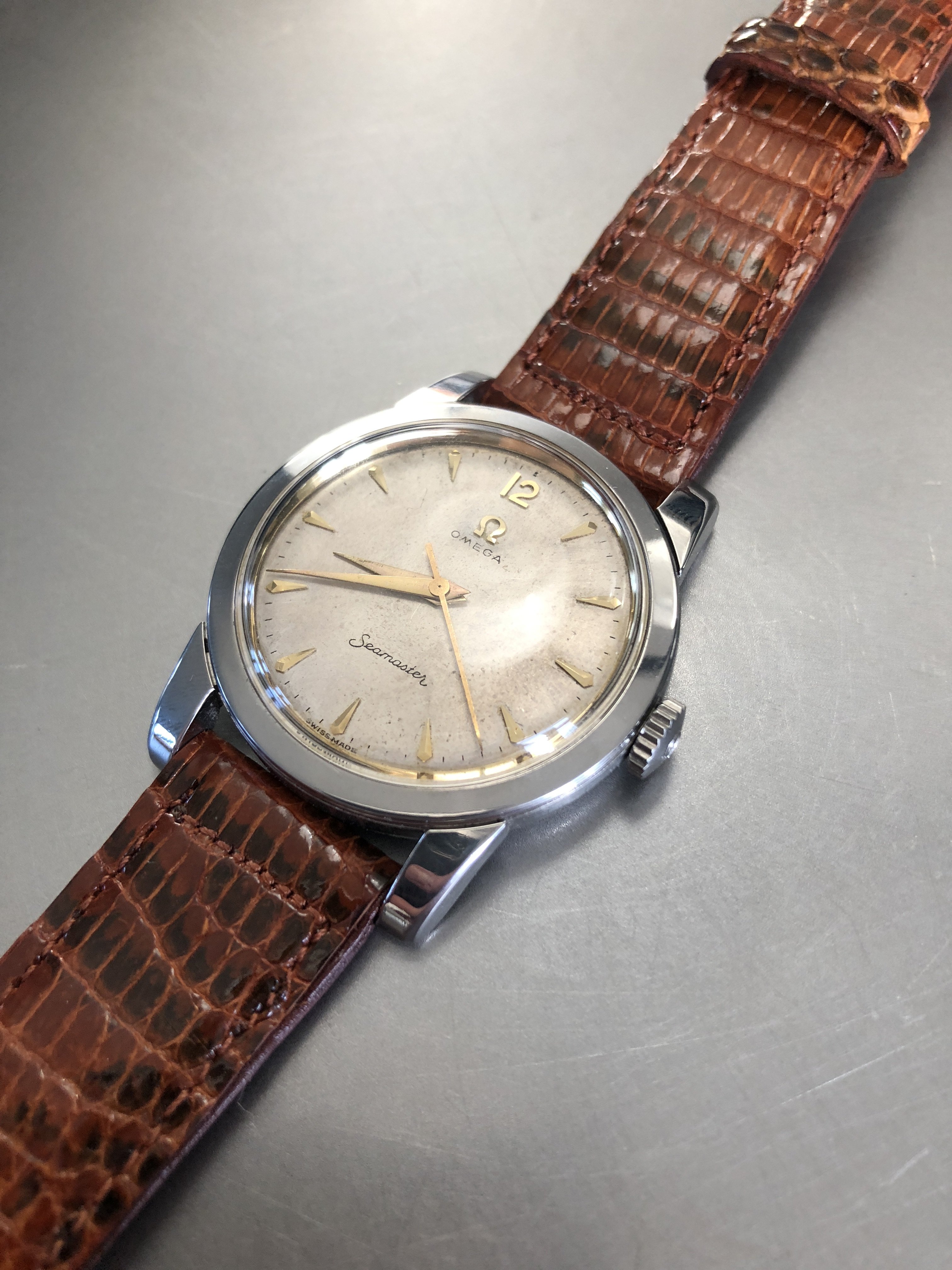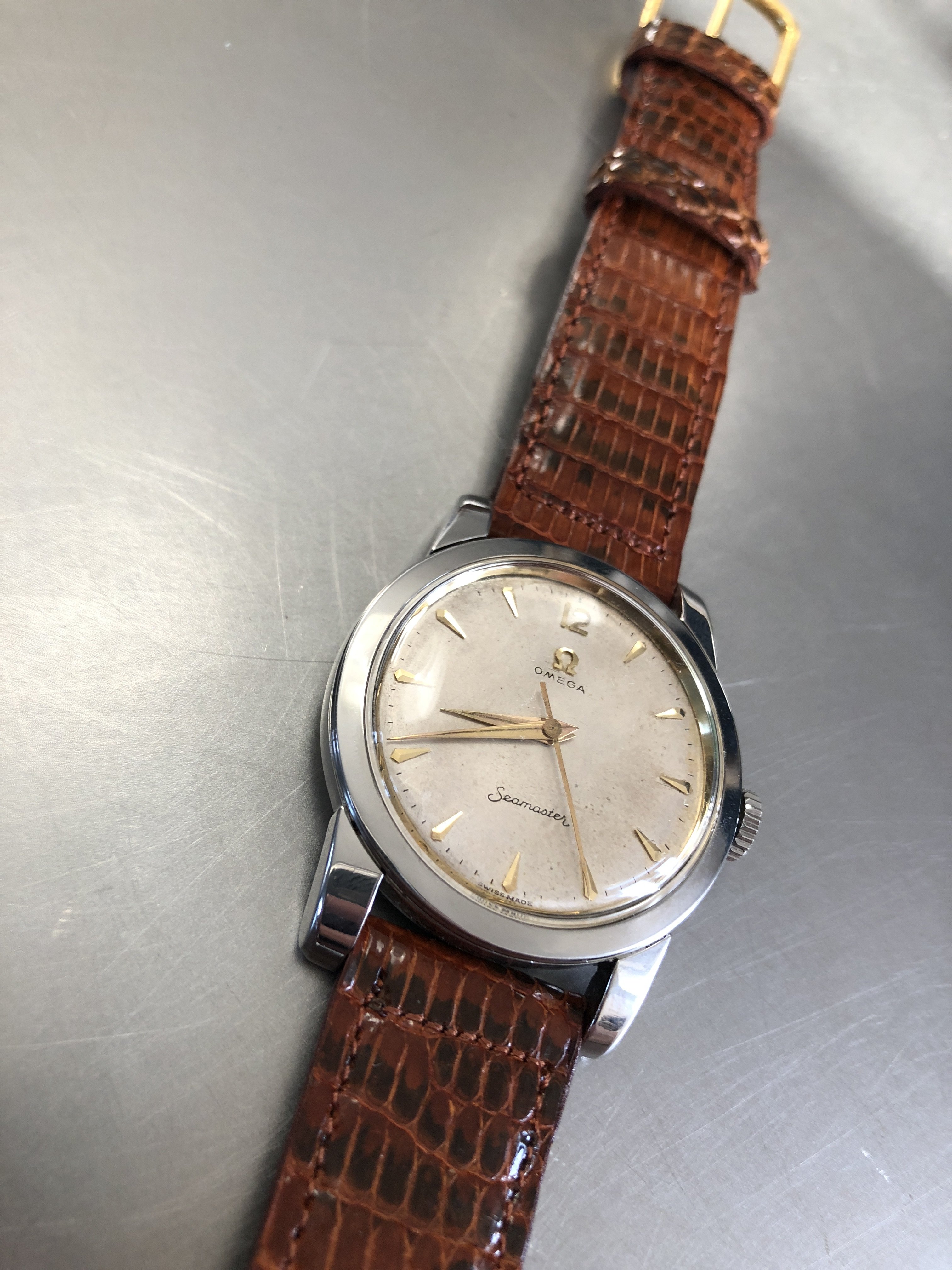 I'm more concerned about the the lettering in the "Omega" - the letter "E" in particular looks a bit goofy but the watch is old and other examples I've seen don't have the most pristine and sharp font to begin with. Another point of contention is the shade of the font in "Omega" vs. "Seamaster" where the later is noticeably darker and more defined than the former. One would expect both fonts to degrade at the same consistency, but I'm a newb in all of this and would love some feedback from the pros.