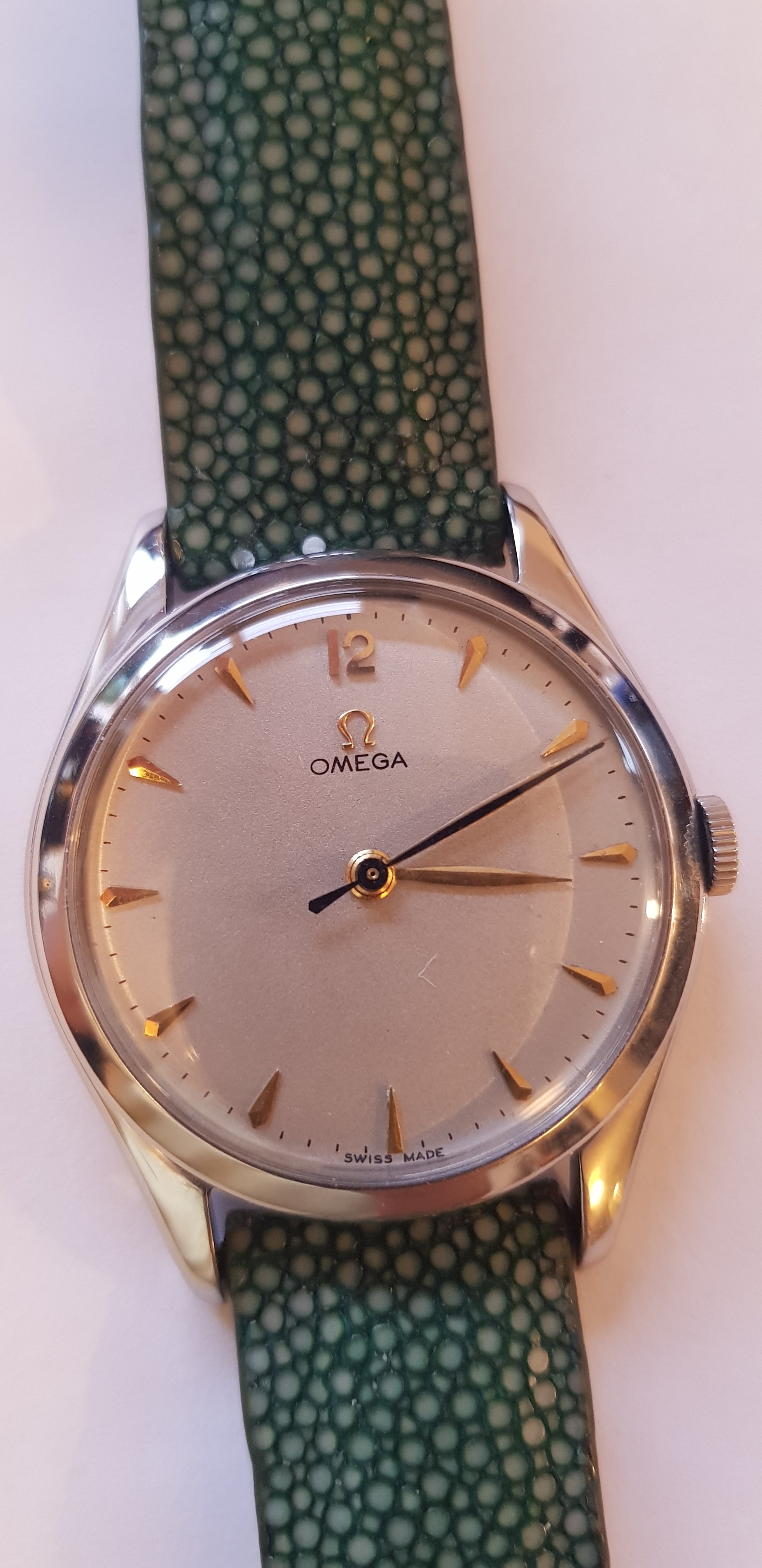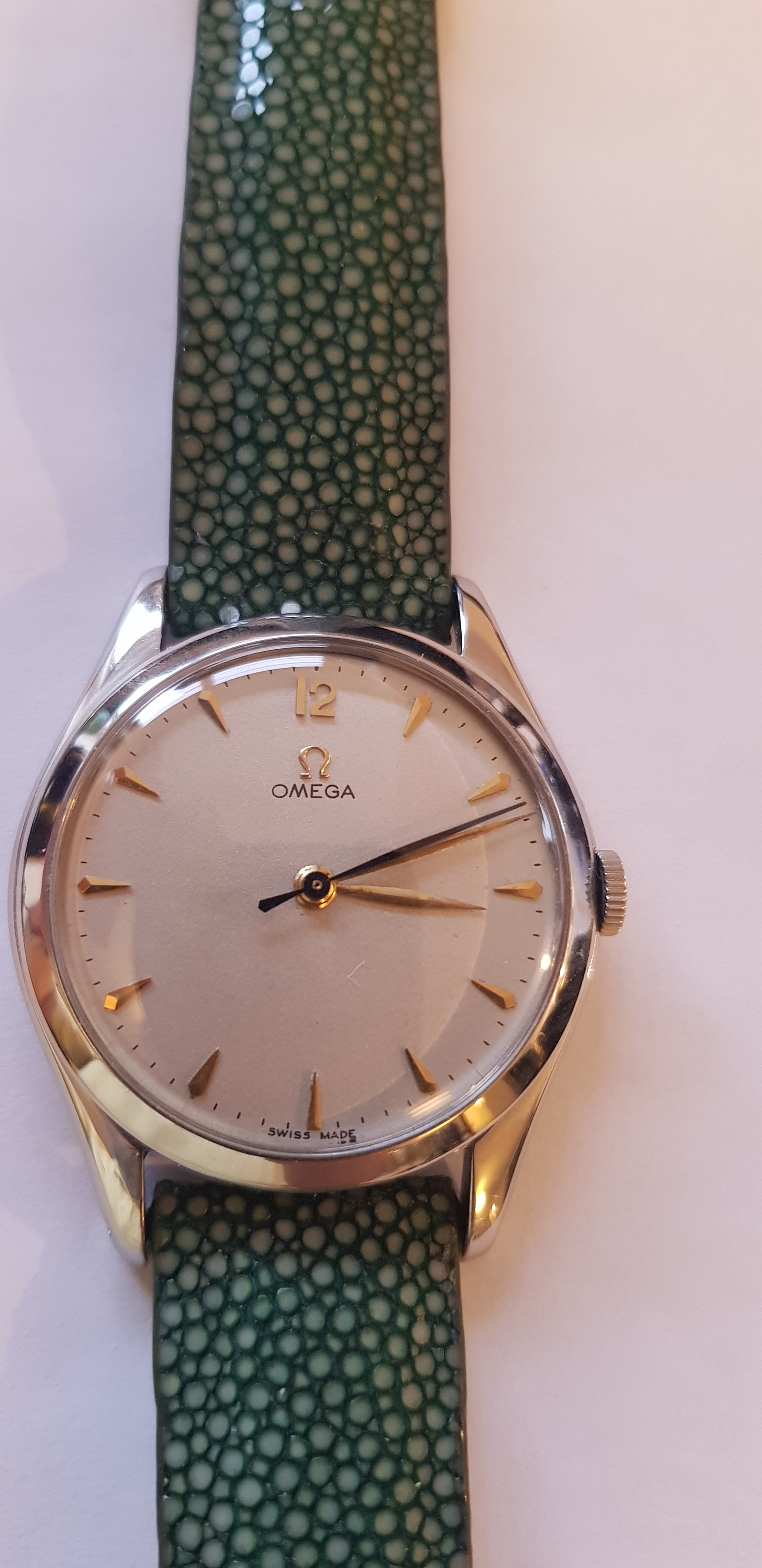 ·Hello forum. I wonder if you chaps can help me with some of your terrific knowledge (grovel). I have had this nice watch for some time now. It has been well looked after considering its age, but i was recently told by a watch repairer that it has had work done to the dial. I've stared for what seems like hours through my loup and squinted long and hard but it looks ok to me. Maybe the 'O' in omega is small? The 1 at the midday mark looks a bit askew, but i may now be imagining things. Please can I get some help here. I am becoming obsessed. I hope the photo is ok.