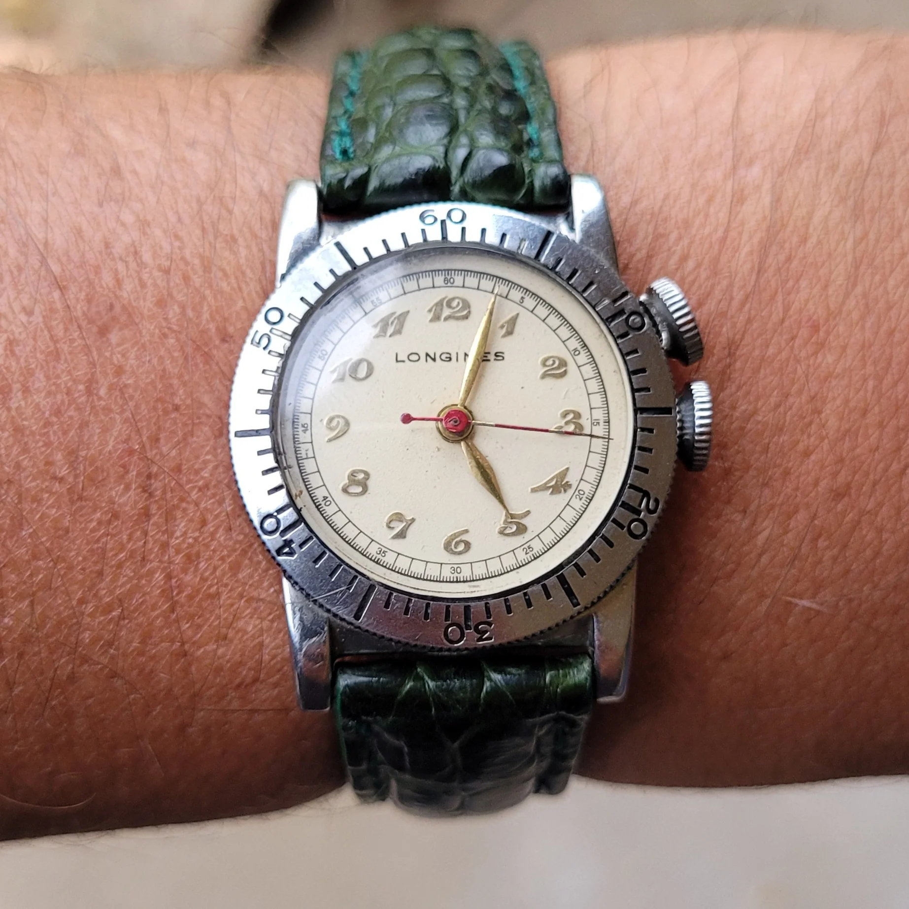 ·Howdy fellas, I'd like to consult the brain trust on my 1940 small Weems. I originally bought this watch figuring it was a redial based upon the 'S' and a couple of other inconsistent features of the print. Honestly, I don't think I've ever seen a sans serif print "Longines" I didn't wonder about. And, this was fine, because I bought it to steal the bezel lock off it for my A-11 project. Anyway, I digress. When the watch arrived I was rather pleased with it in hand. The S still is wonky, but my confidence that it was a redial was a touch shaken. I decided to wear it some, and to post it here. When no one here said anything about the dial being redone I started to talk myself into it being original with possibly a touch up here or there. Anyway, I posted this watch on the Longines group on Facebook a few days ago and two of the three comments were that it is a redial.
