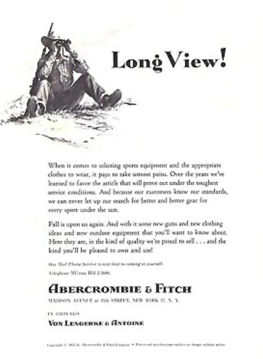 The brand's reputation for excellence attracted notable figures such as President Theodore Roosevelt, who chose A&F to outfit his African safari, and aviators Charles Lindbergh and Amelia Earhart. The flagship store, once located at Madison Avenue and East 45th Street in New York City, was renowned as "The Greatest Sporting Goods Store in the World," offering everything from bespoke shotguns to expedition equipment.