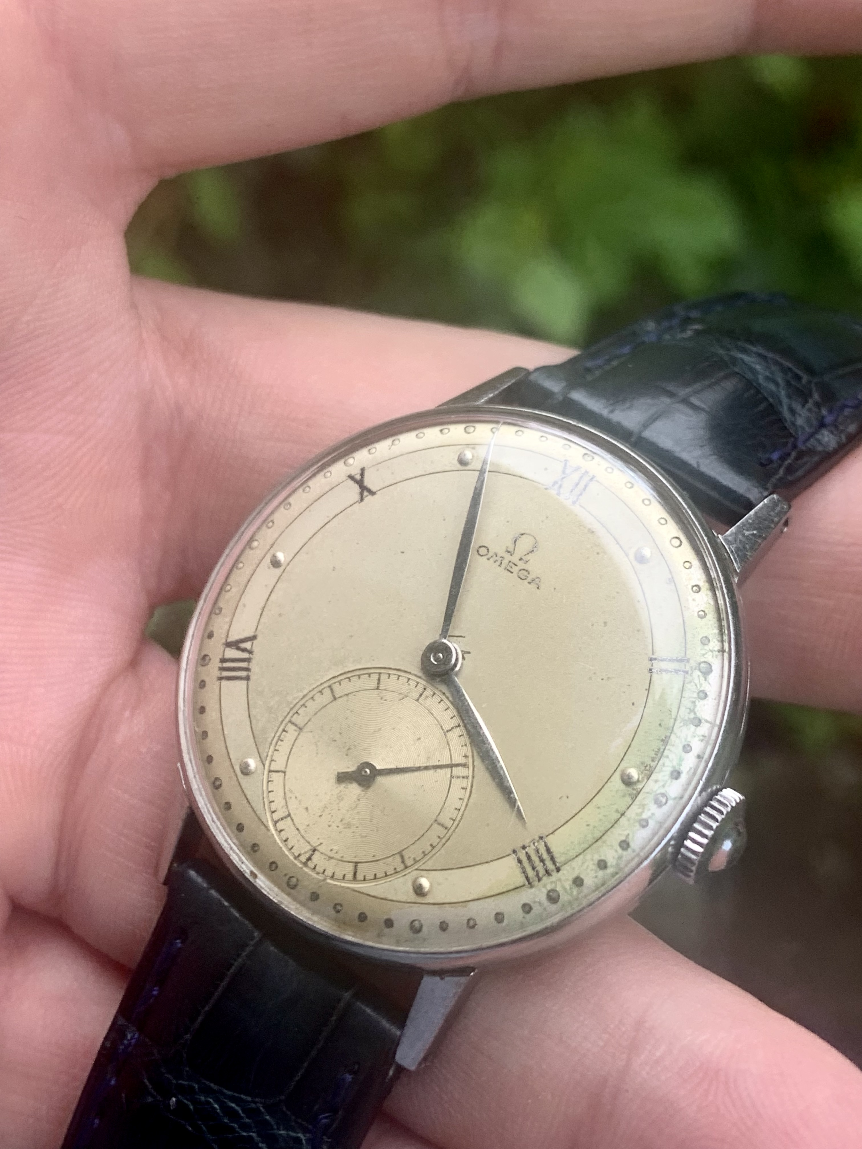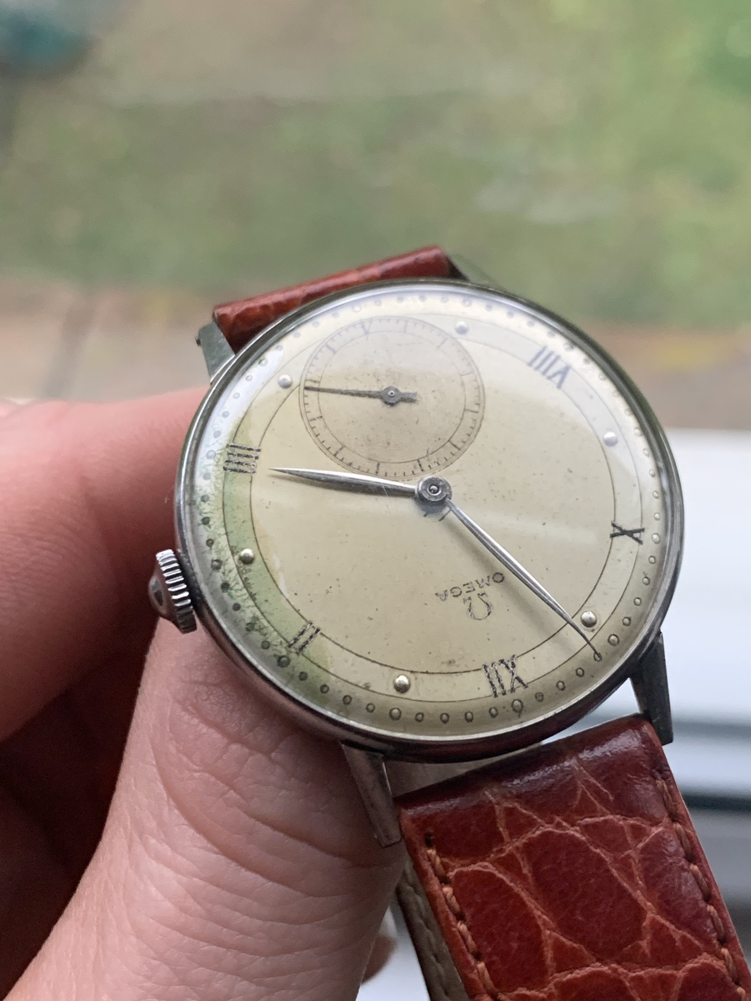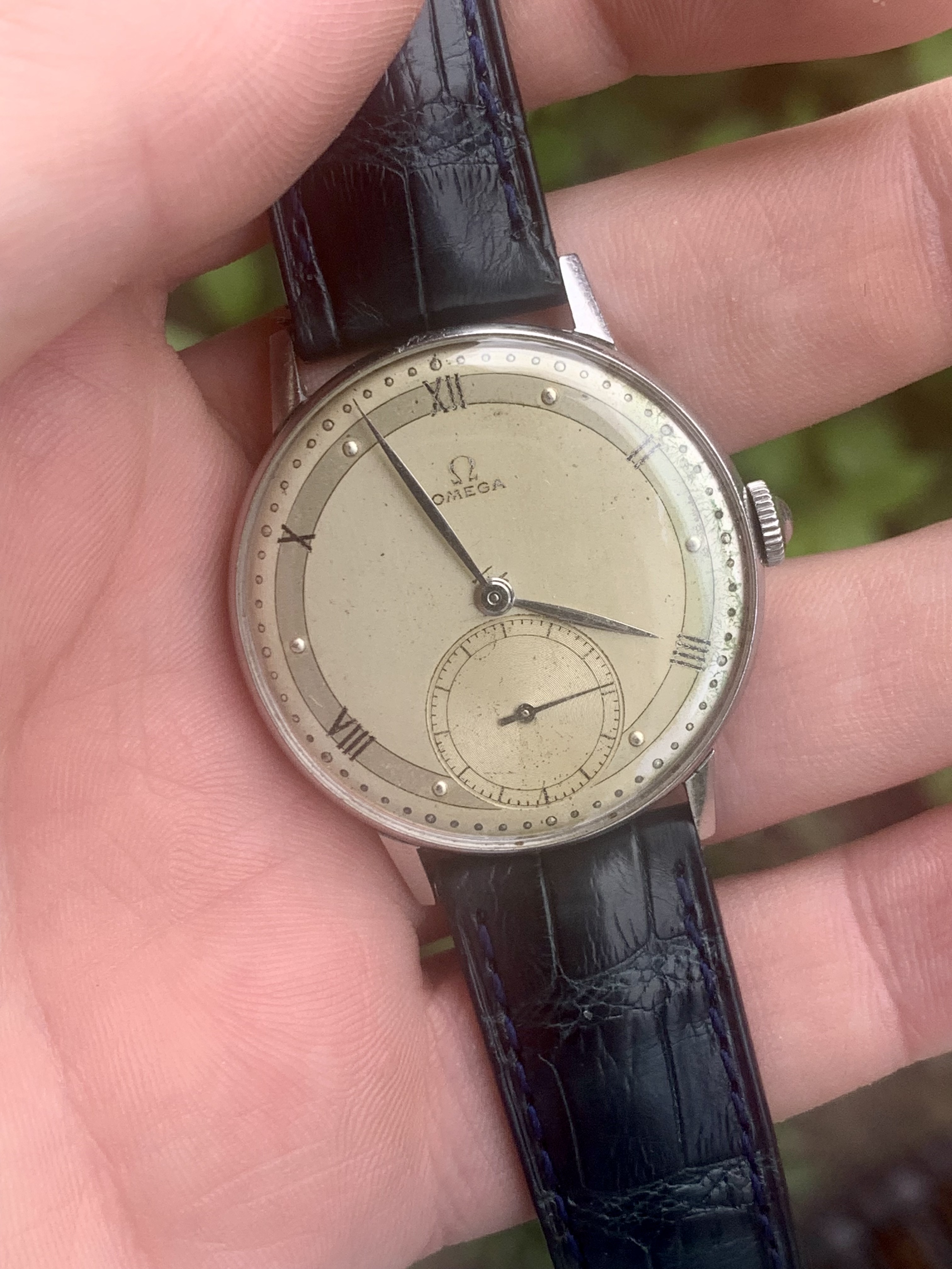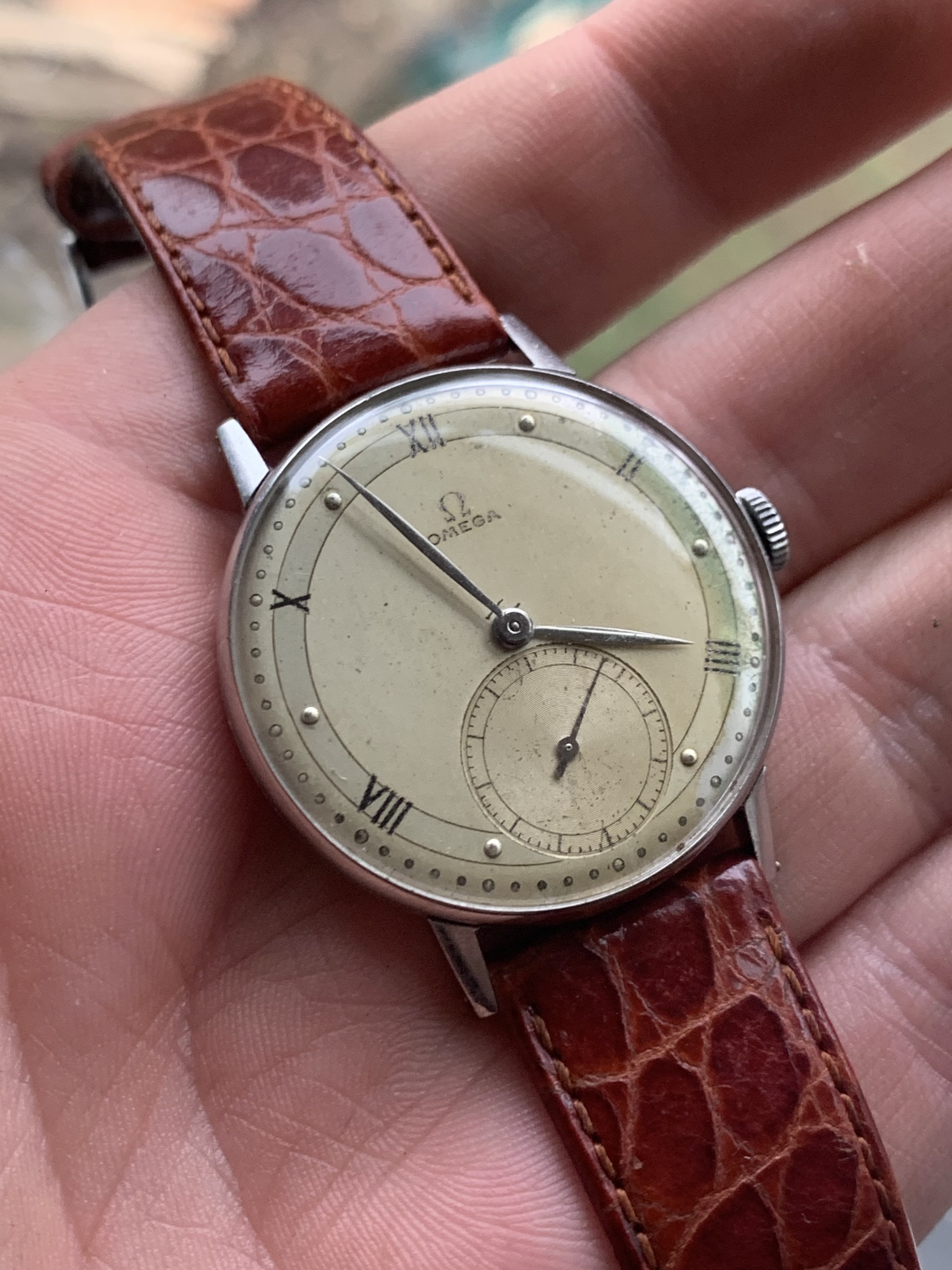 Dial: As you can see the two-tone dial is in generally good shape with an attractive patina. Depending on the angle it is observed and the lighting conditions, the dial looks slightly different and makes for quite a dynamic experience. The numerals at 2,4,8,10 and 12 are Roman numerals, which make this a rare example of Omega's classic scientific dial that is more often found on the super rare chronometres. There are a couple of speckles around the dial, but the condition is pretty good, apart from a slight greening of the area near 3 O'clock. I think it is still nonetheless a great example of the classic time only Omega's of the 1940s.