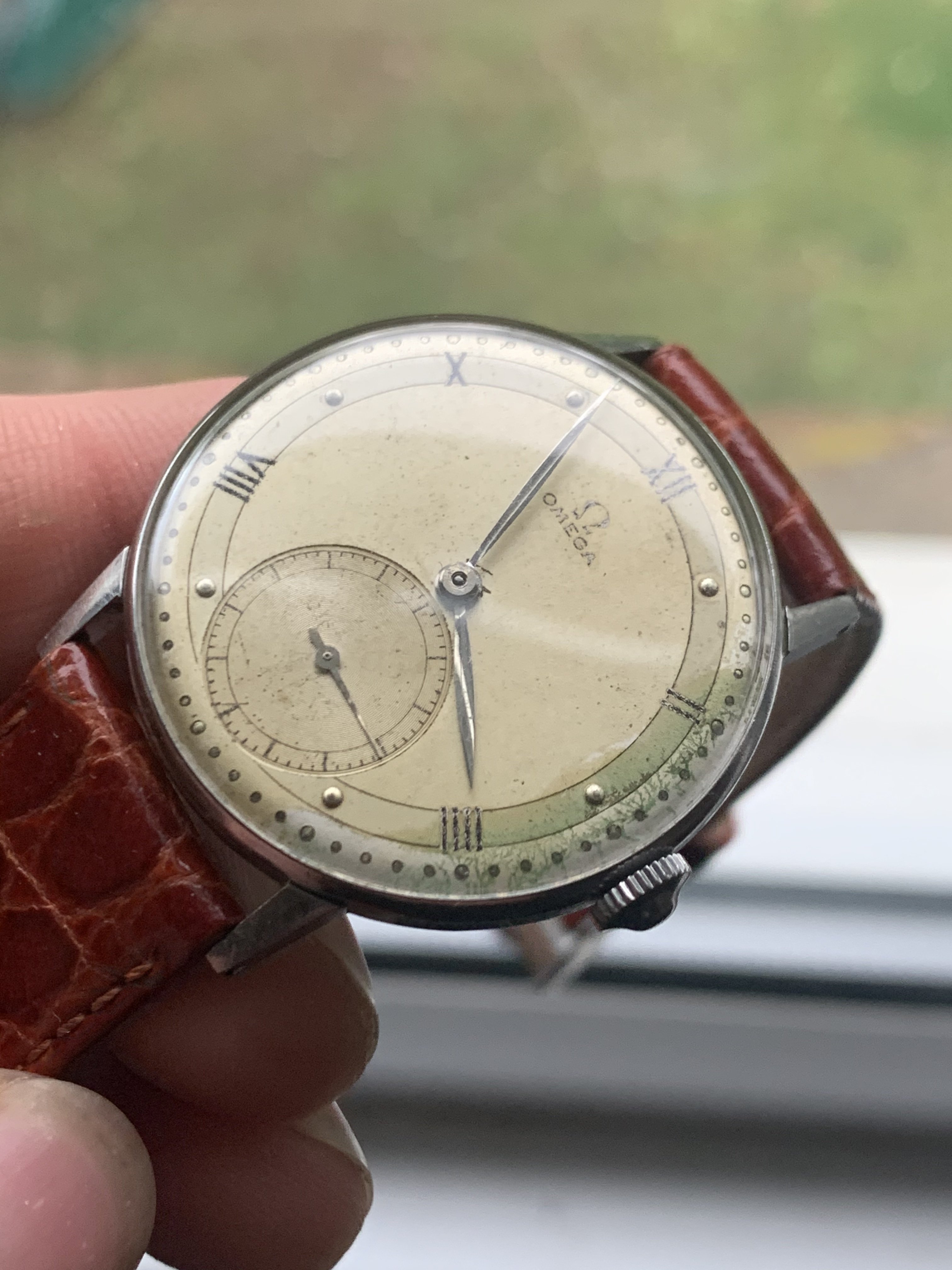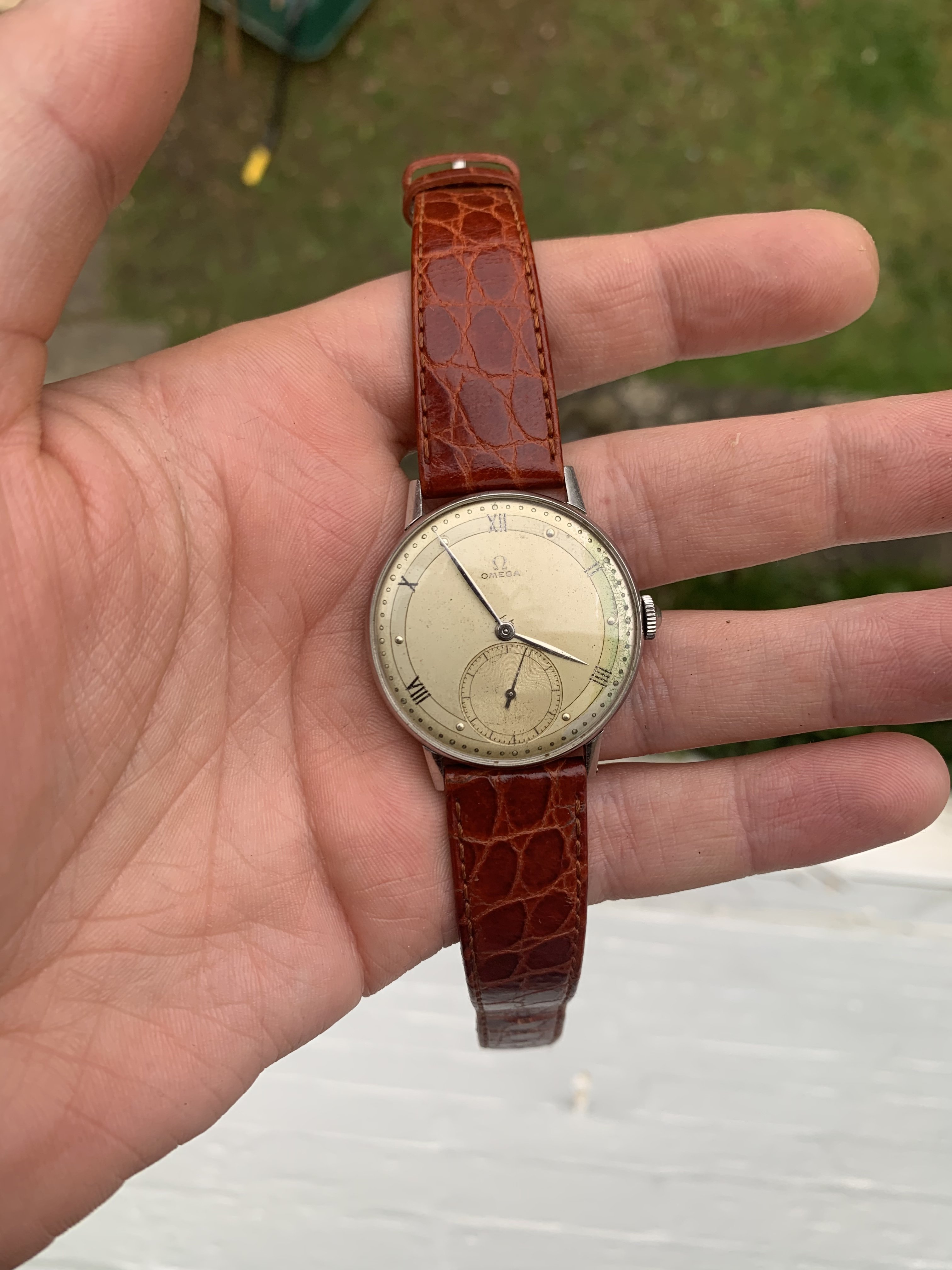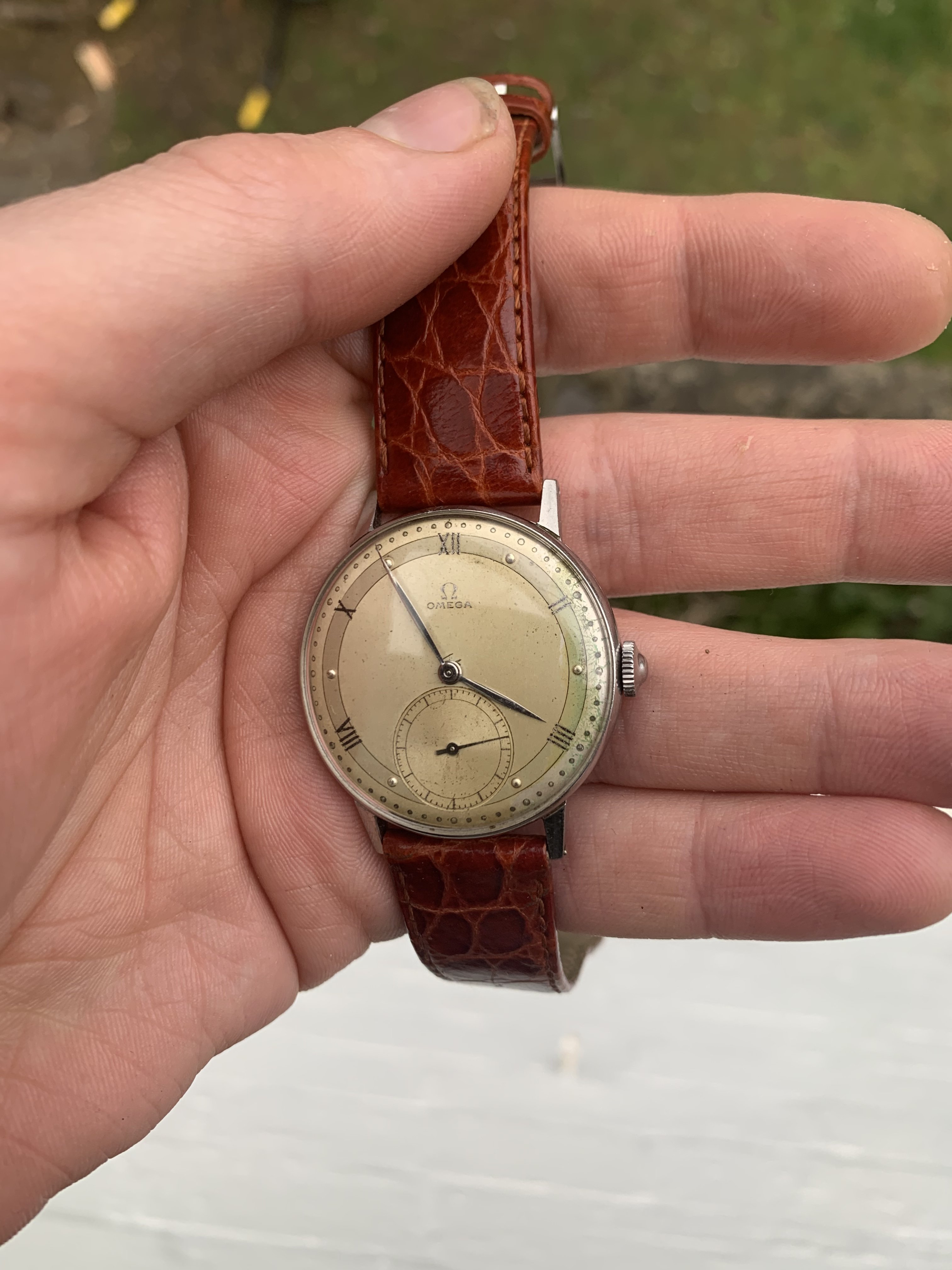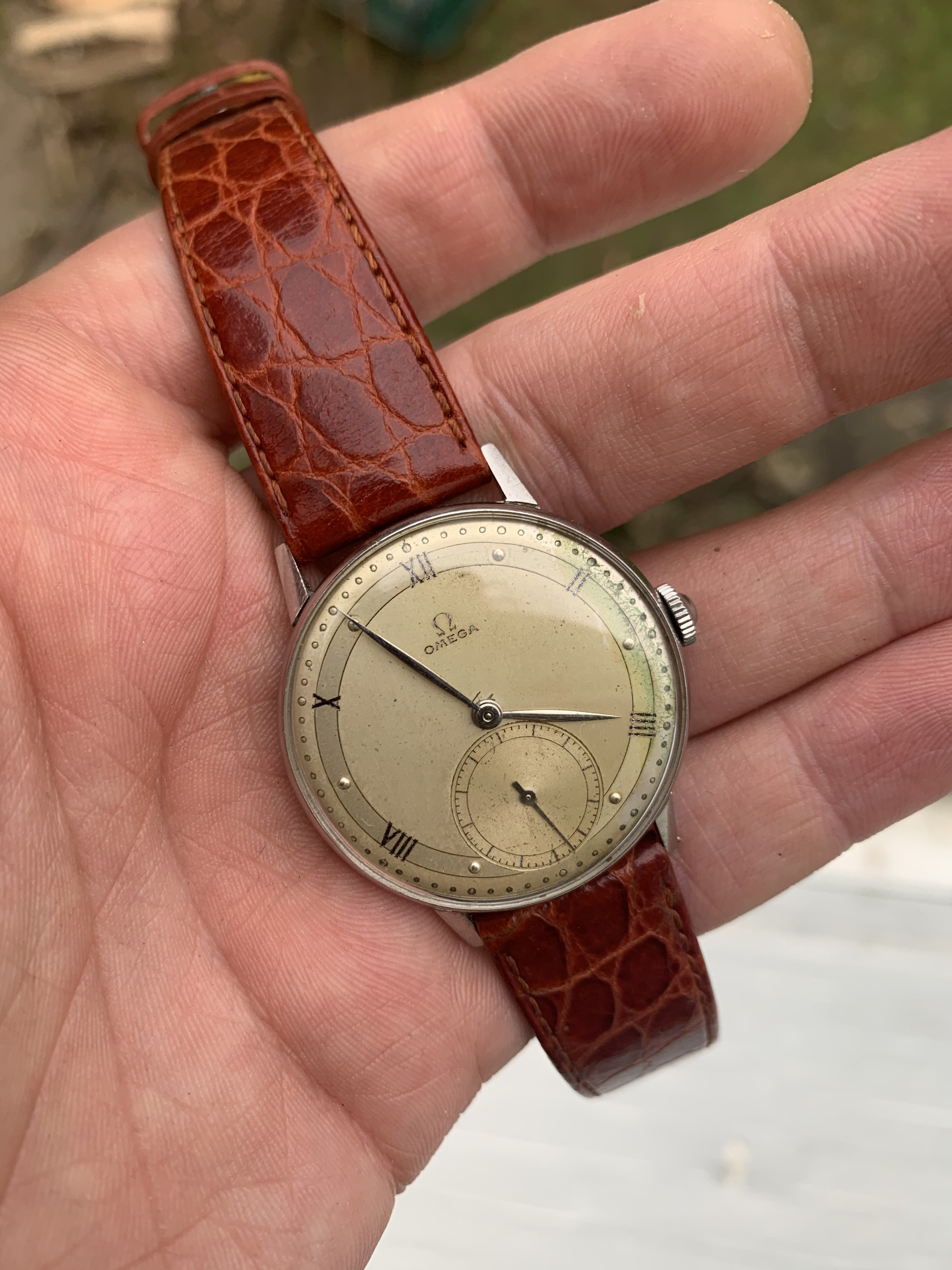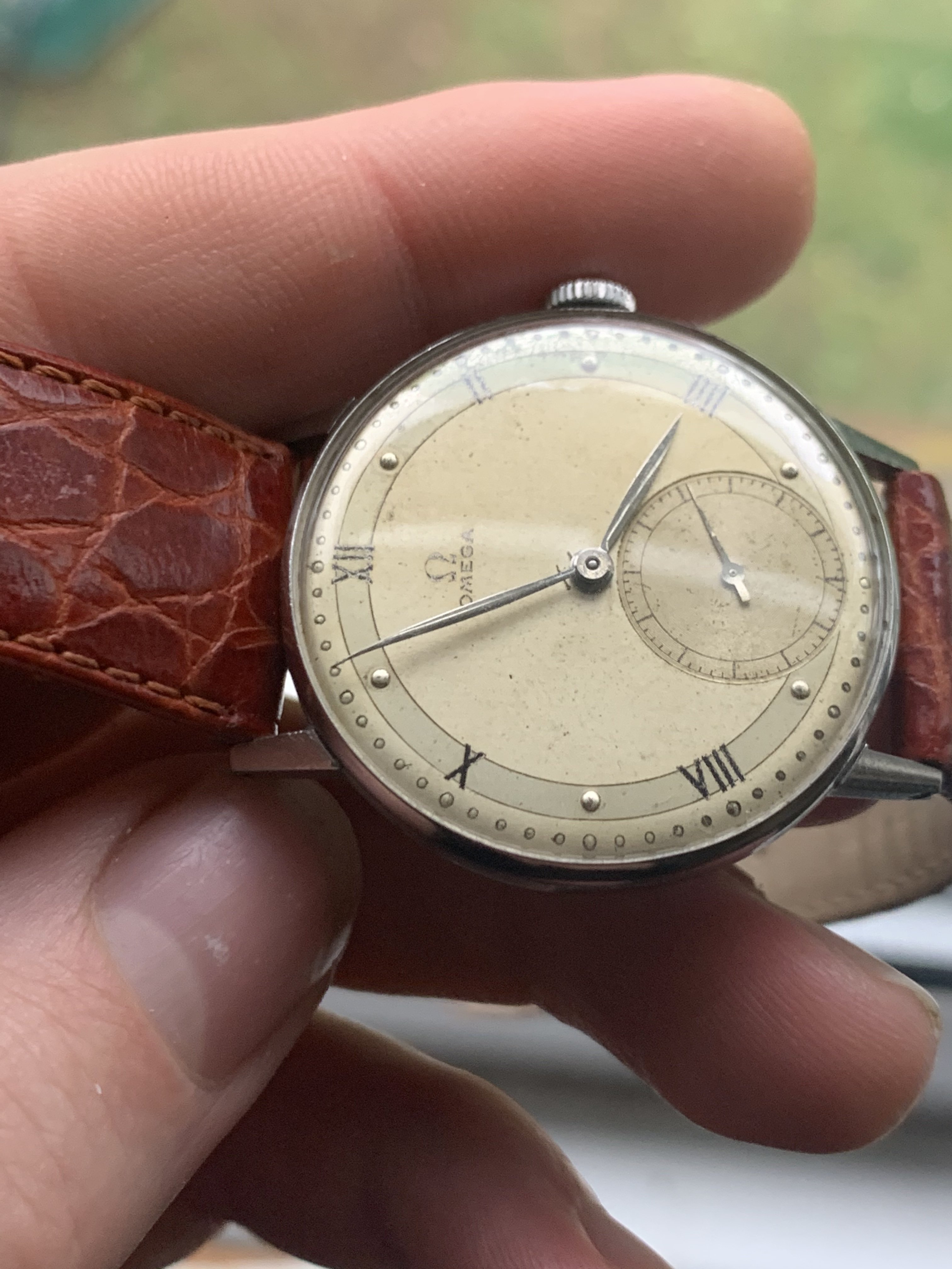 Dial: As you can see the two-tone dial is in generally good shape with an attractive patina. Depending on the angle it is observed and the lighting conditions, the dial looks slightly different and makes for quite a dynamic experience. The numerals at 2,4,8,10 and 12 are Roman numerals, which make this a rare example of Omega's classic scientific dial that is more often found on the super rare chronometres. There are a couple of speckles around the dial, but the condition is pretty good, apart from a slight greening of the area near 3 O'clock. I think it is still nonetheless a great example of the classic time only Omega's of the 1940s.