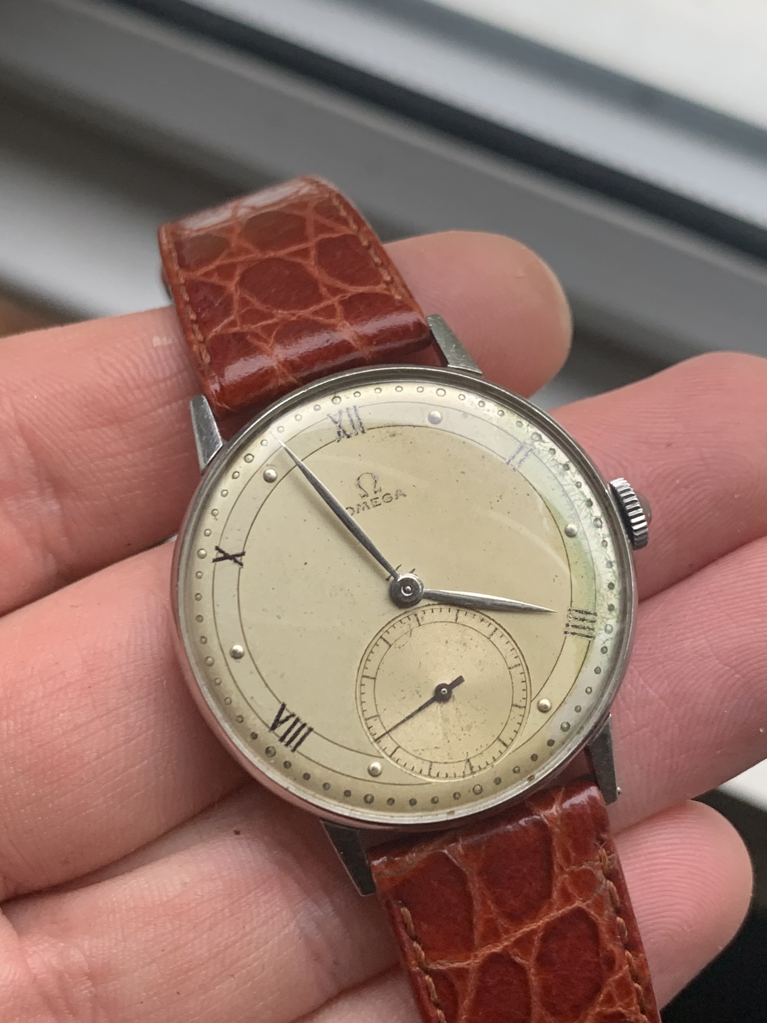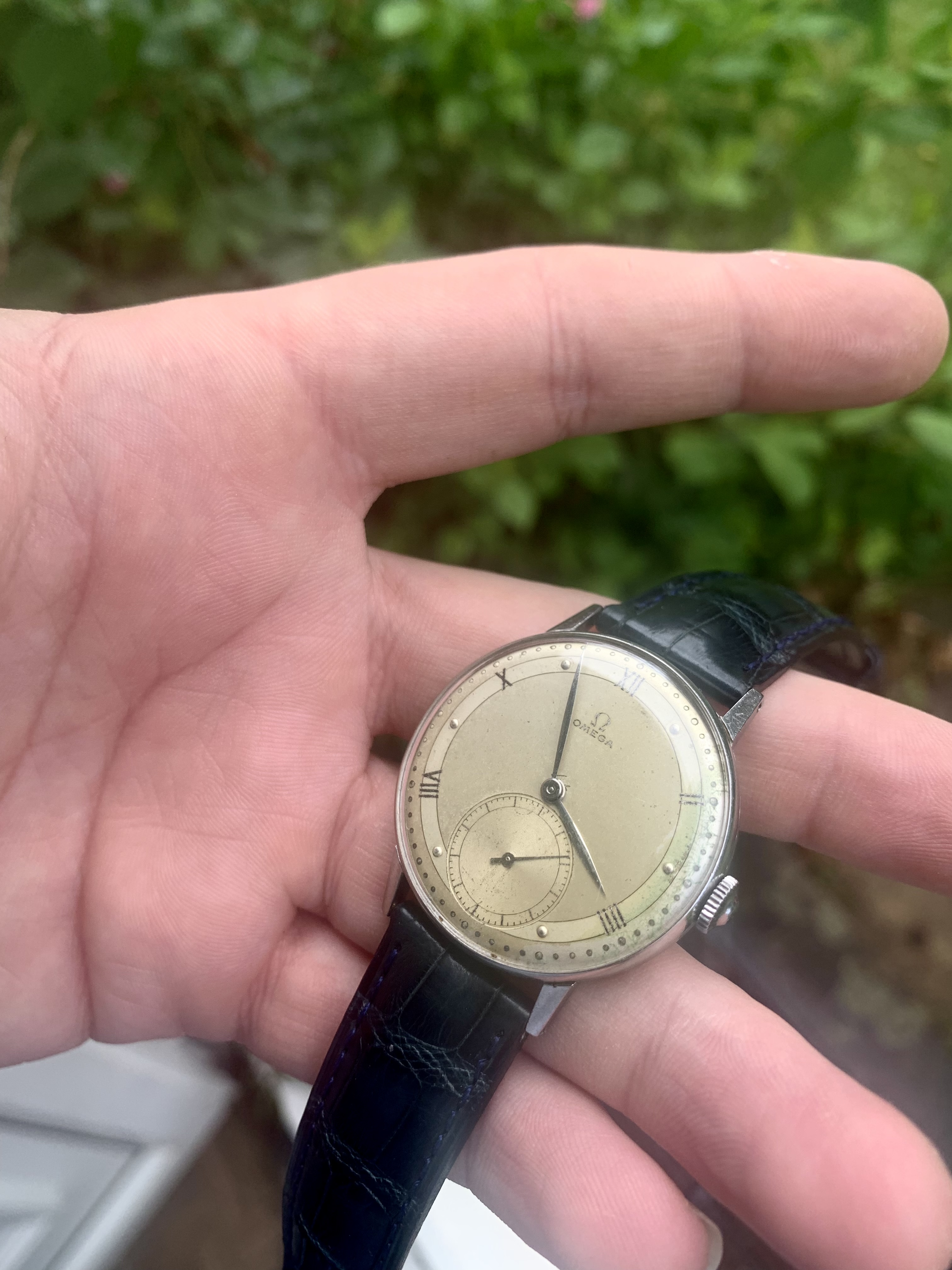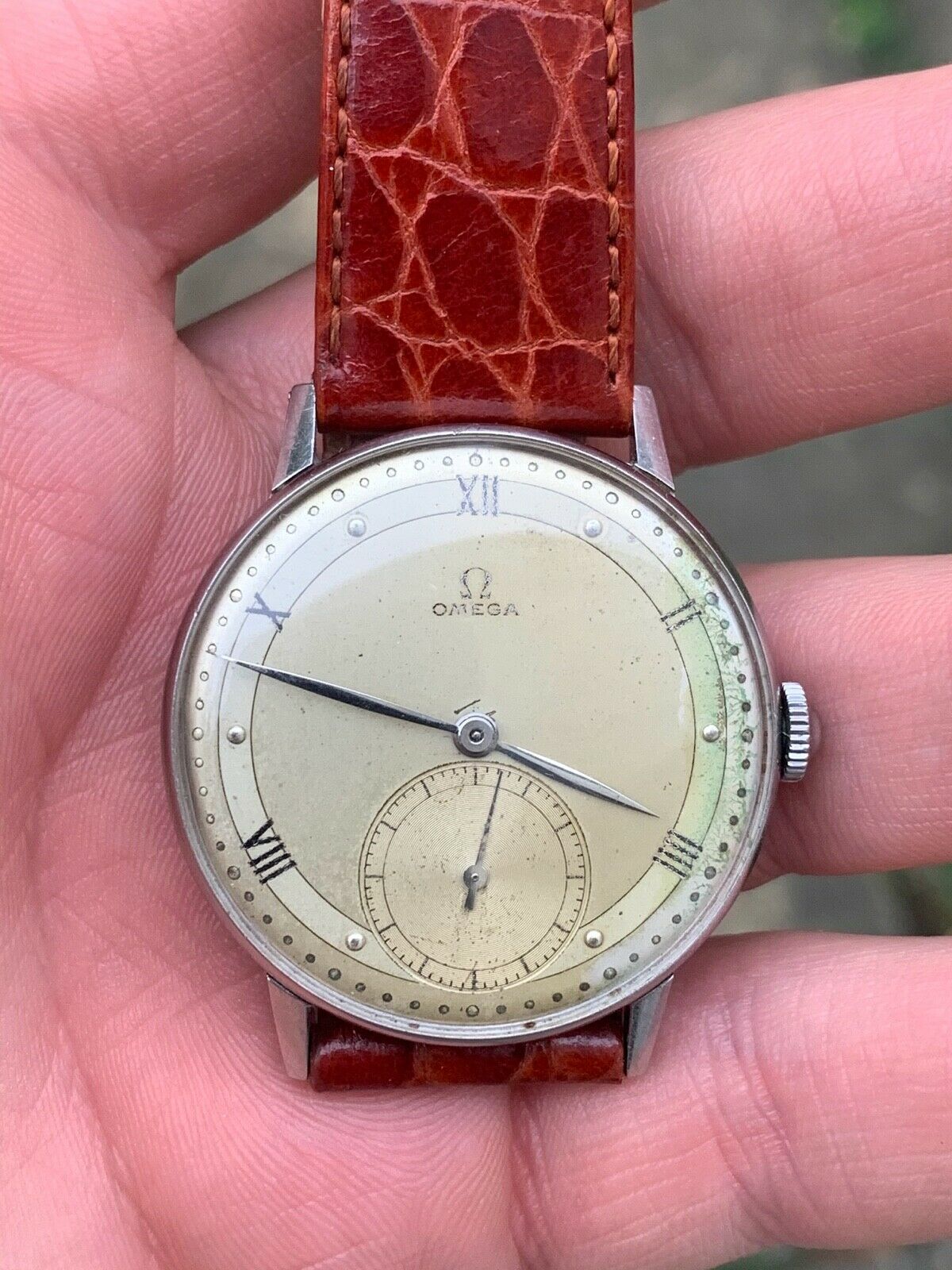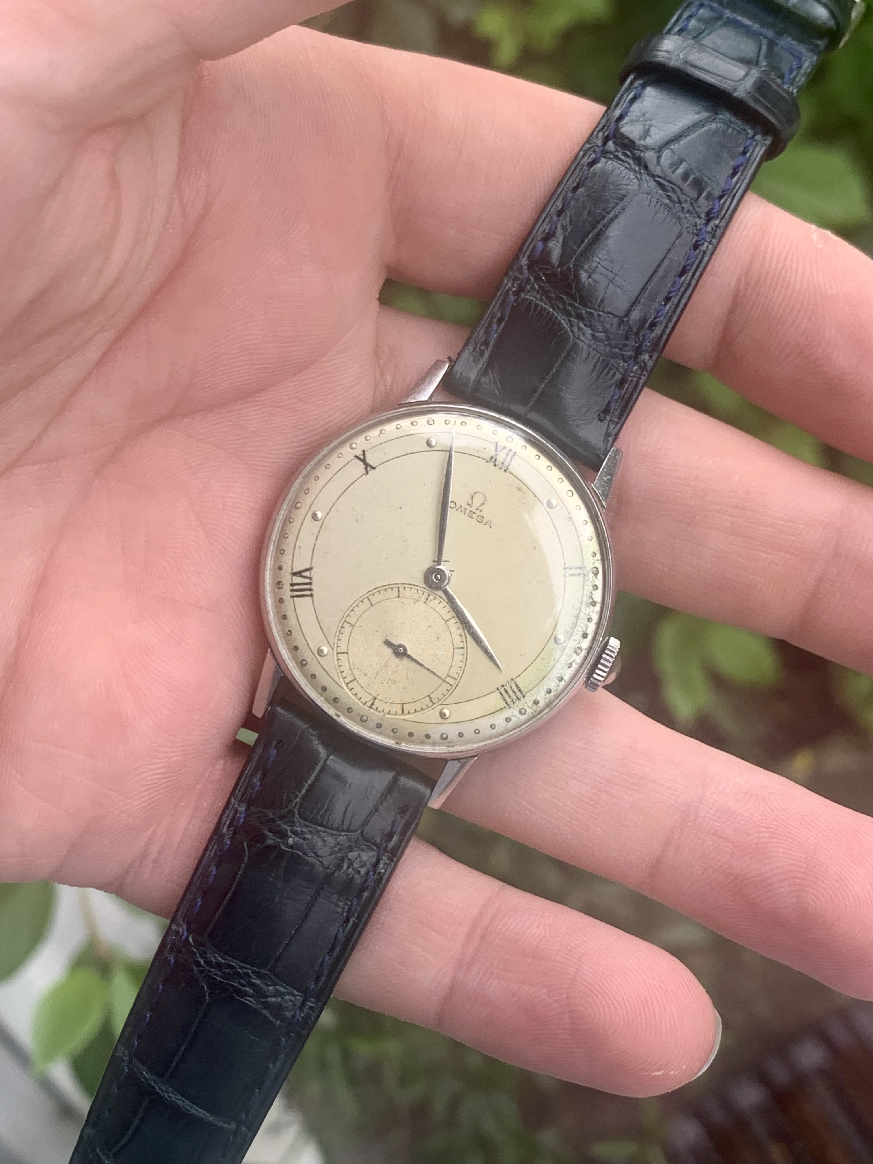 Dial: As you can see the two-tone dial is in generally good shape with an attractive patina. Depending on the angle it is observed and the lighting conditions, the dial looks slightly different and makes for quite a dynamic experience. The numerals at 2,4,8,10 and 12 are Roman numerals, which make this a rare example of Omega's classic scientific dial that is more often found on the super rare chronometres. There are a couple of speckles around the dial, but the condition is pretty good, apart from a slight greening of the area near 3 O'clock. I think it is still nonetheless a great example of the classic time only Omega's of the 1940s.