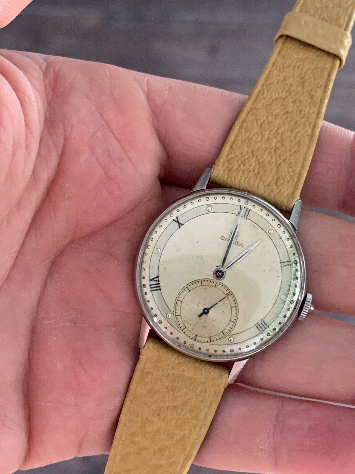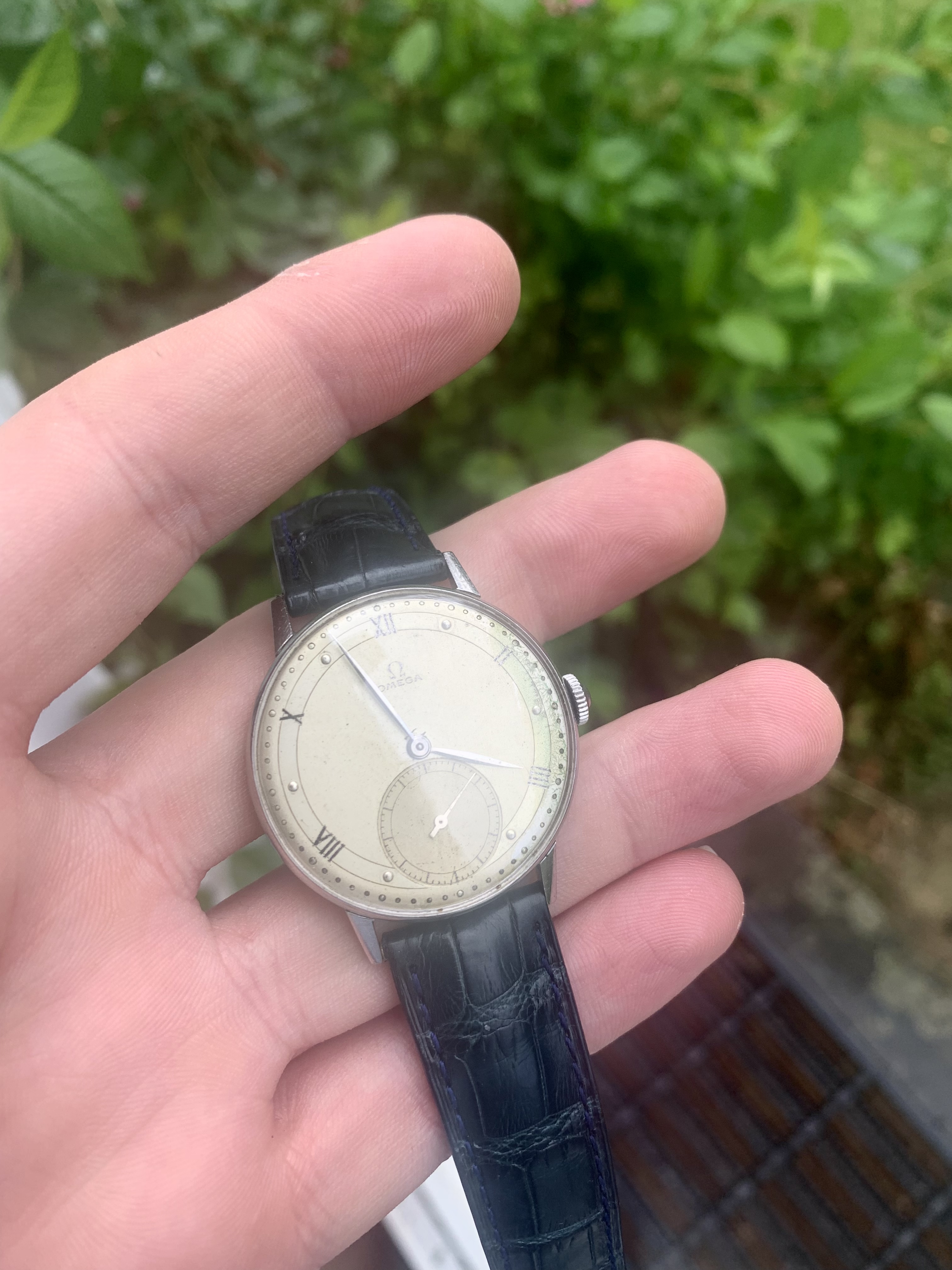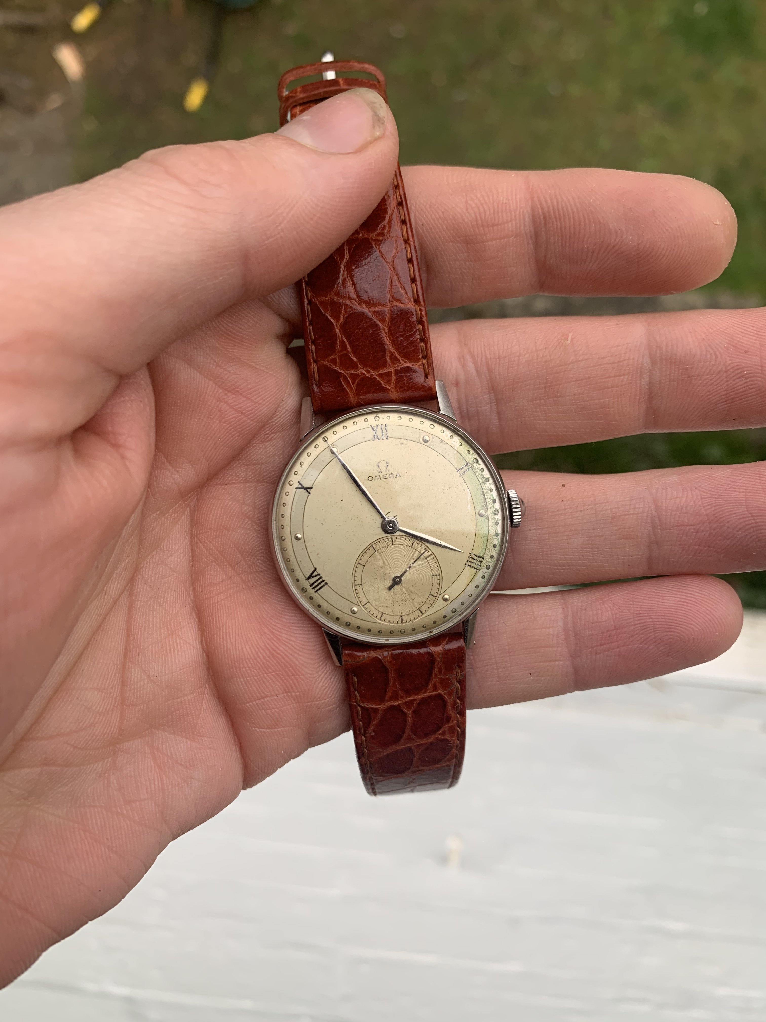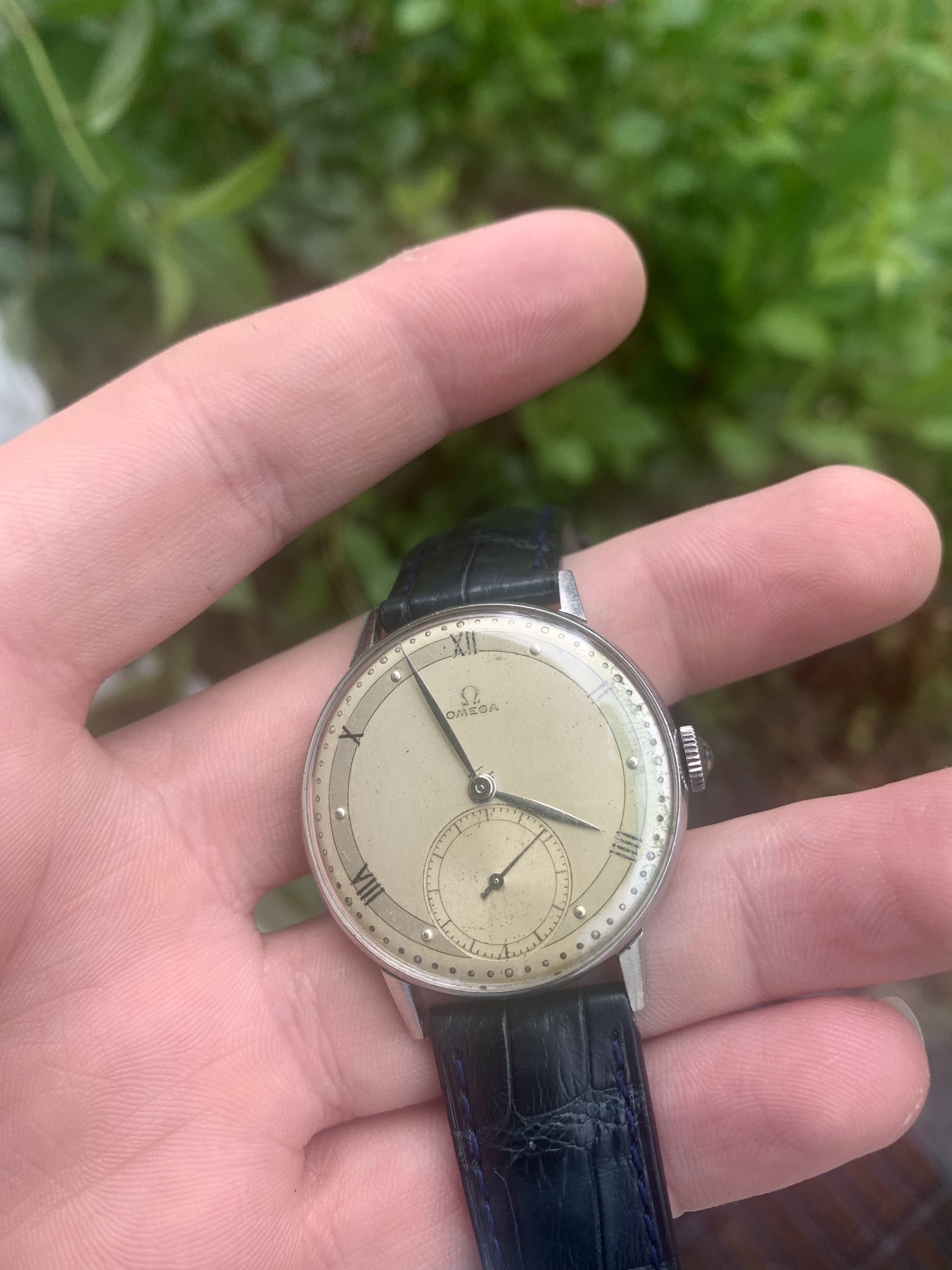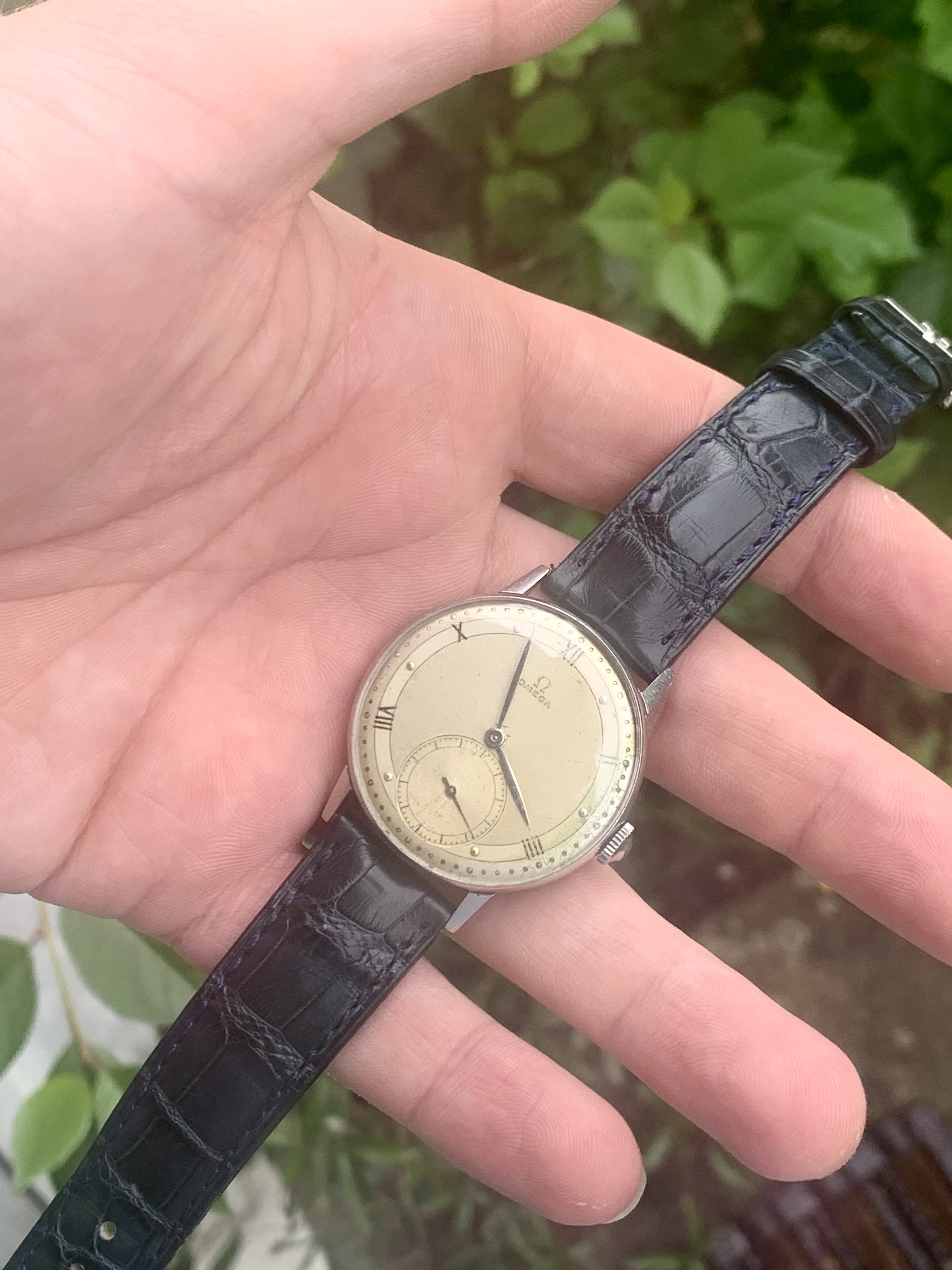 Dial: As you can see the two-tone dial is in generally good shape with an attractive patina. Depending on the angle it is observed and the lighting conditions, the dial looks slightly different and makes for quite a dynamic experience. The numerals at 2,4,8,10 and 12 are Roman numerals, which make this a rare example of Omega's classic scientific dial that is more often found on the super rare chronometres. There are a couple of speckles around the dial, but the condition is pretty good, apart from a slight greening of the area near 3 O'clock. I think it is still nonetheless a great example of the classic time only Omega's of the 1940s.