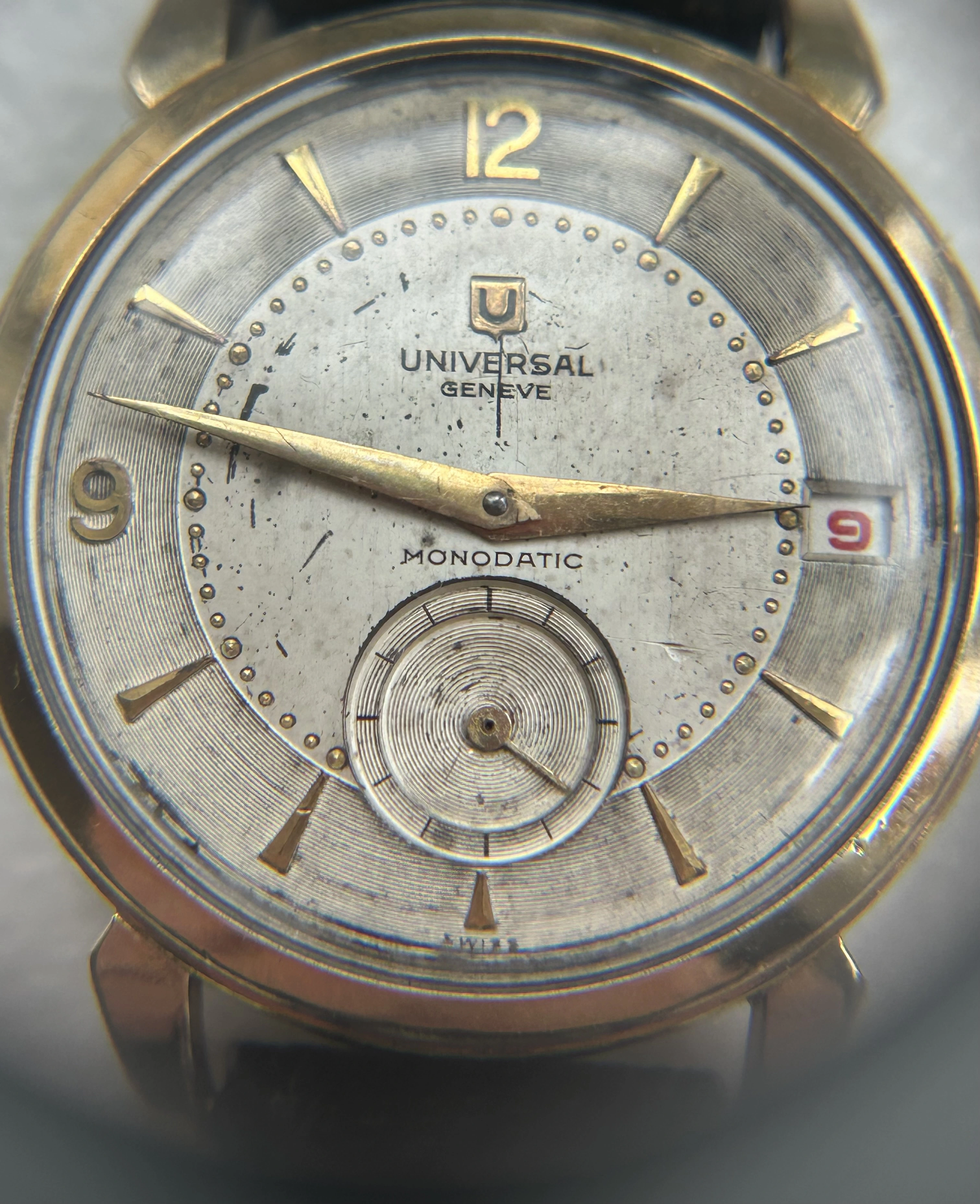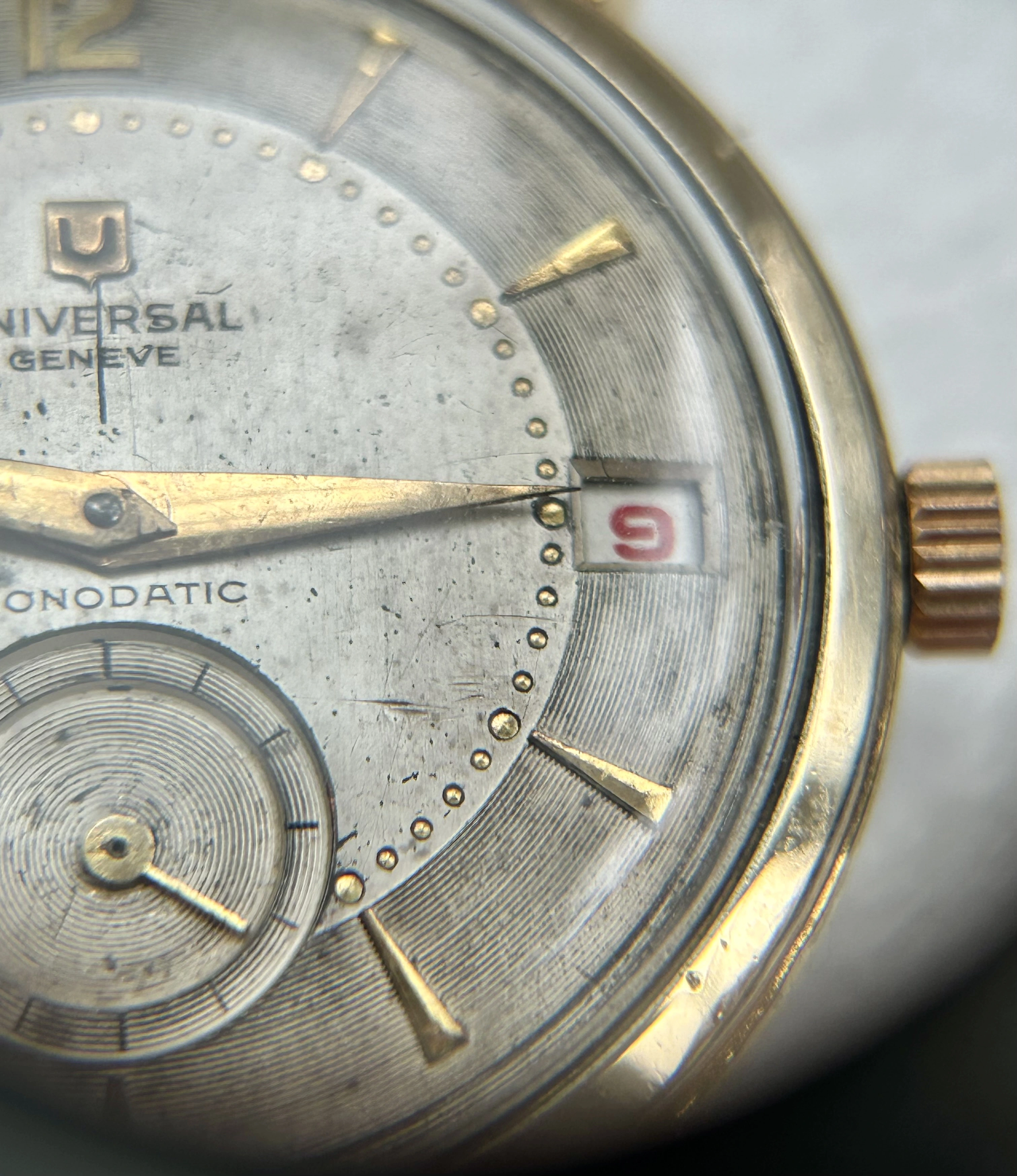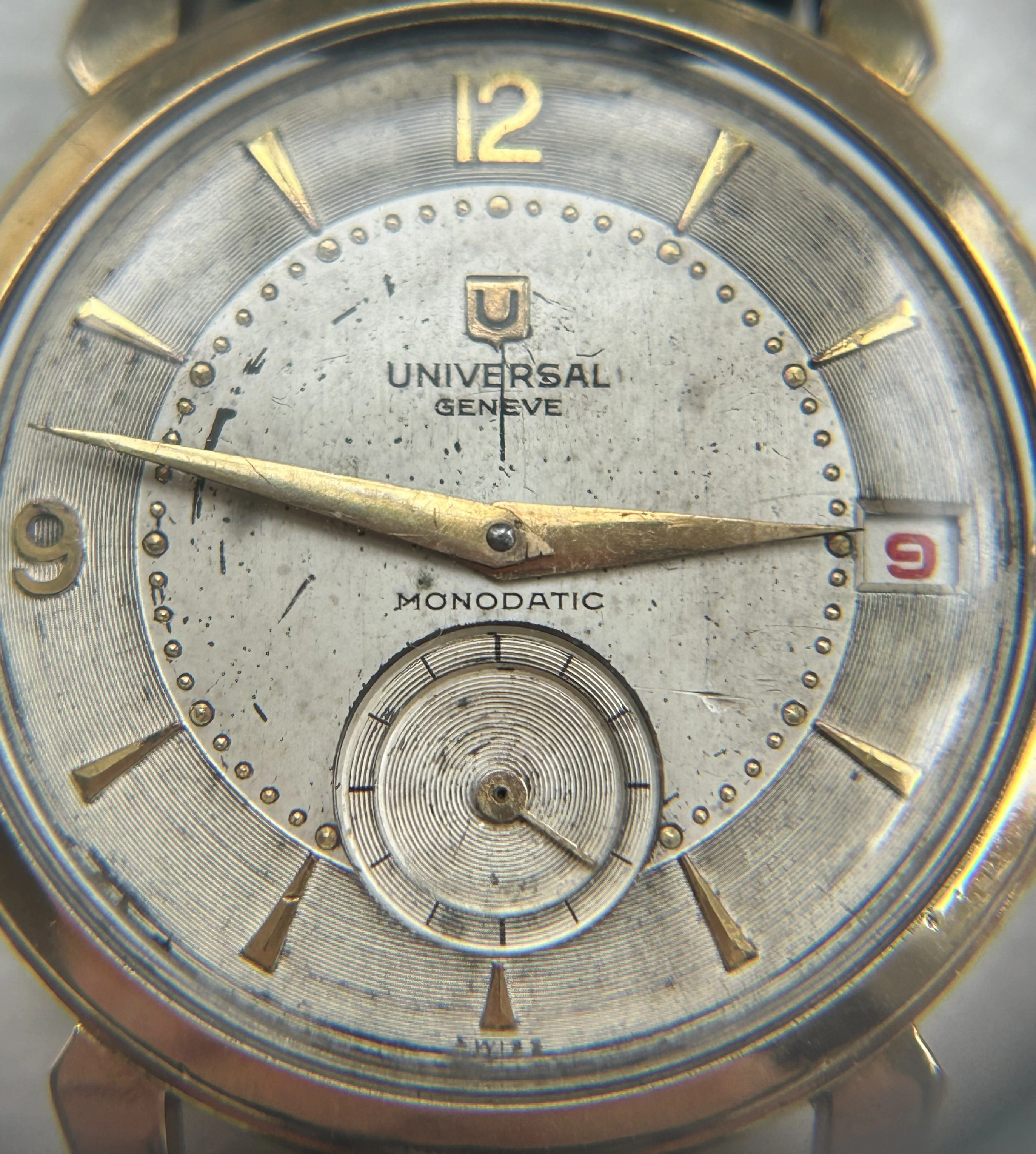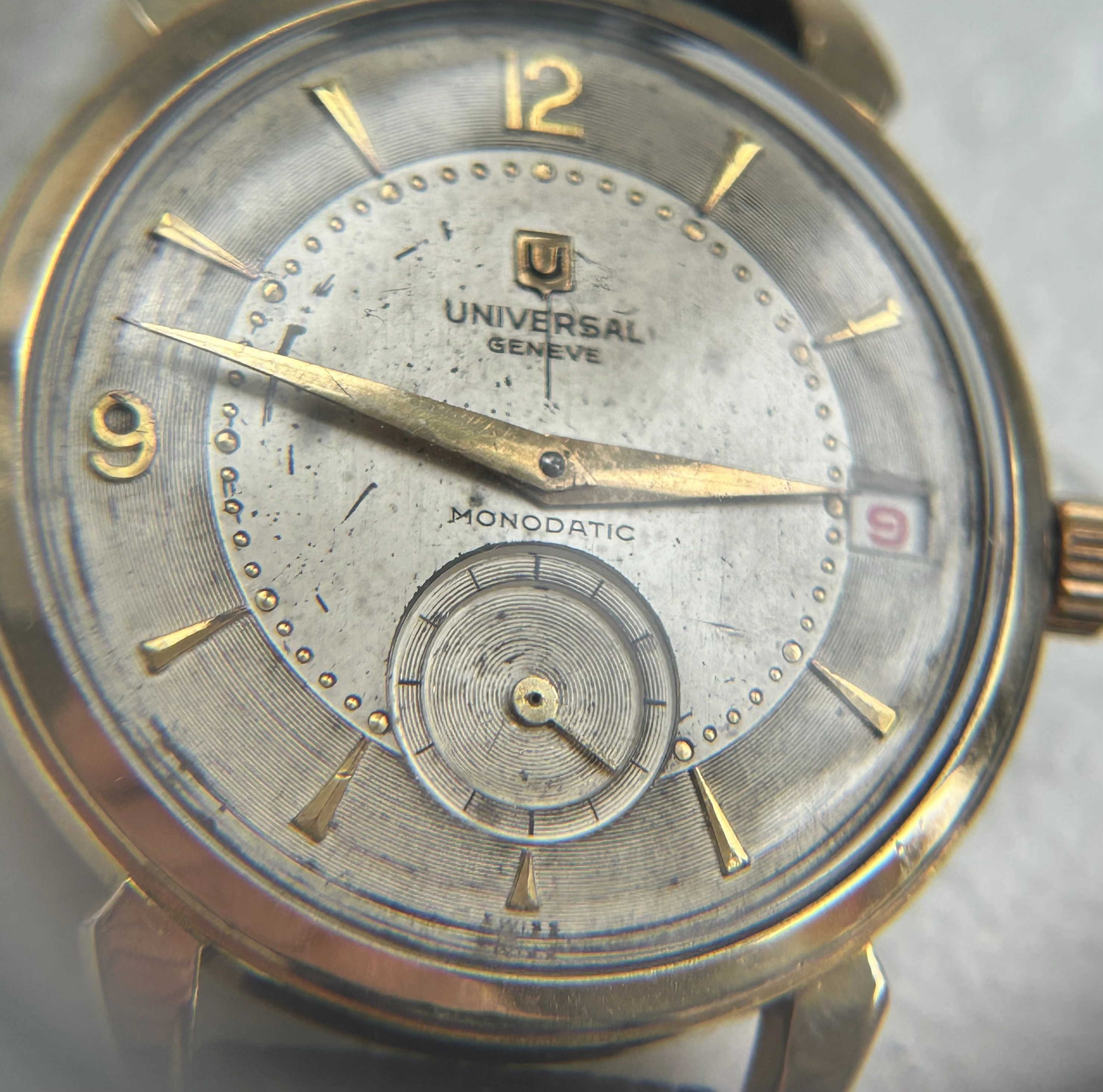 Offering a beautifully patinaed Universal Genève Monodatic ref. 400101 - gold-capped case with the elegant, angular “dog-leg” lugs this model is rightly loved for.