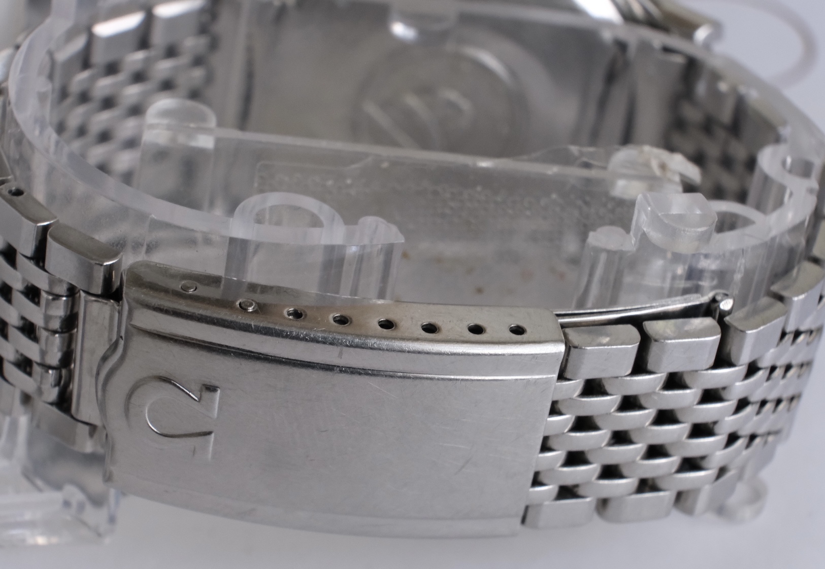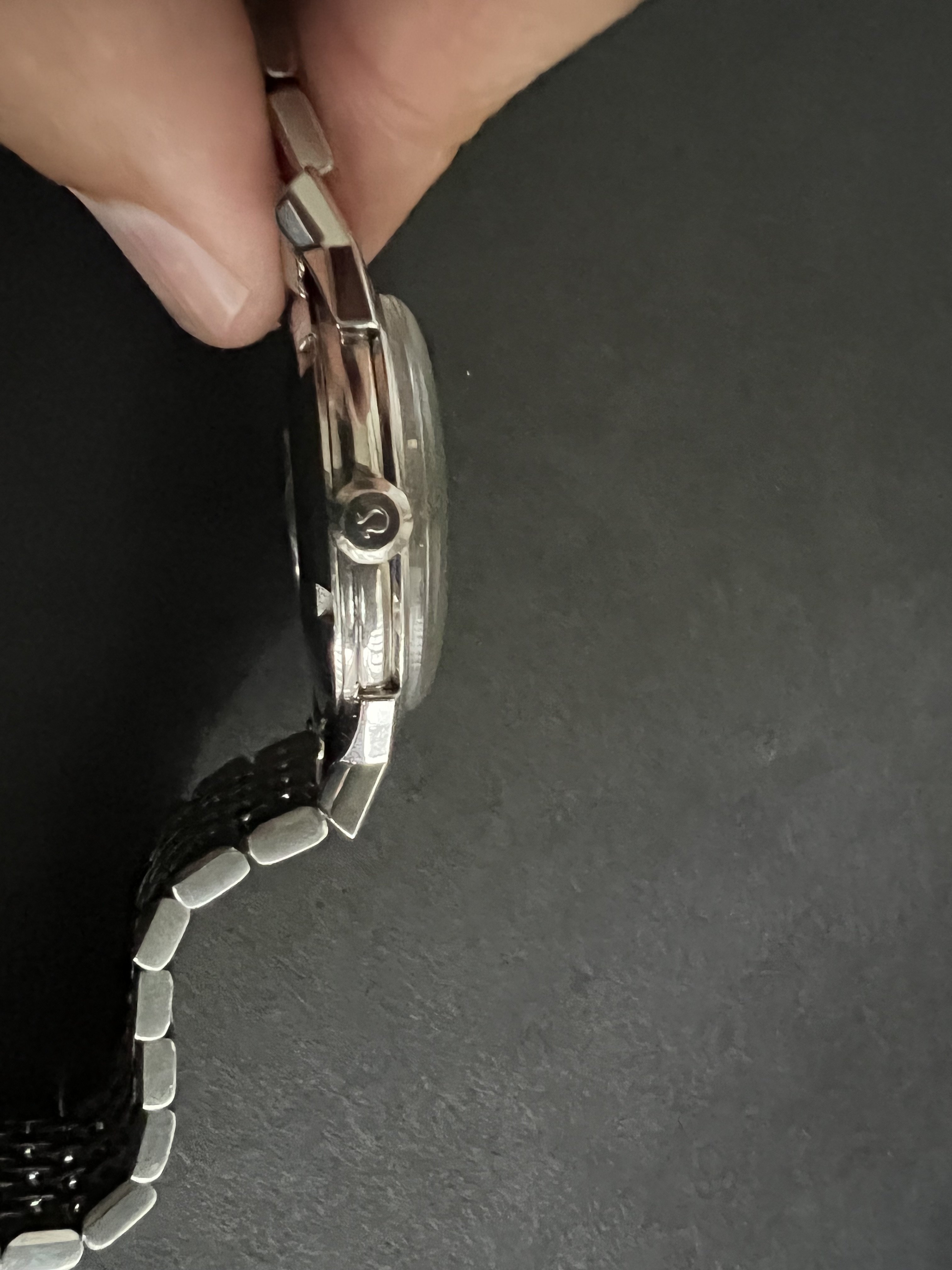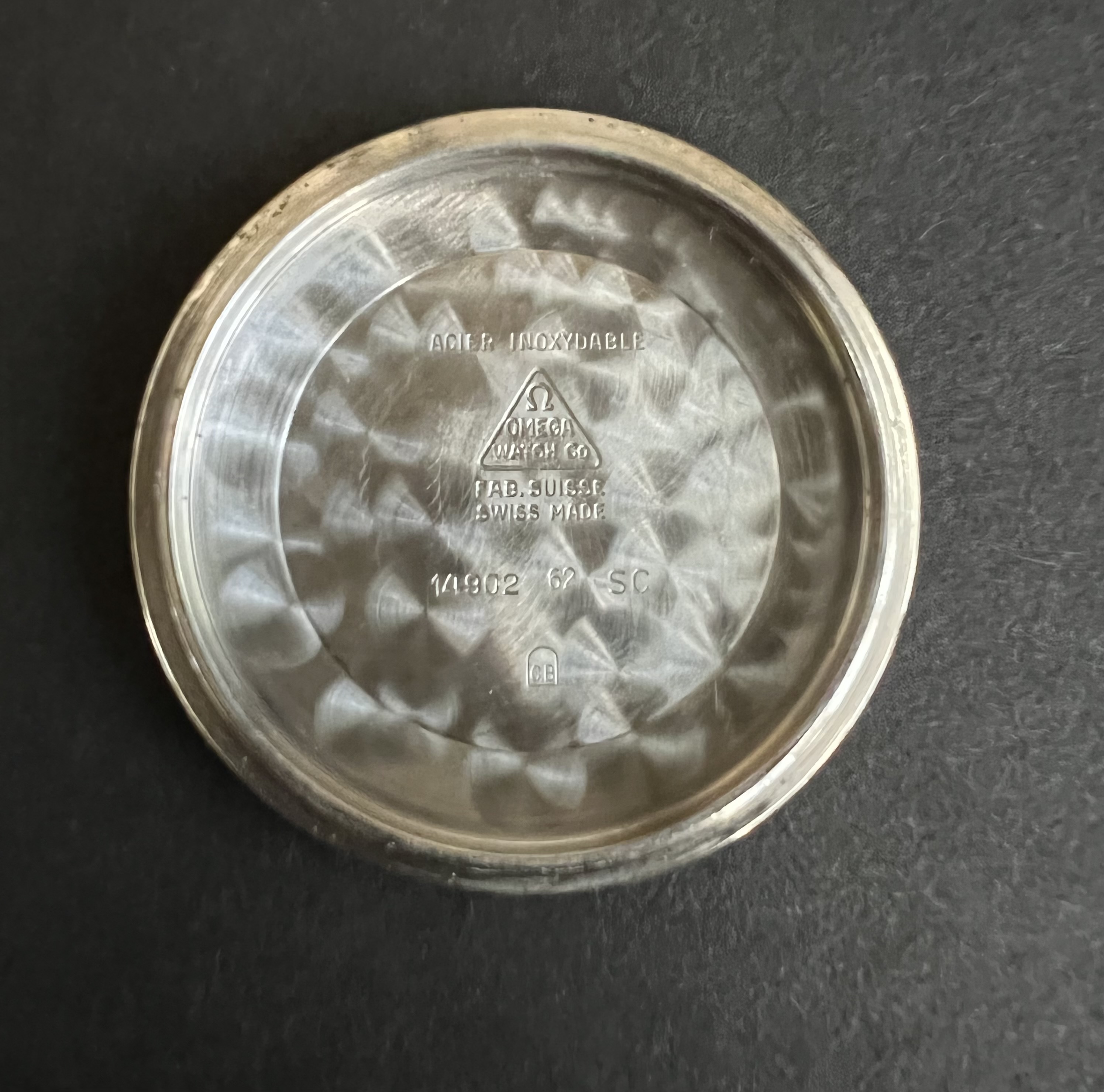 Original crystal, signed, as can be seen in the last two pics. Some regular scratches - the only of note is what looks to be a crack from the inside of the crystal, that under a loop doesn't go all the way through. I opted not to replace and keep it original. Hard to capture, but can be seen right at the bottom by "Swiss Made"