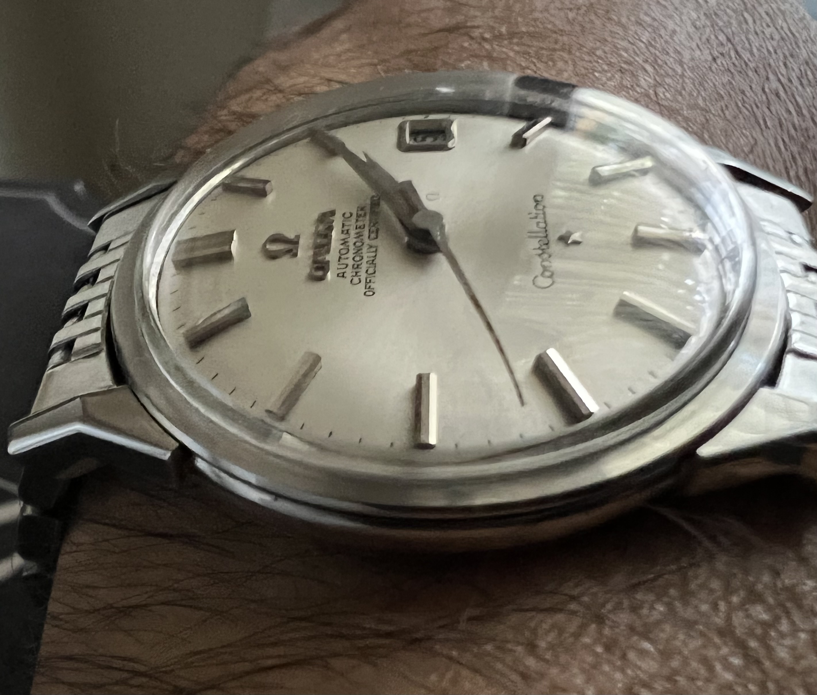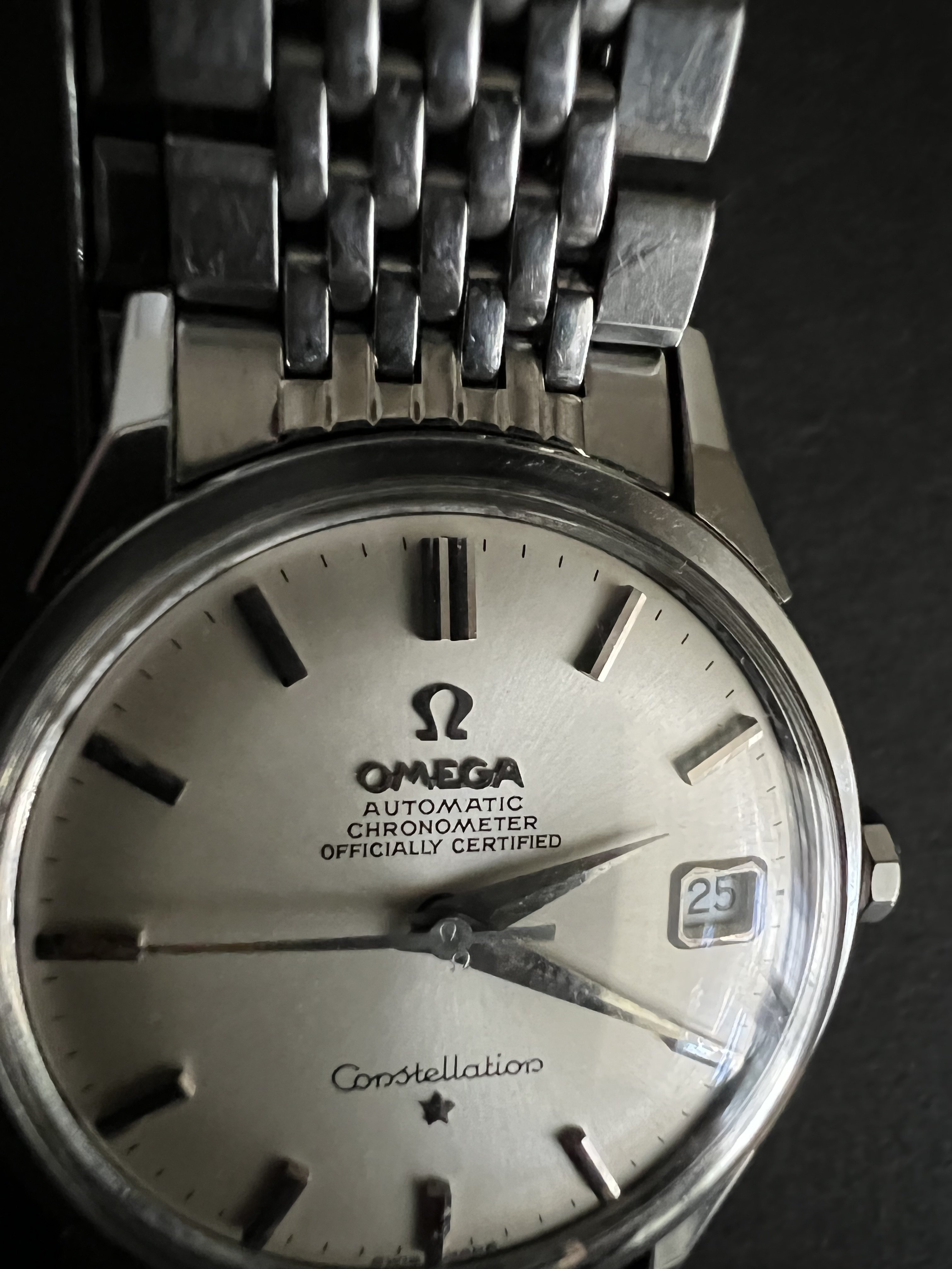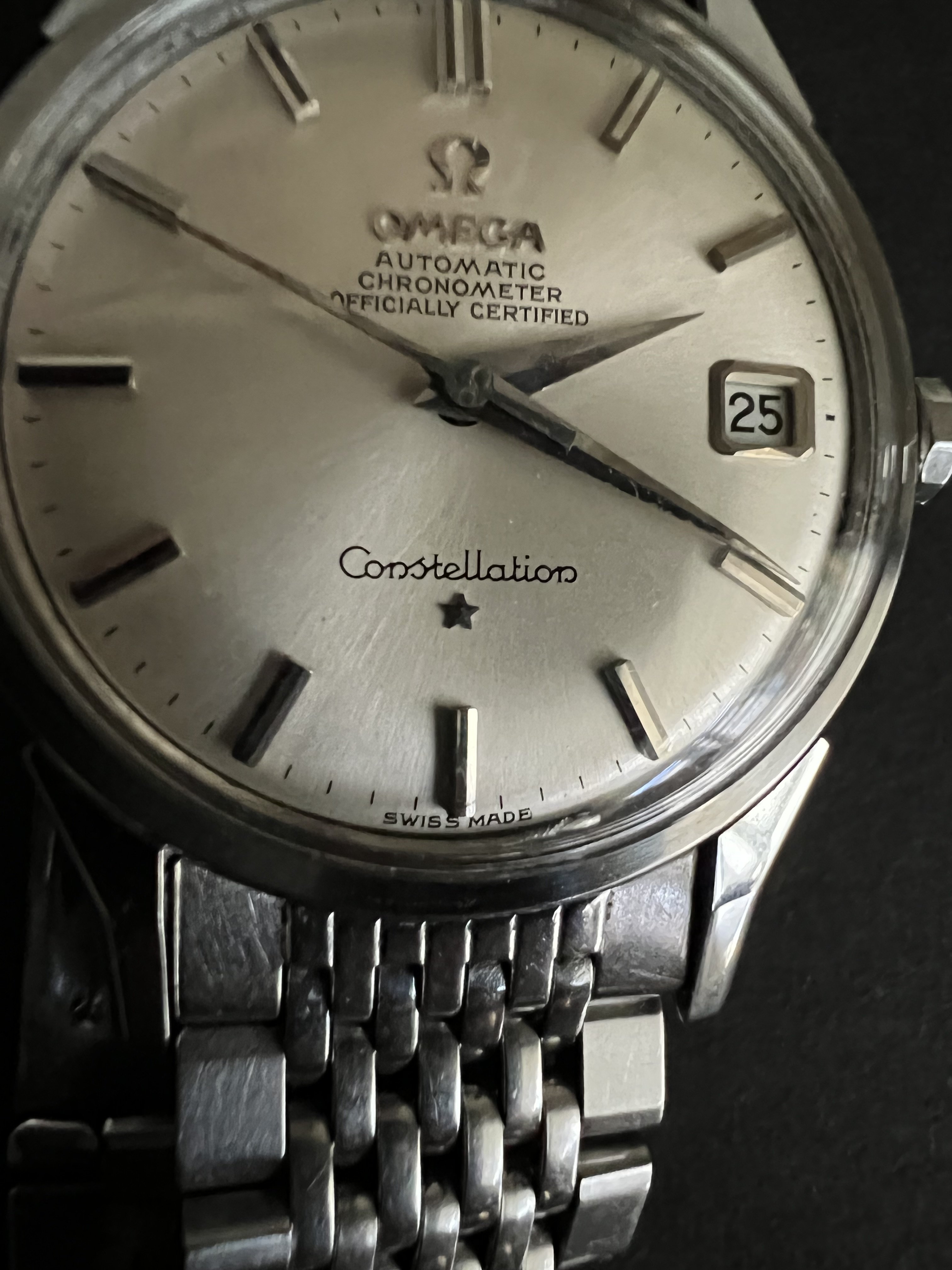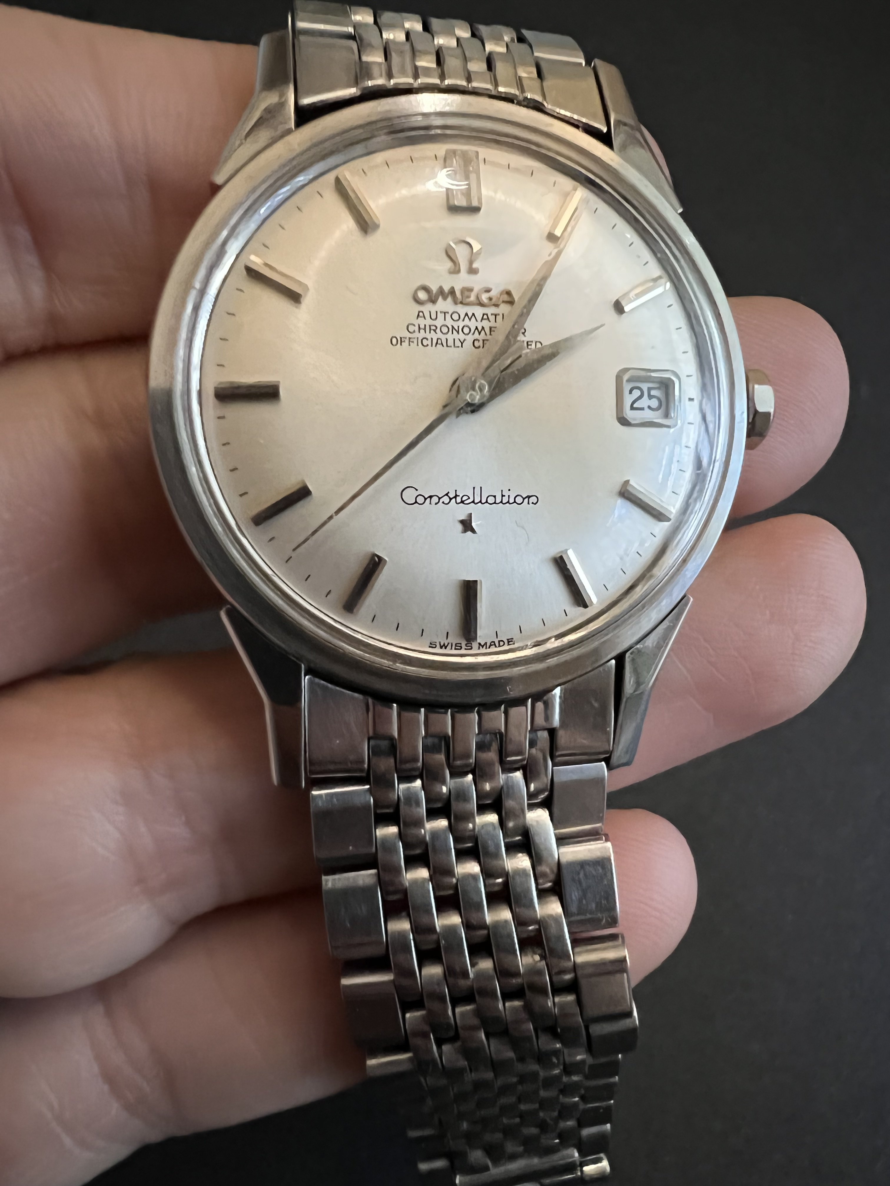 Offering up my 1966 Omega Constellation, reference 14902 62 SC with its BOR bracelet. Dog leg case with the dome dial - and a BEAUTIFUL dial it is! Case is beautiful as well, with nice defined lines and a very crisp medallion. Lots o' pics!