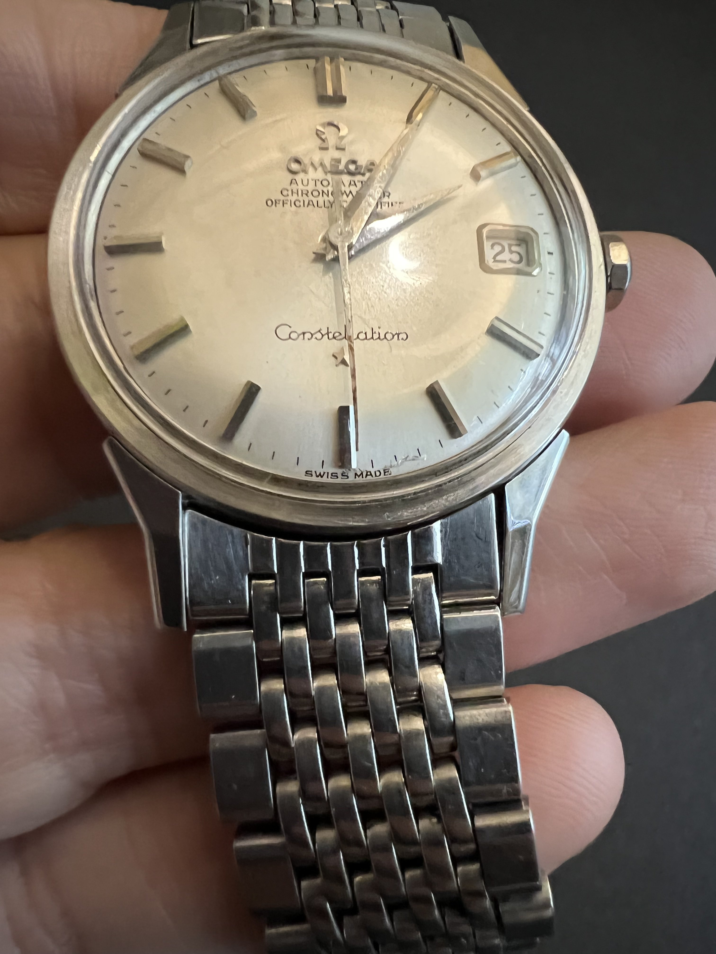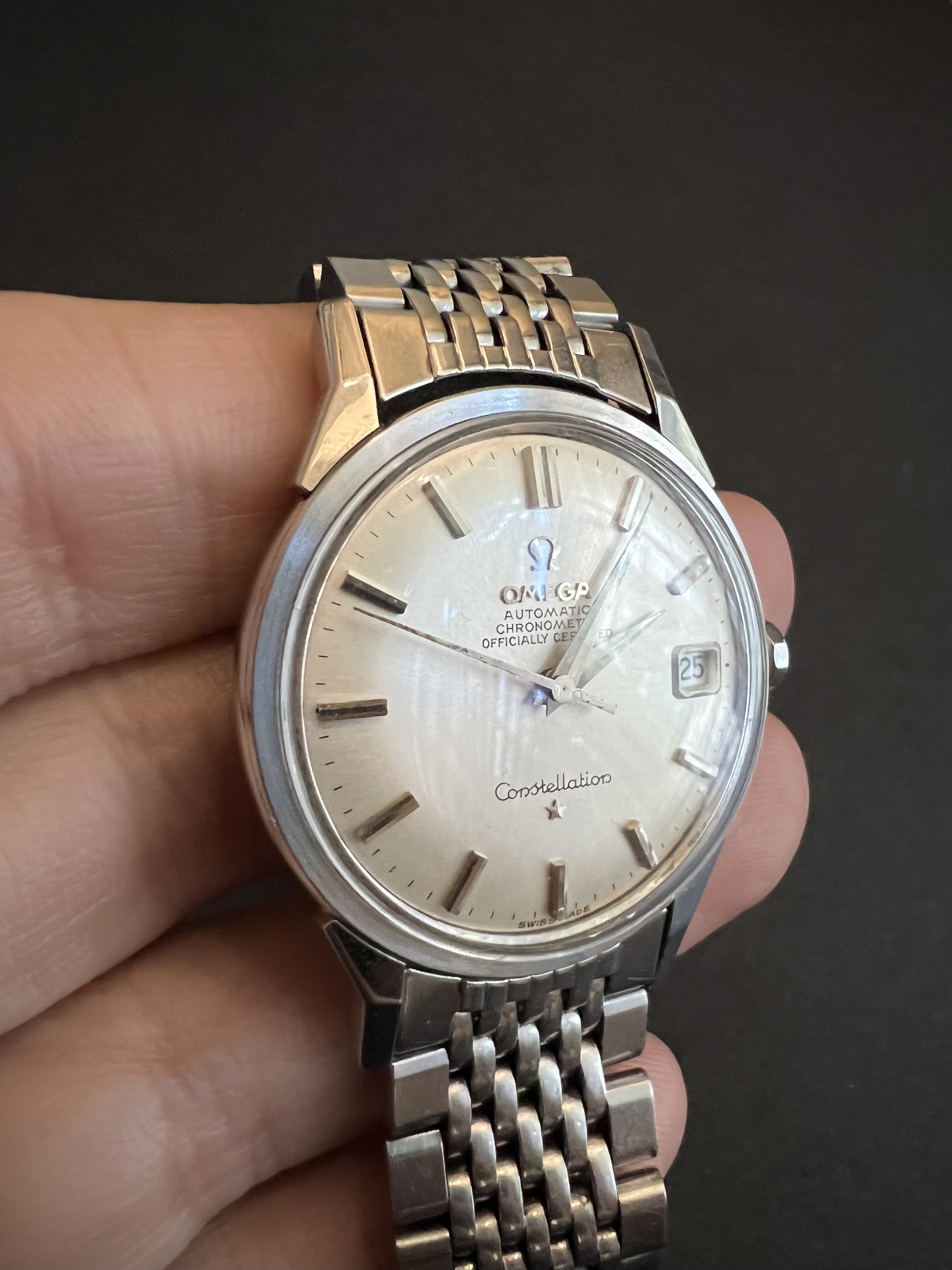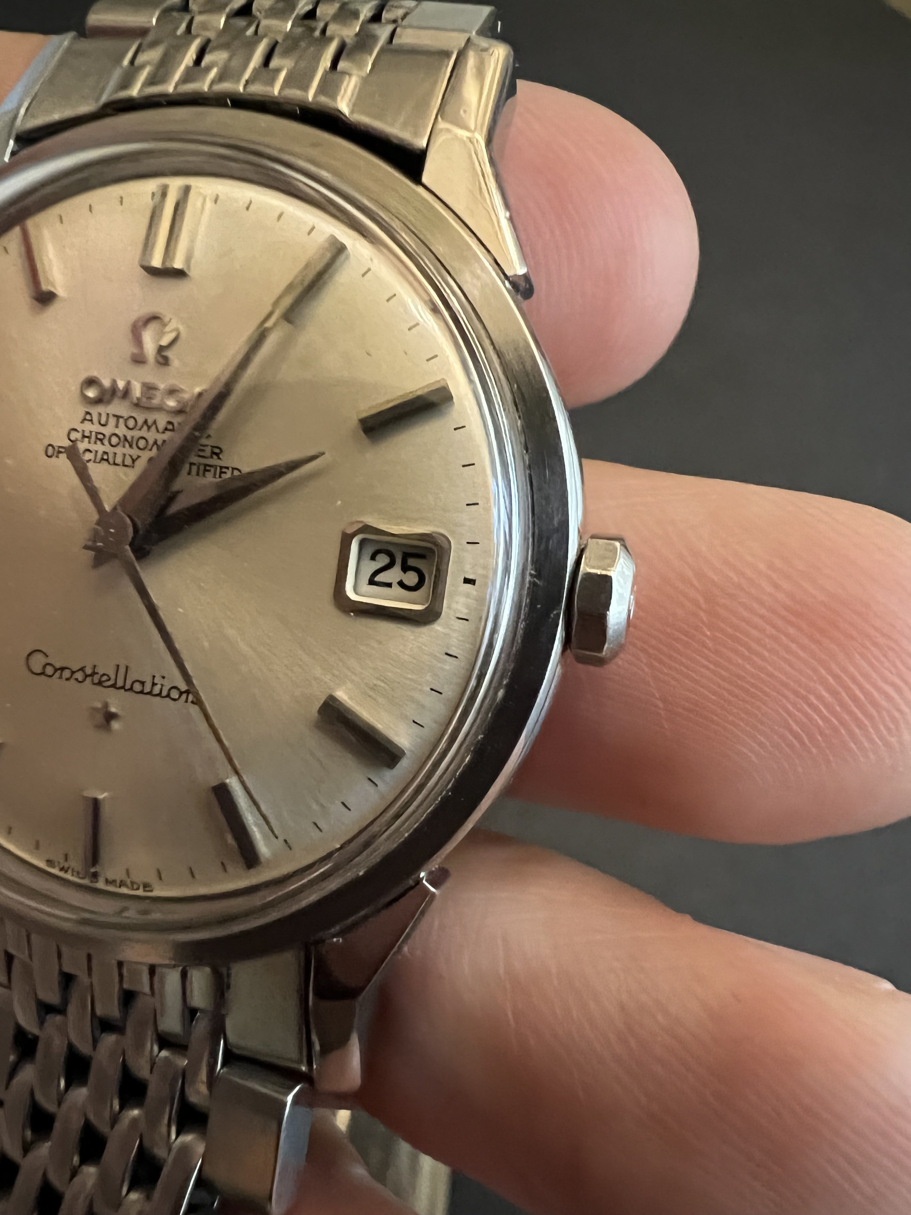 Offering up my 1966 Omega Constellation, reference 14902 62 SC with its BOR bracelet. Dog leg case with the dome dial - and a BEAUTIFUL dial it is! Case is beautiful as well, with nice defined lines and a very crisp medallion. Lots o' pics!