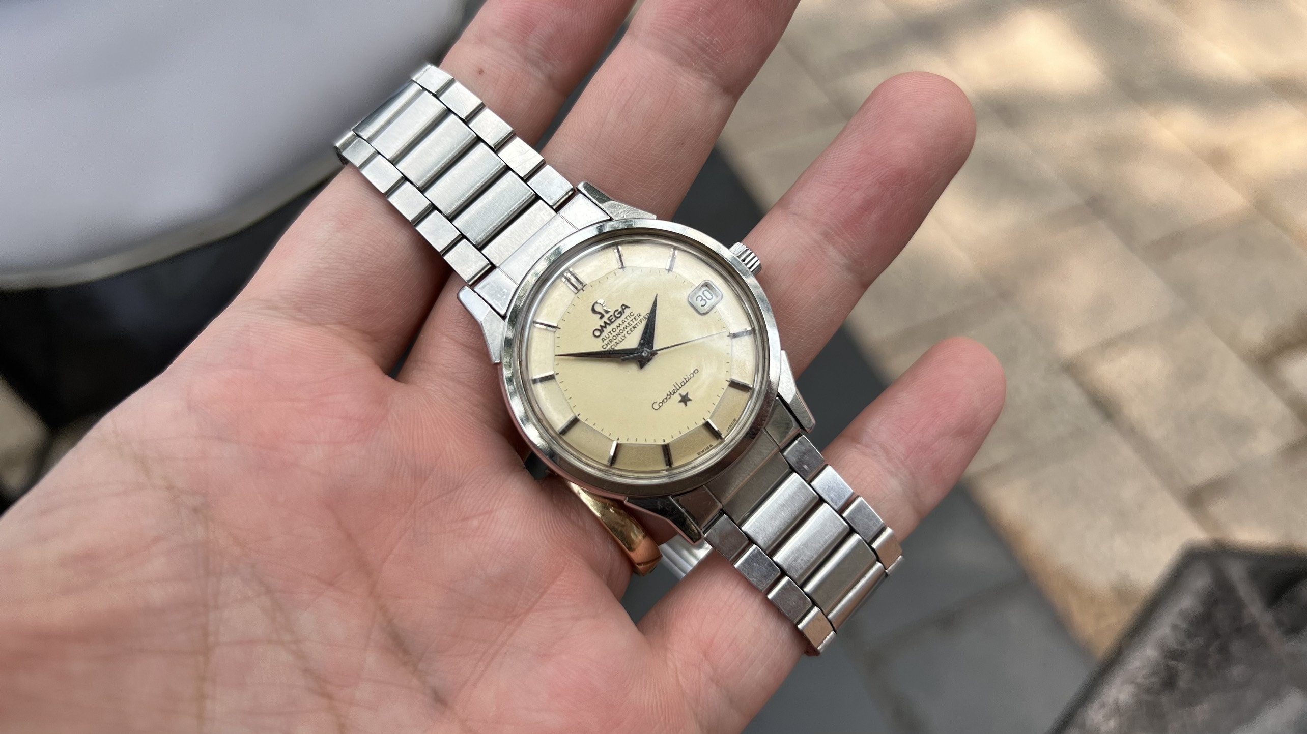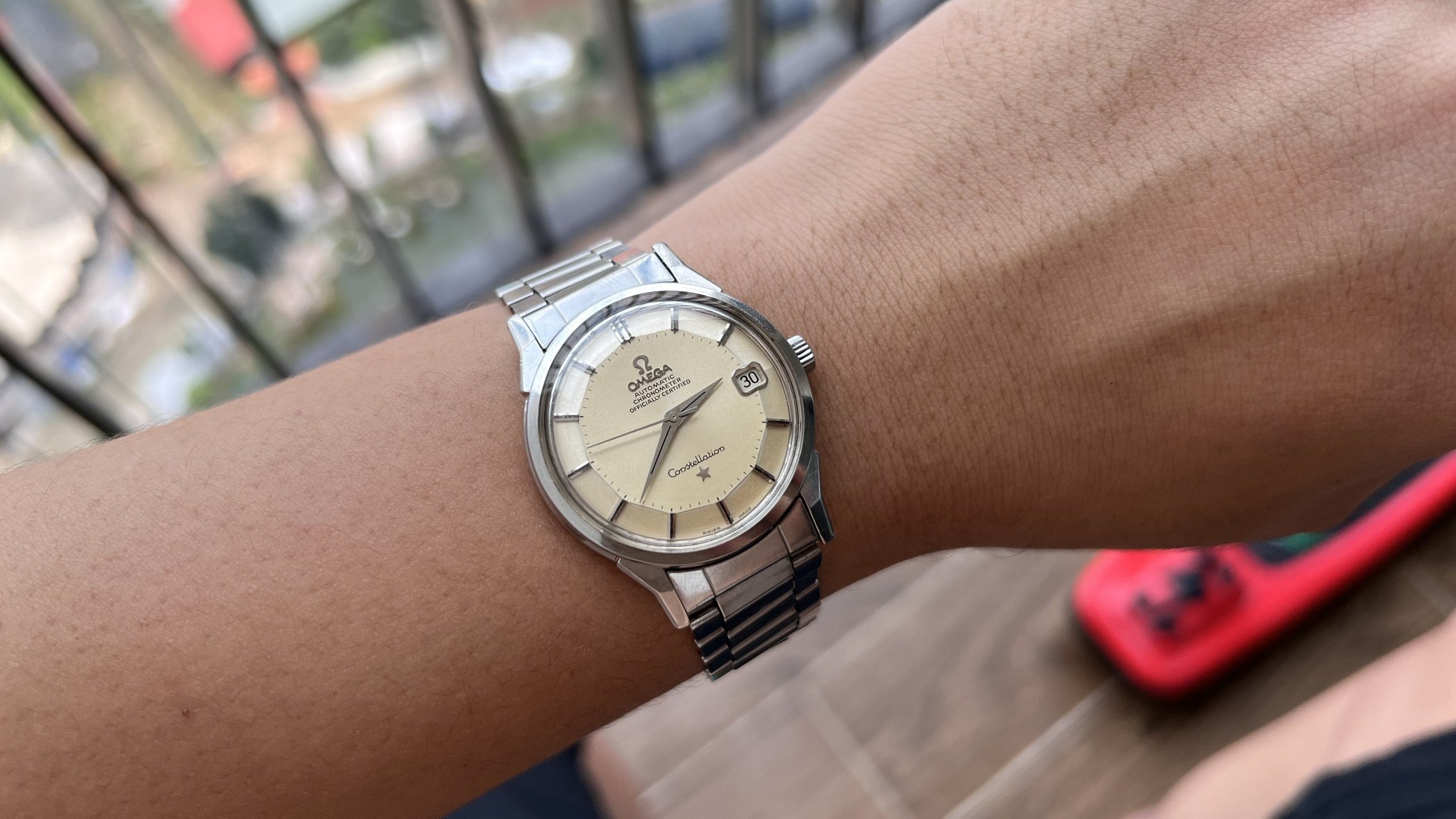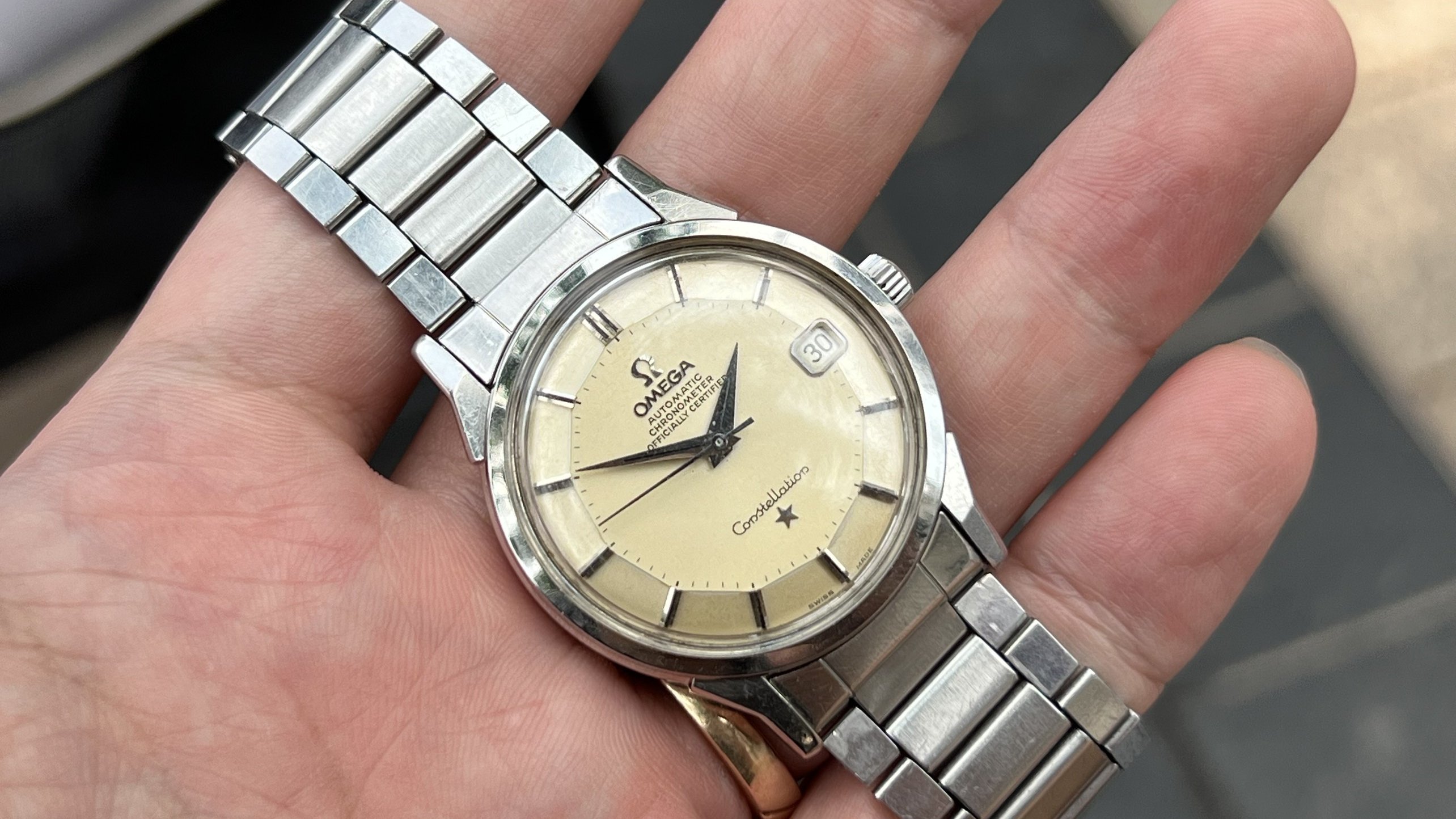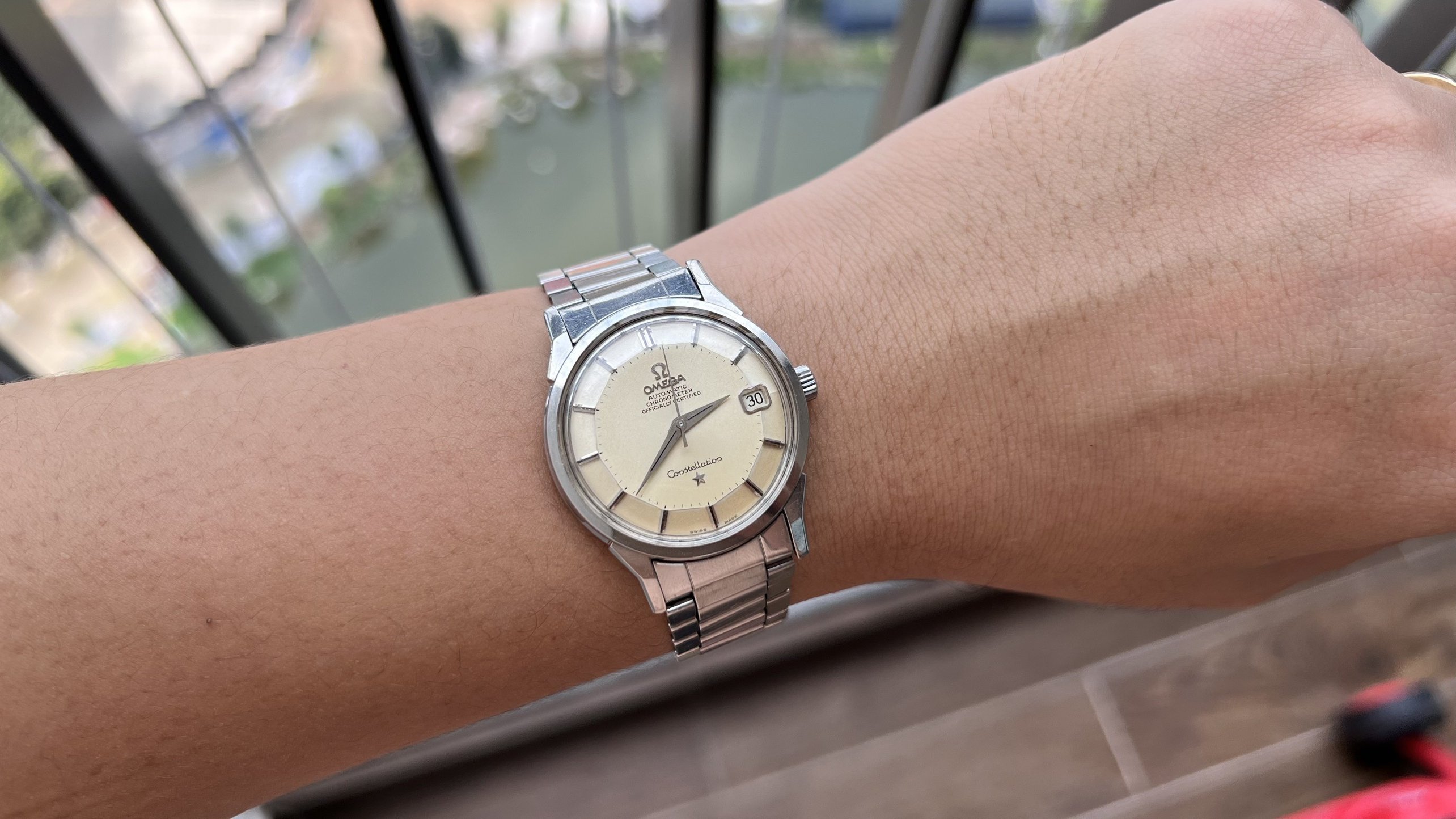 Brand: Omega, Model: Constellation, Reference No.: 168.005, Movement: Omega Chronometer Automatic Cal. 564, S.N: 25'XXX'XXX dating the watch to arround 1967