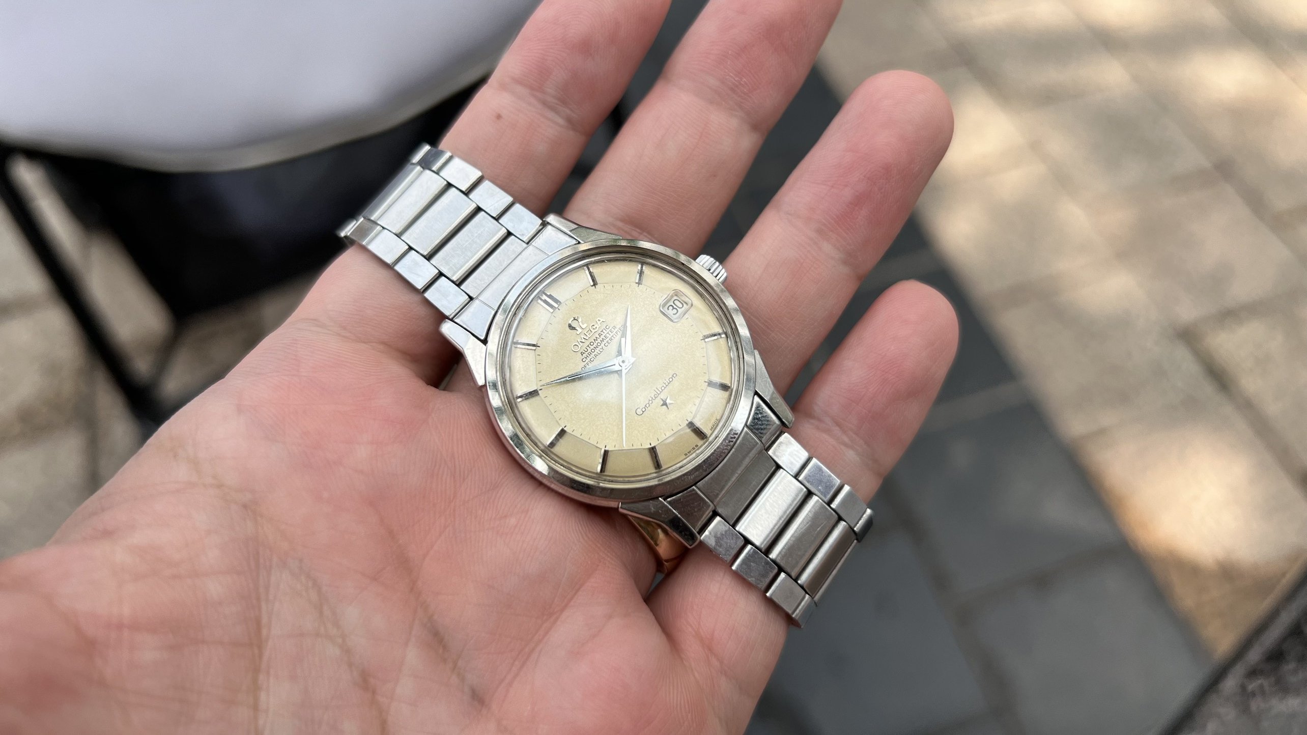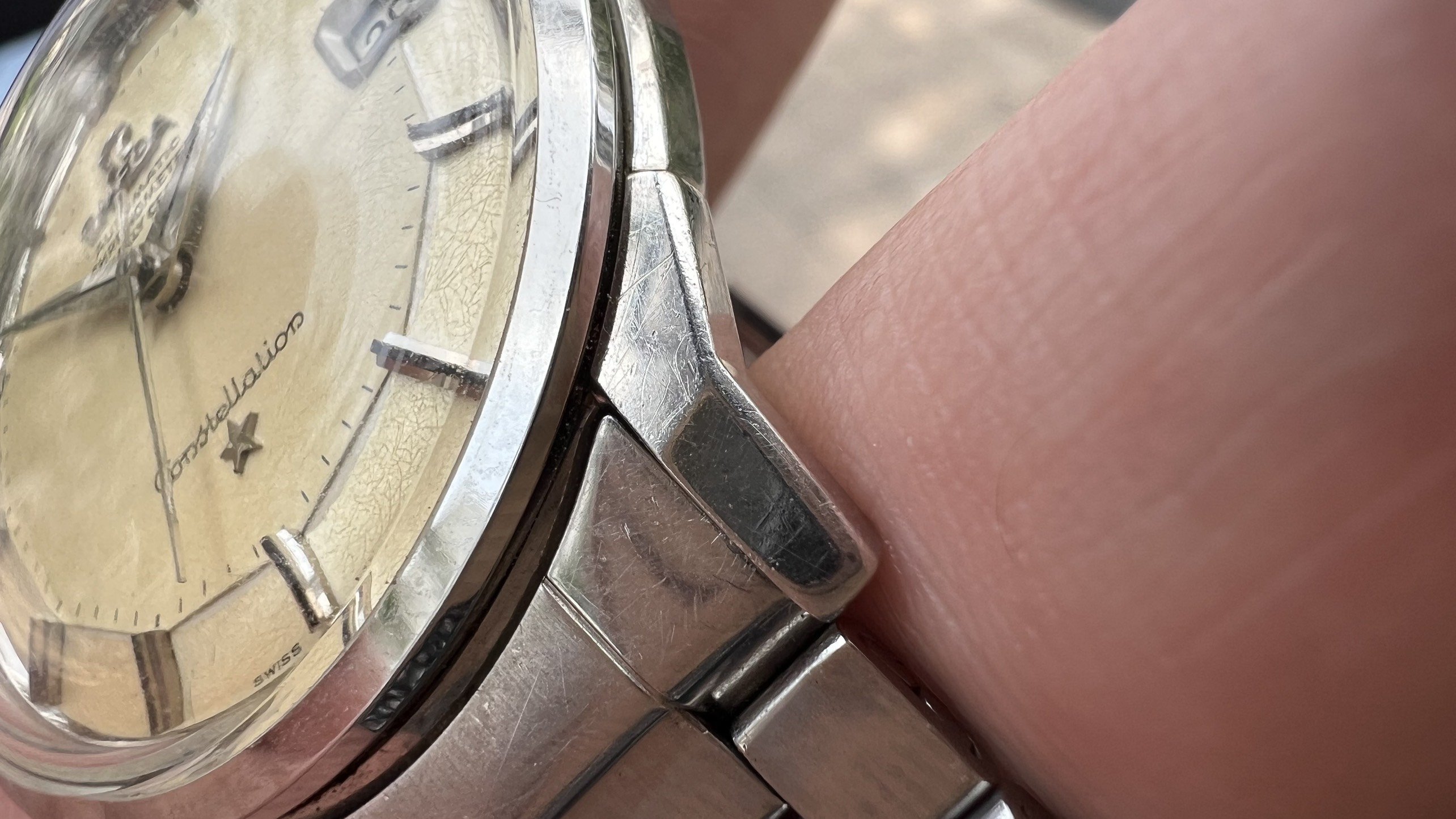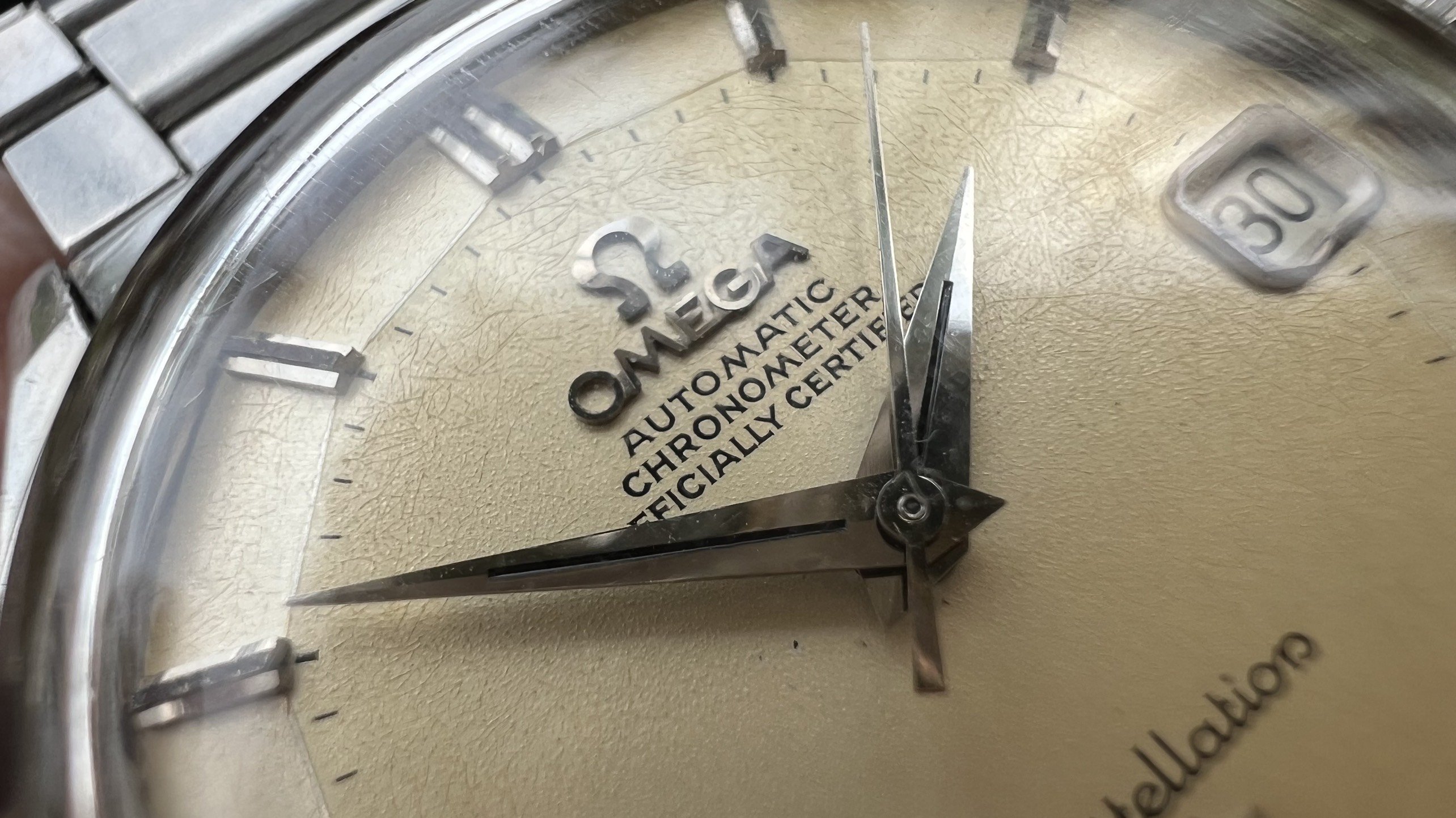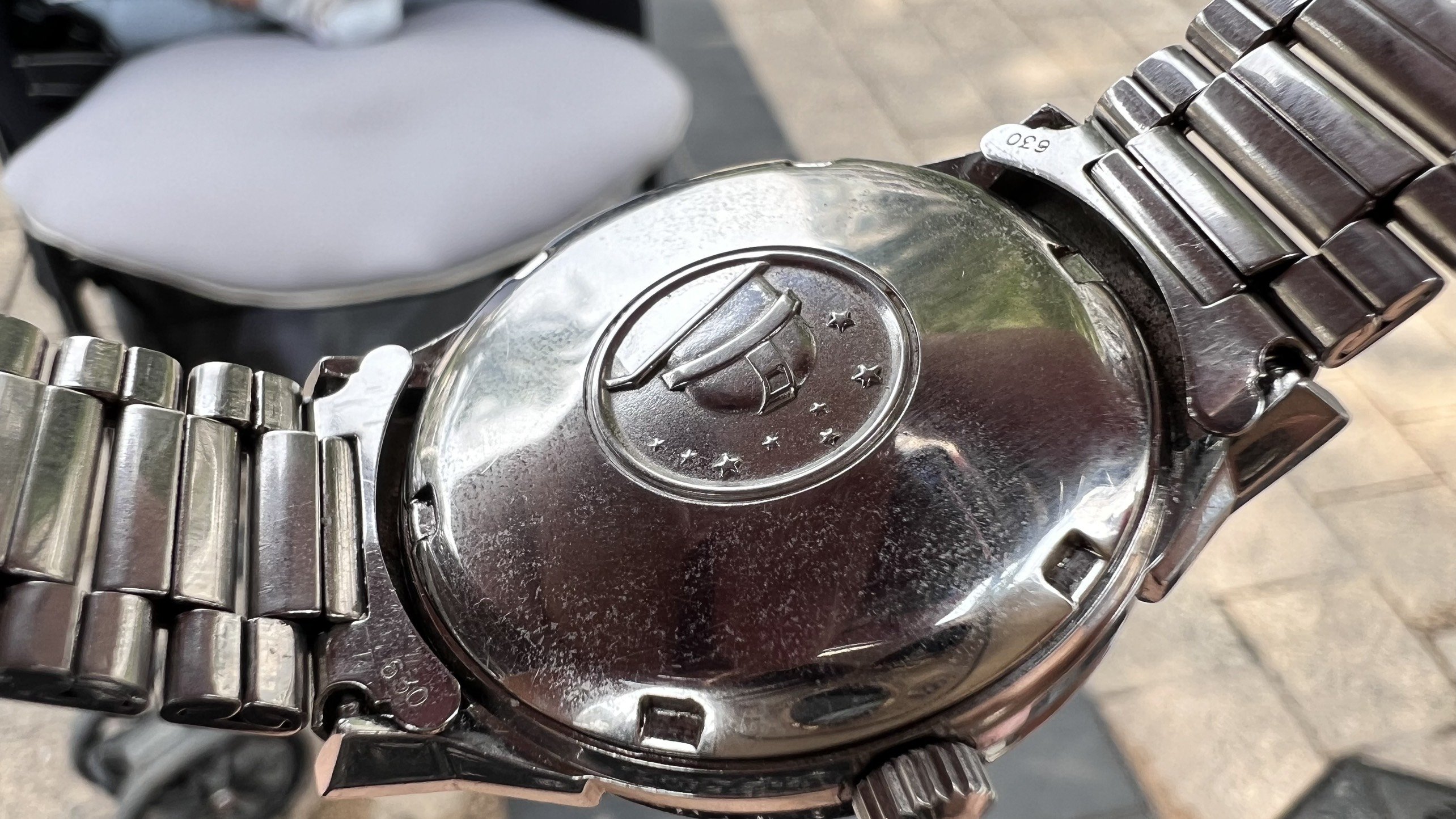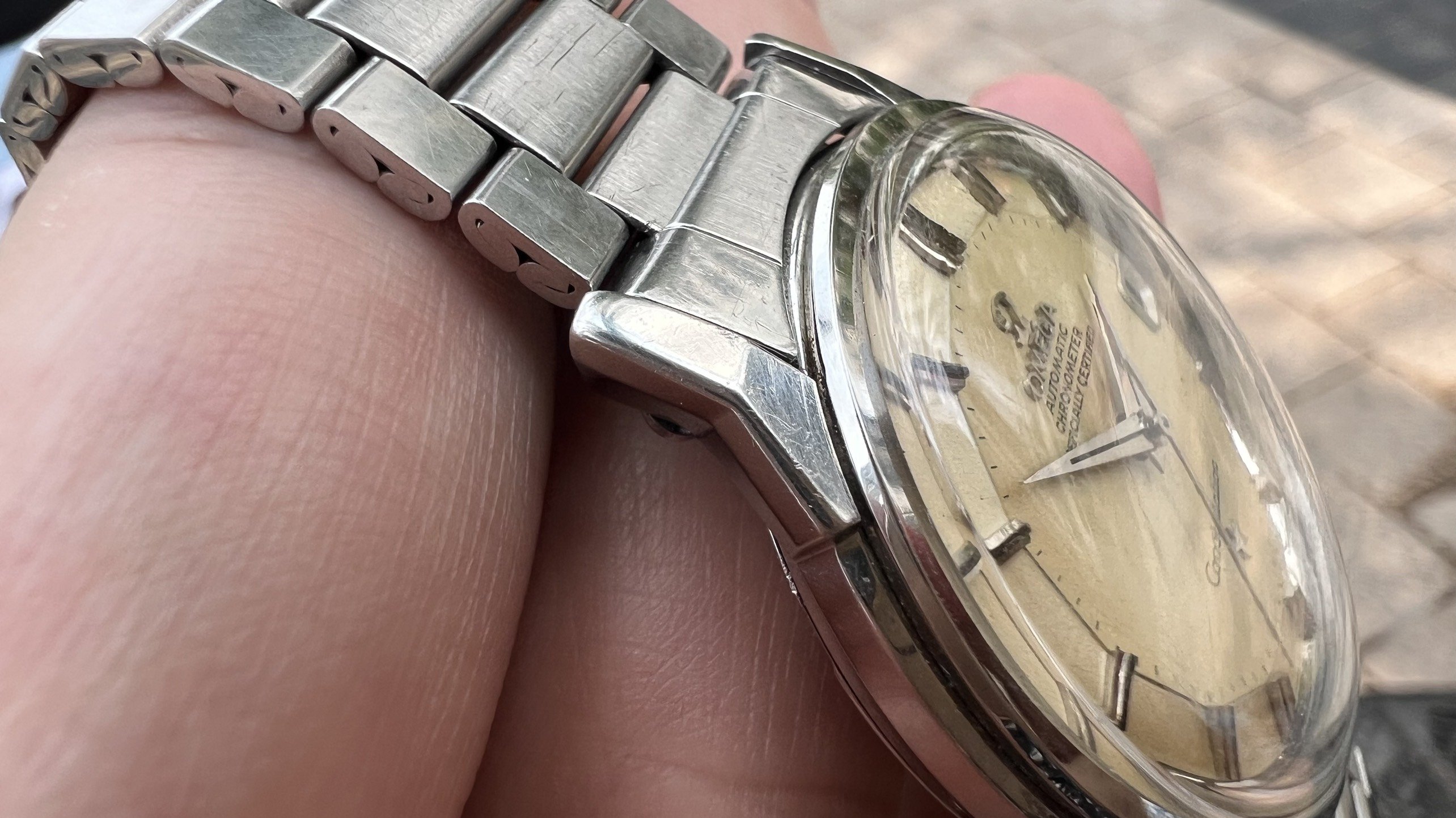 Bracelet: Original Omega Flat link bracelet ref. 1035 with 630 endlinks, stamped 4/71. These often seen on Speedmasters, however they looks really good on 50s-60s Connies like 14381,14393, 2852,168.005,167.005, Ranchero...