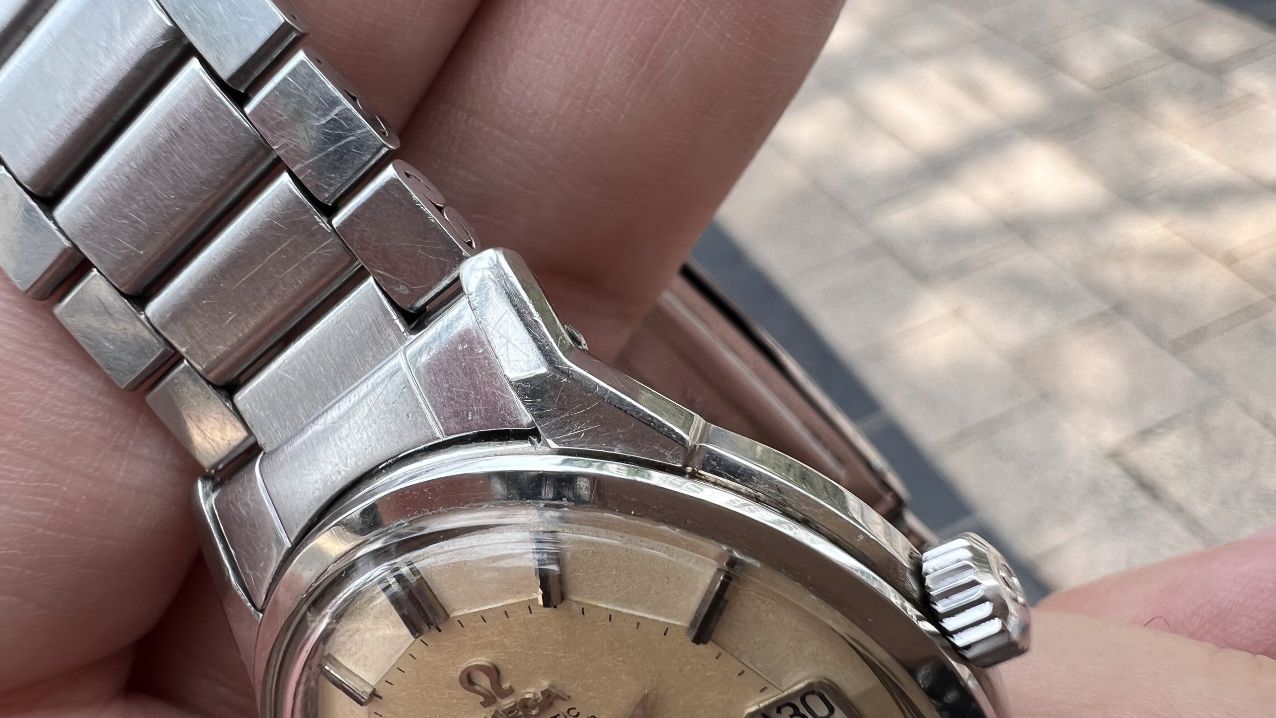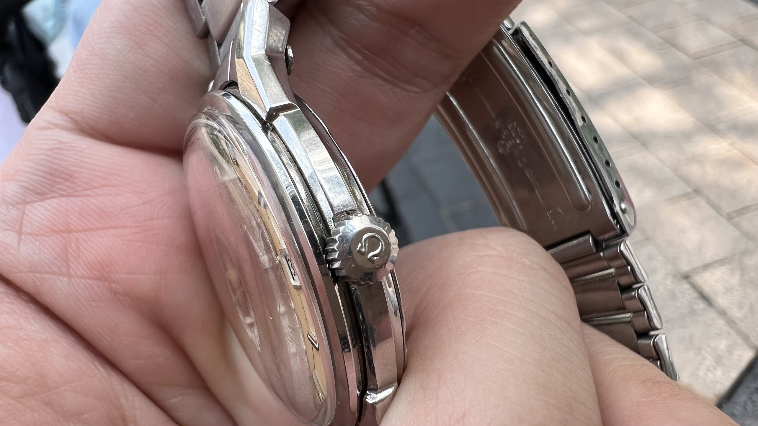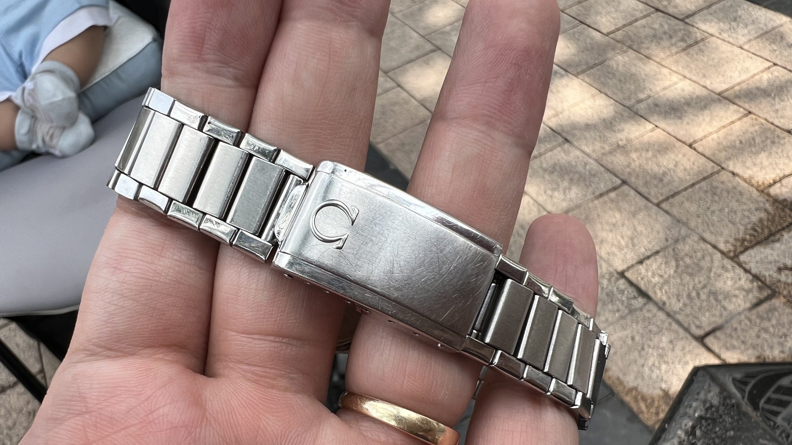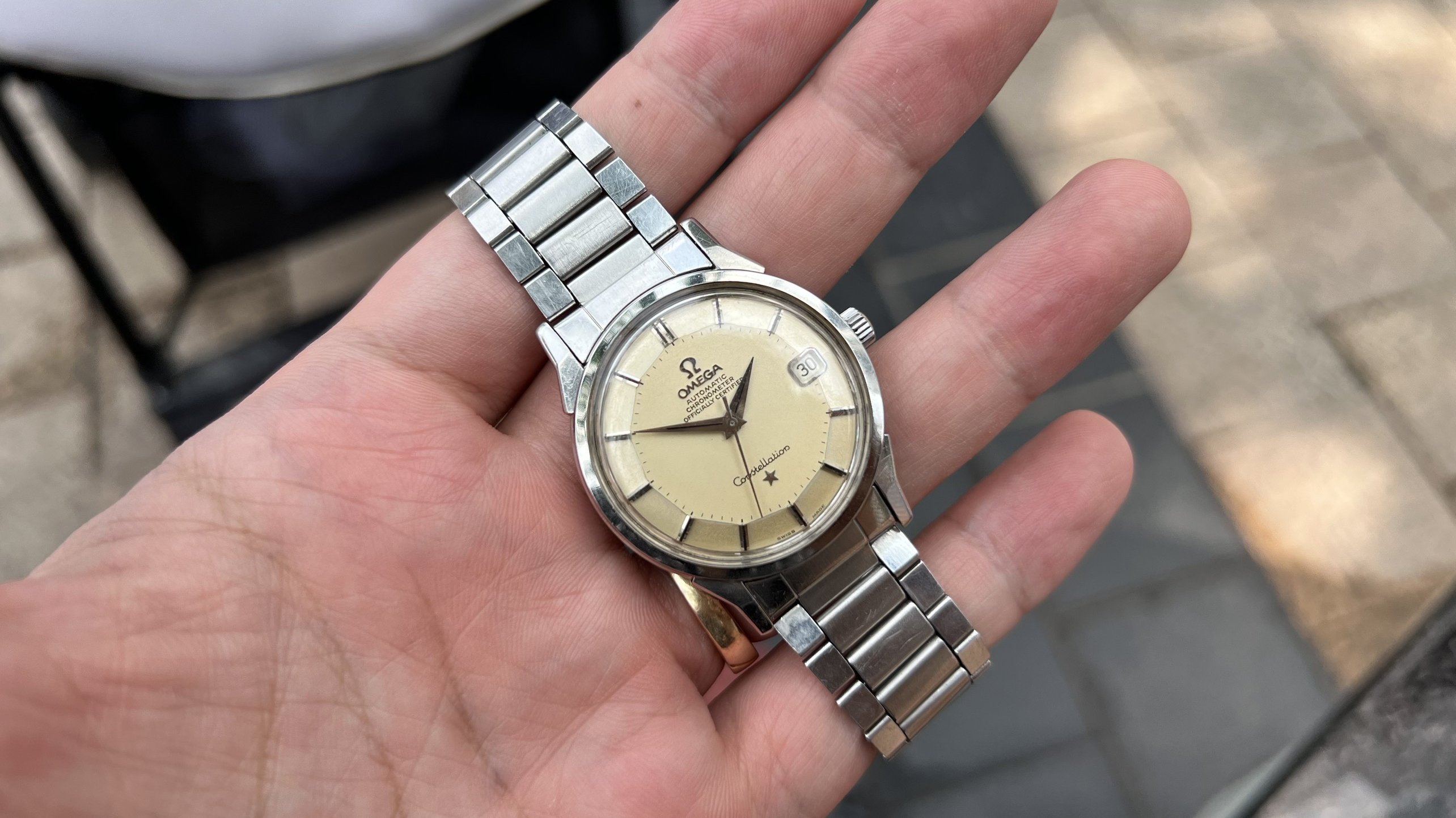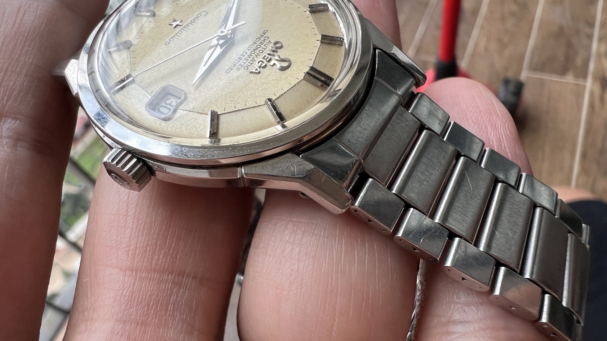 Bracelet: Original Omega Flat link bracelet ref. 1035 with 630 endlinks, stamped 4/71. These often seen on Speedmasters, however they looks really good on 50s-60s Connies like 14381,14393, 2852,168.005,167.005, Ranchero...