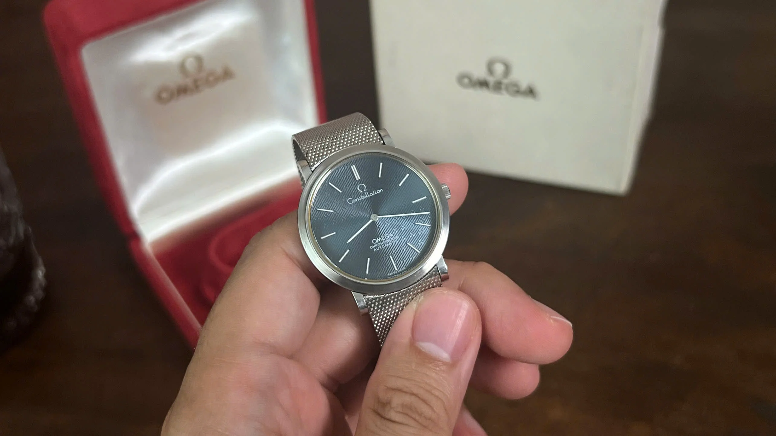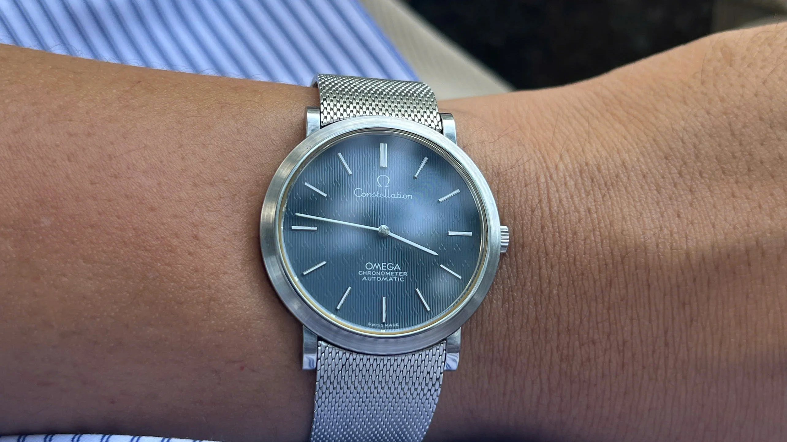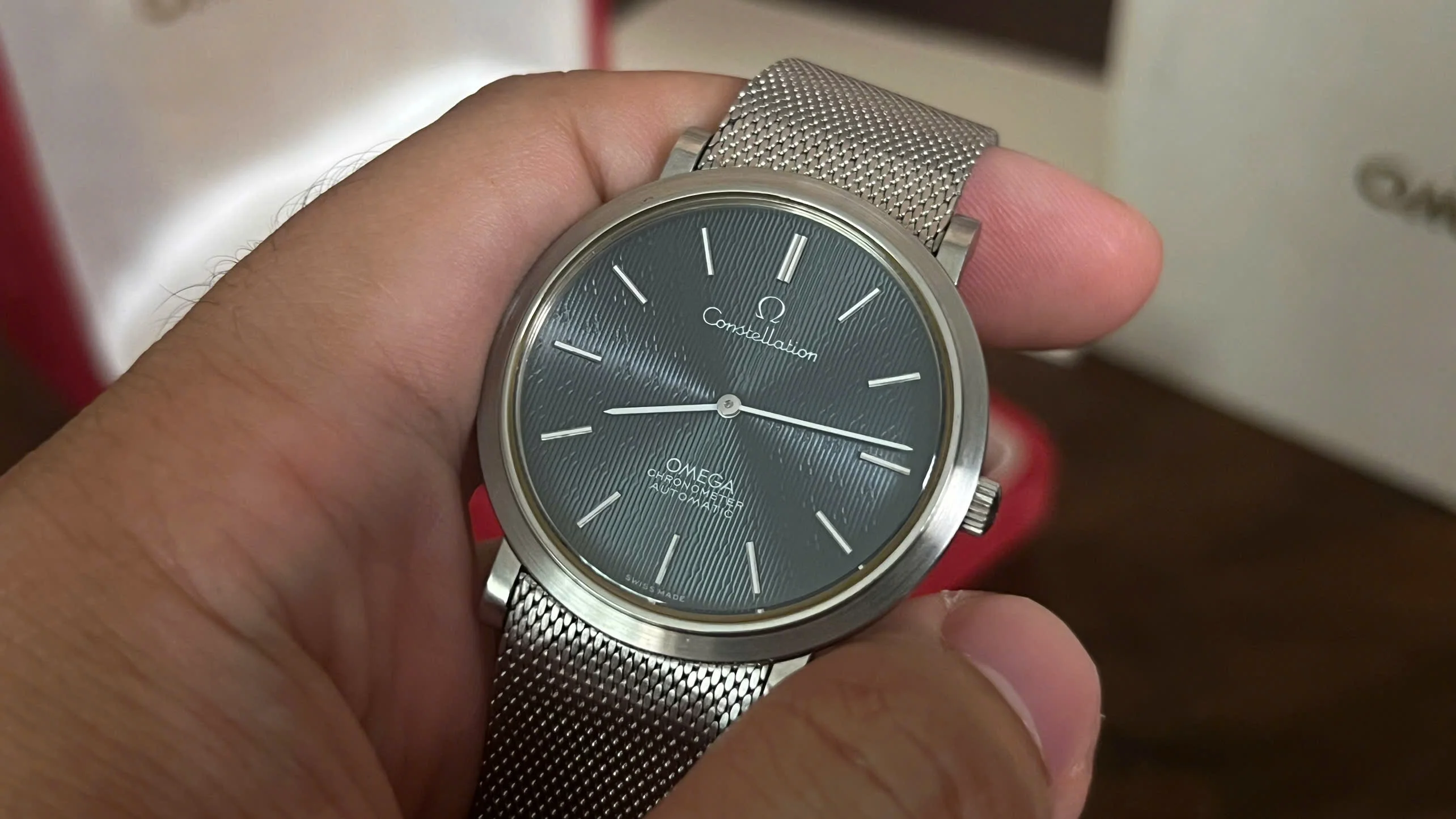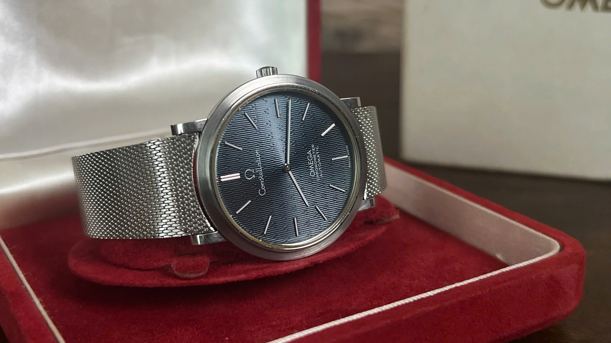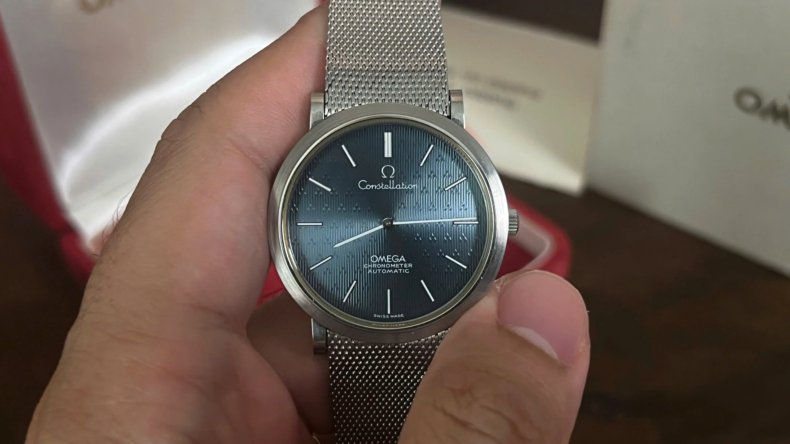For sale is a 1968 Omega Constellation ref. 157.0001, featuring the ultra-thin chronometer-rated Cal. 712 automatic movement. This reference stands out with its slim case profile and elegant design, and this example is particularly attractive with an original blue textured dial and the correct Omega mesh bracelet (ref. 2041). It also comes with the original Omega double box set (cream outer + red inner), a seldom seen bonus.