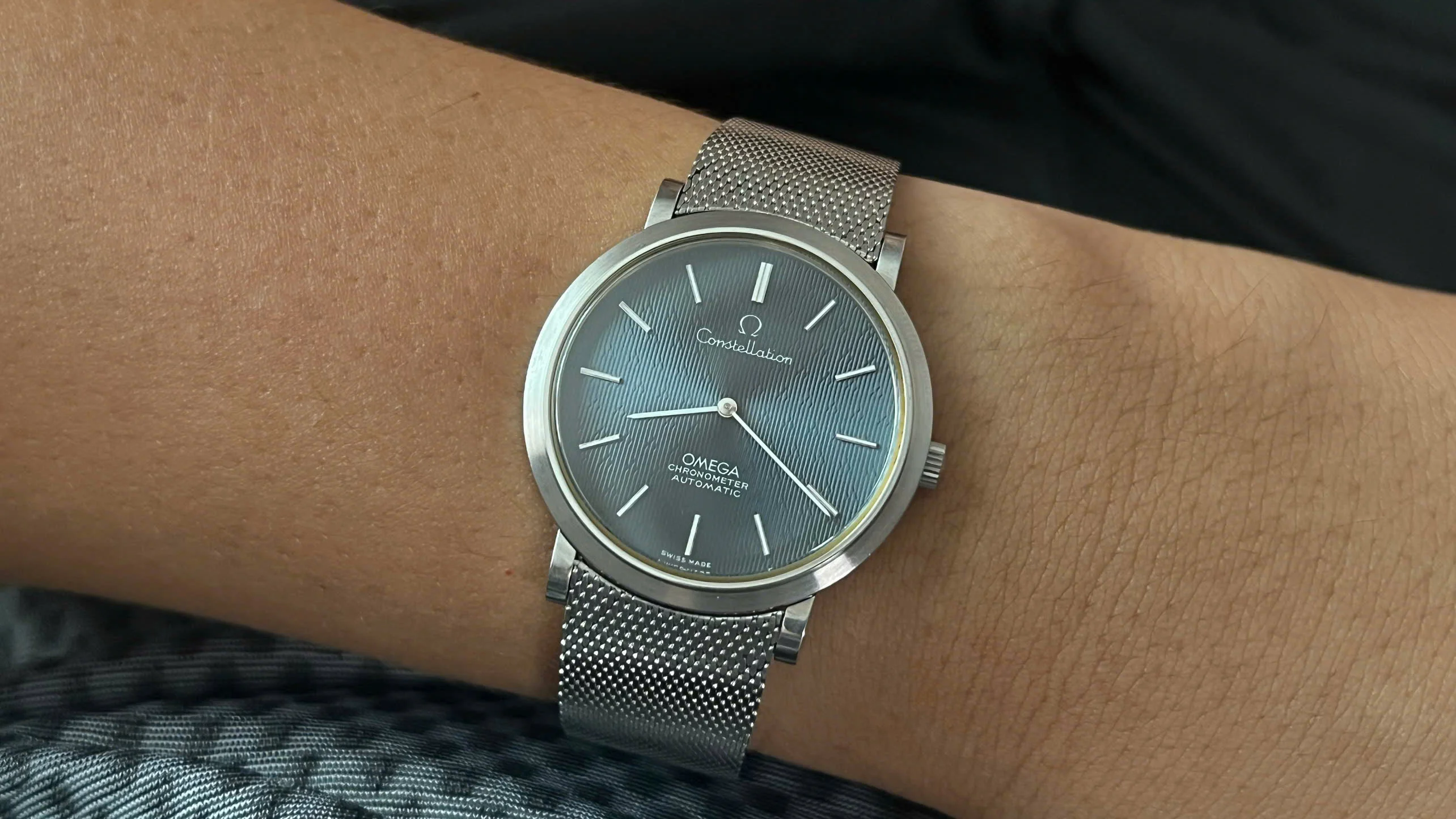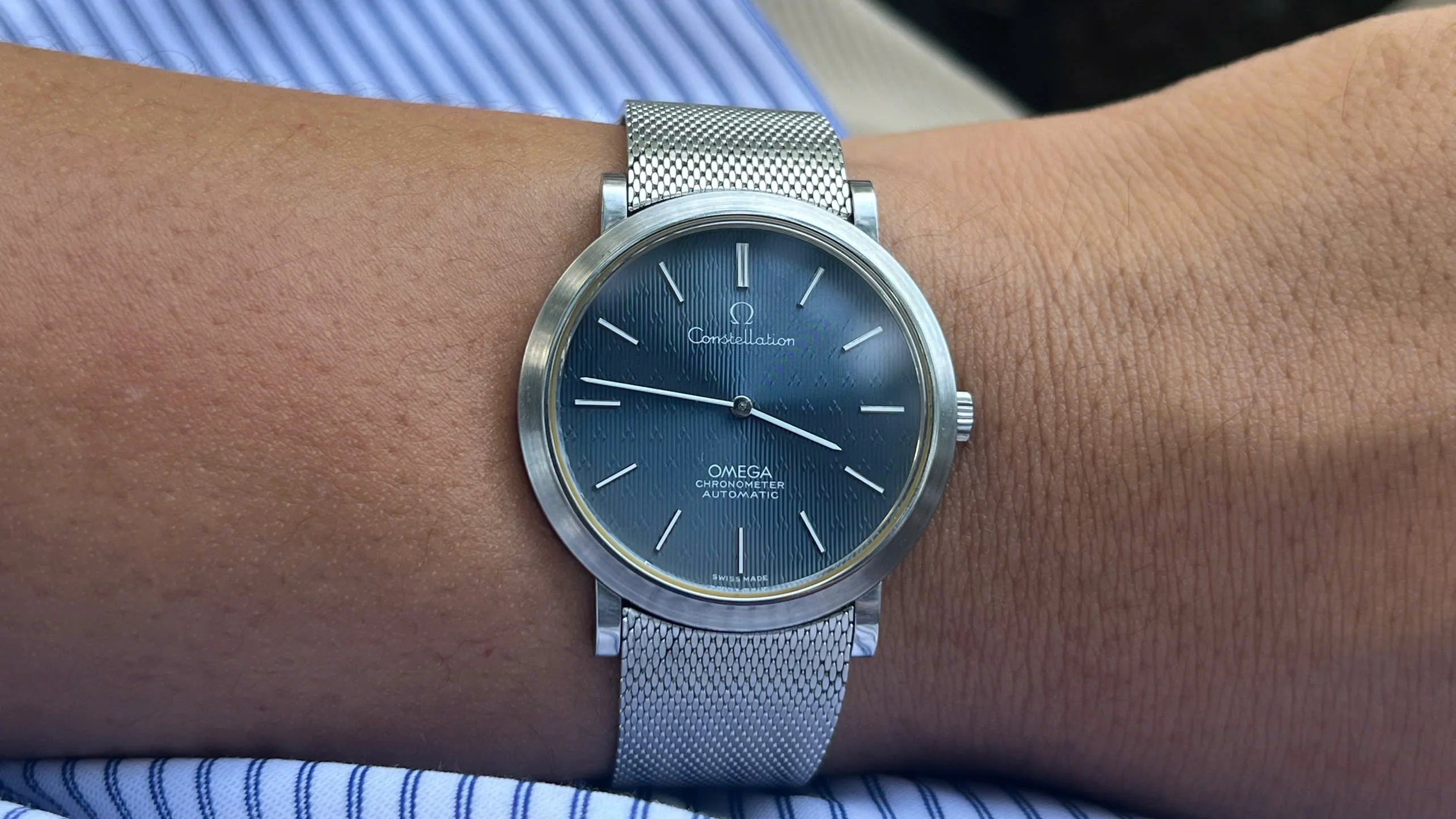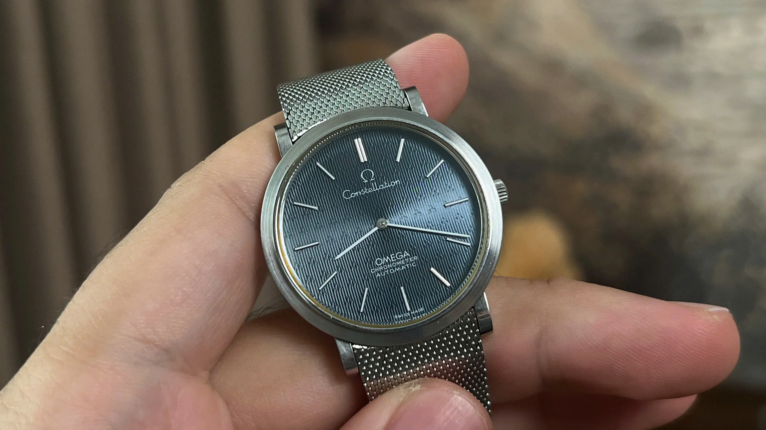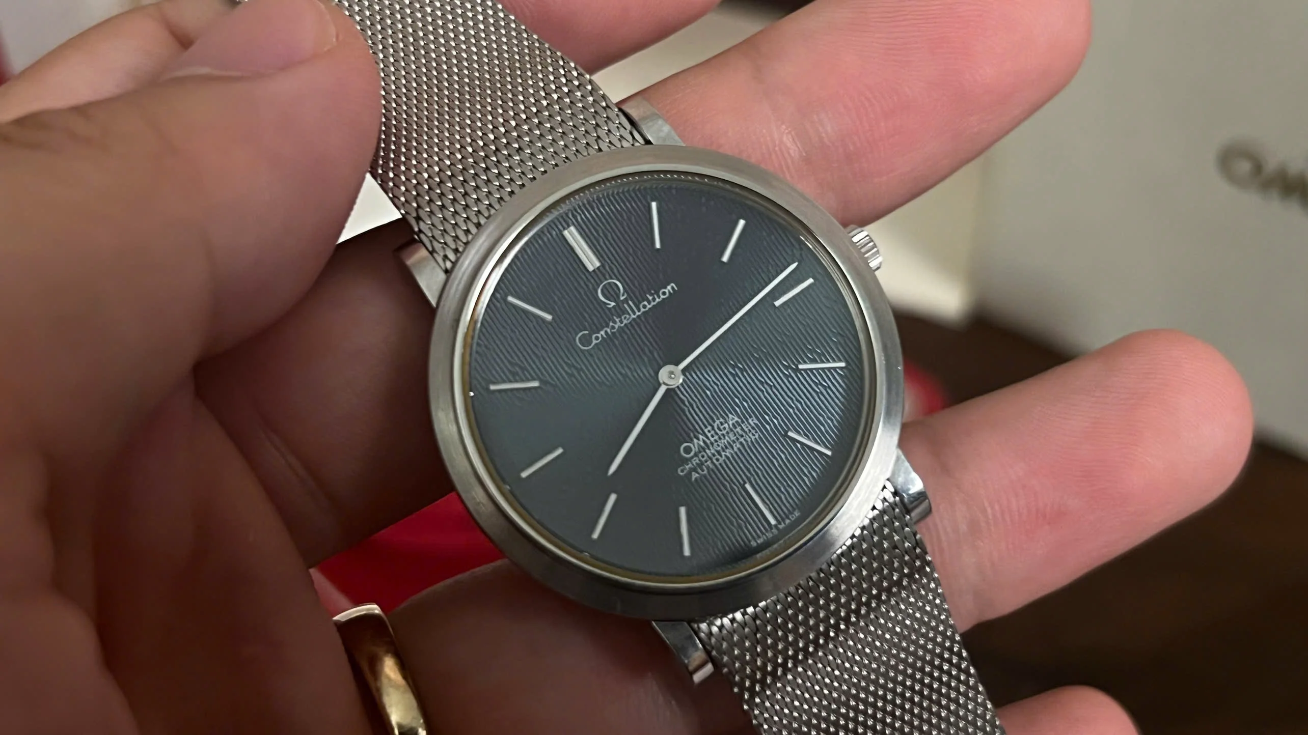 For sale is a 1968 Omega Constellation ref. 157.0001, featuring the ultra-thin chronometer-rated Cal. 712 automatic movement. This reference stands out with its slim case profile and elegant design, and this example is particularly attractive with an original blue textured dial and the correct Omega mesh bracelet (ref. 2041). It also comes with the original Omega double box set (cream outer + red inner), a seldom seen bonus.
