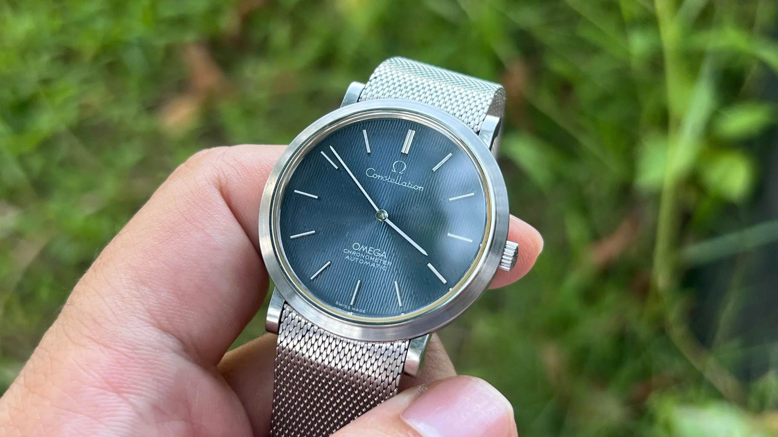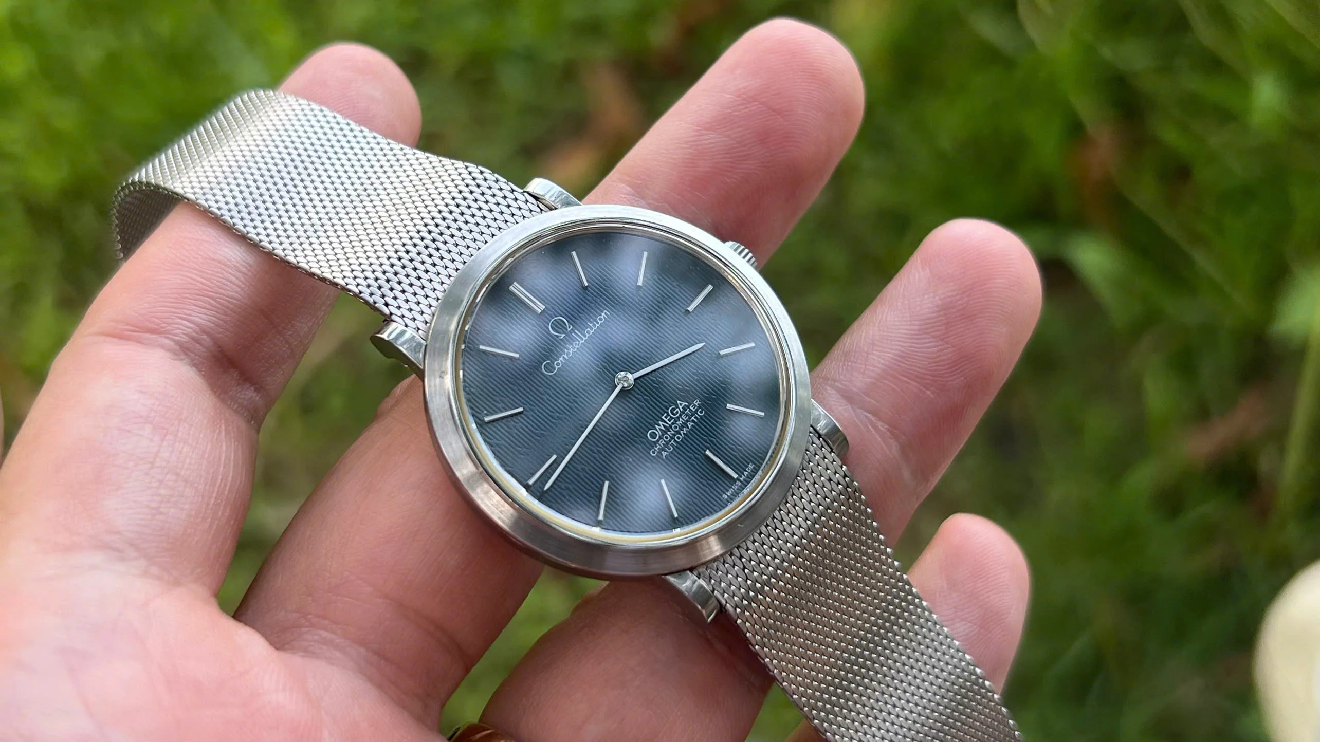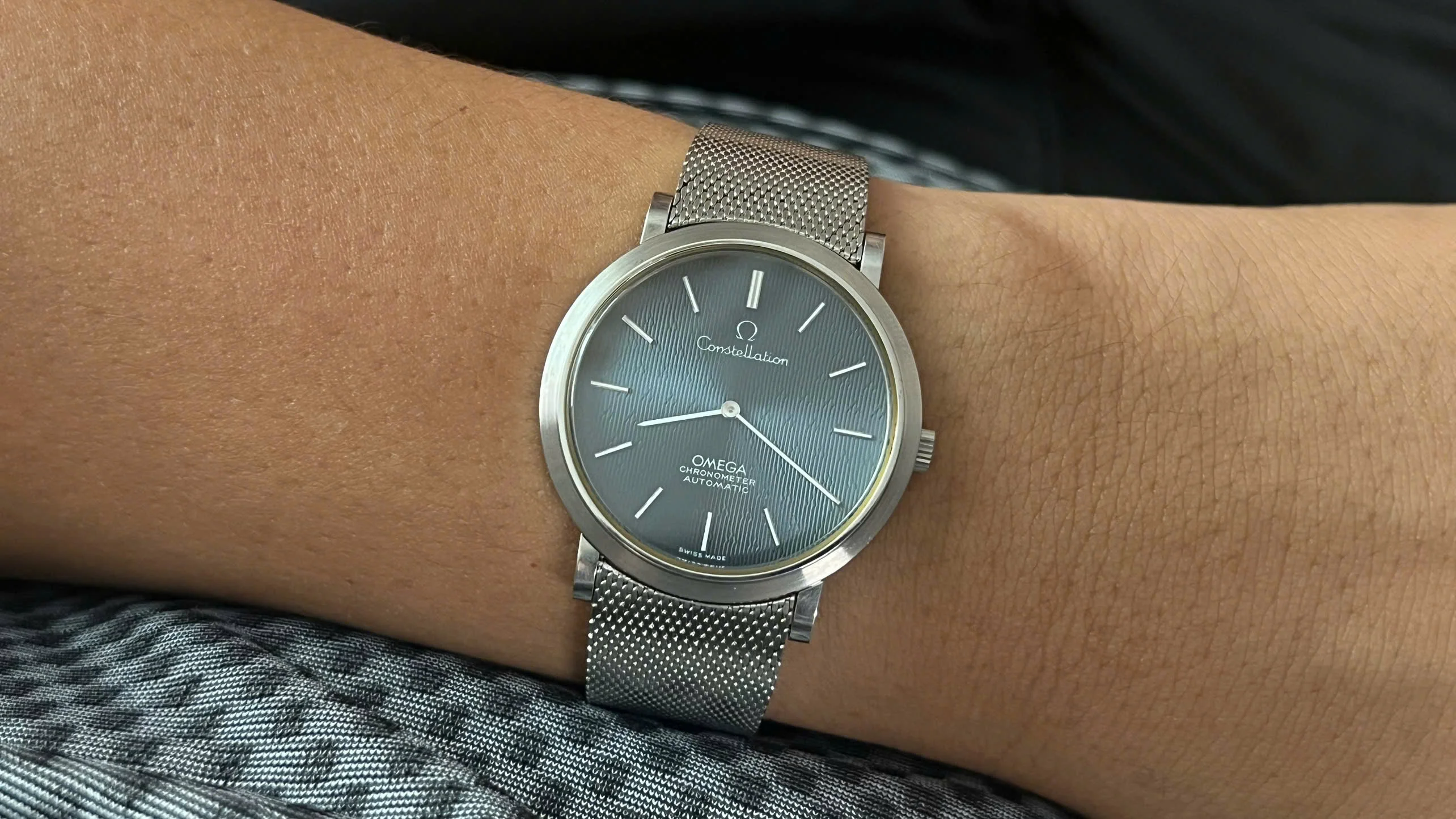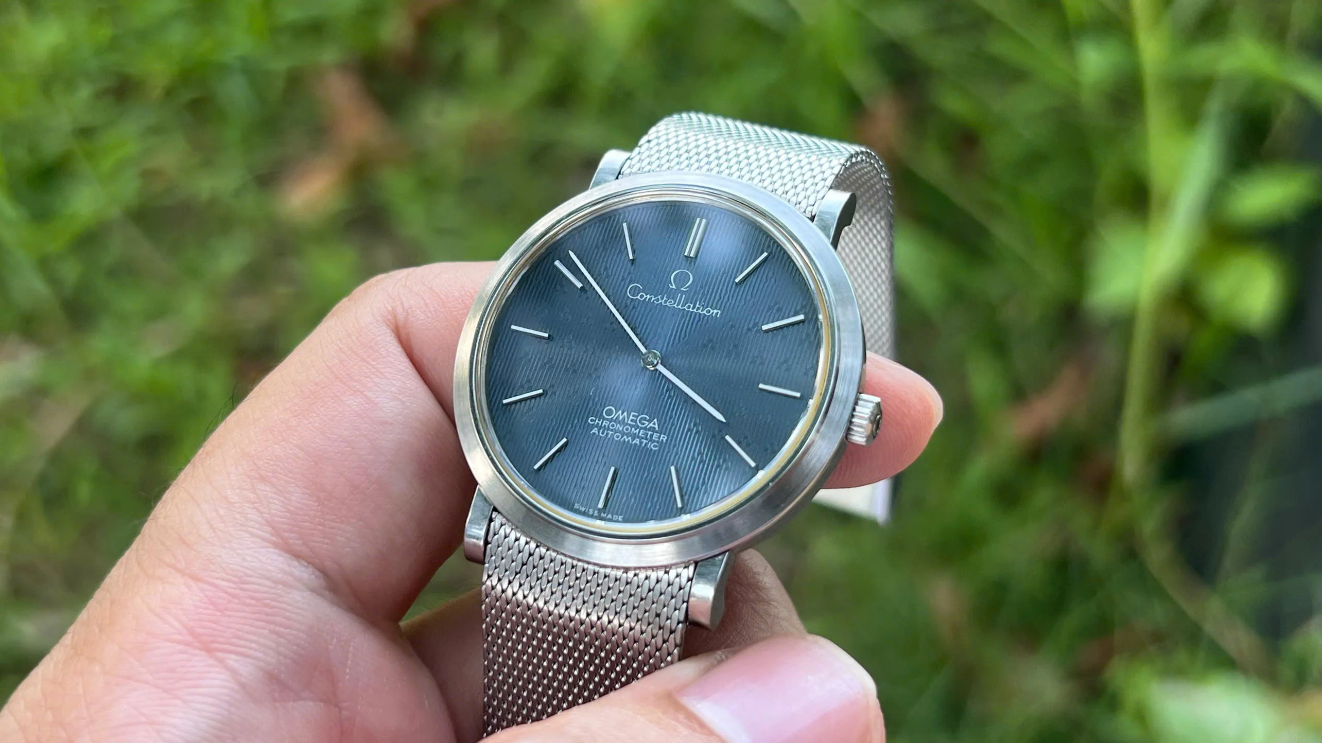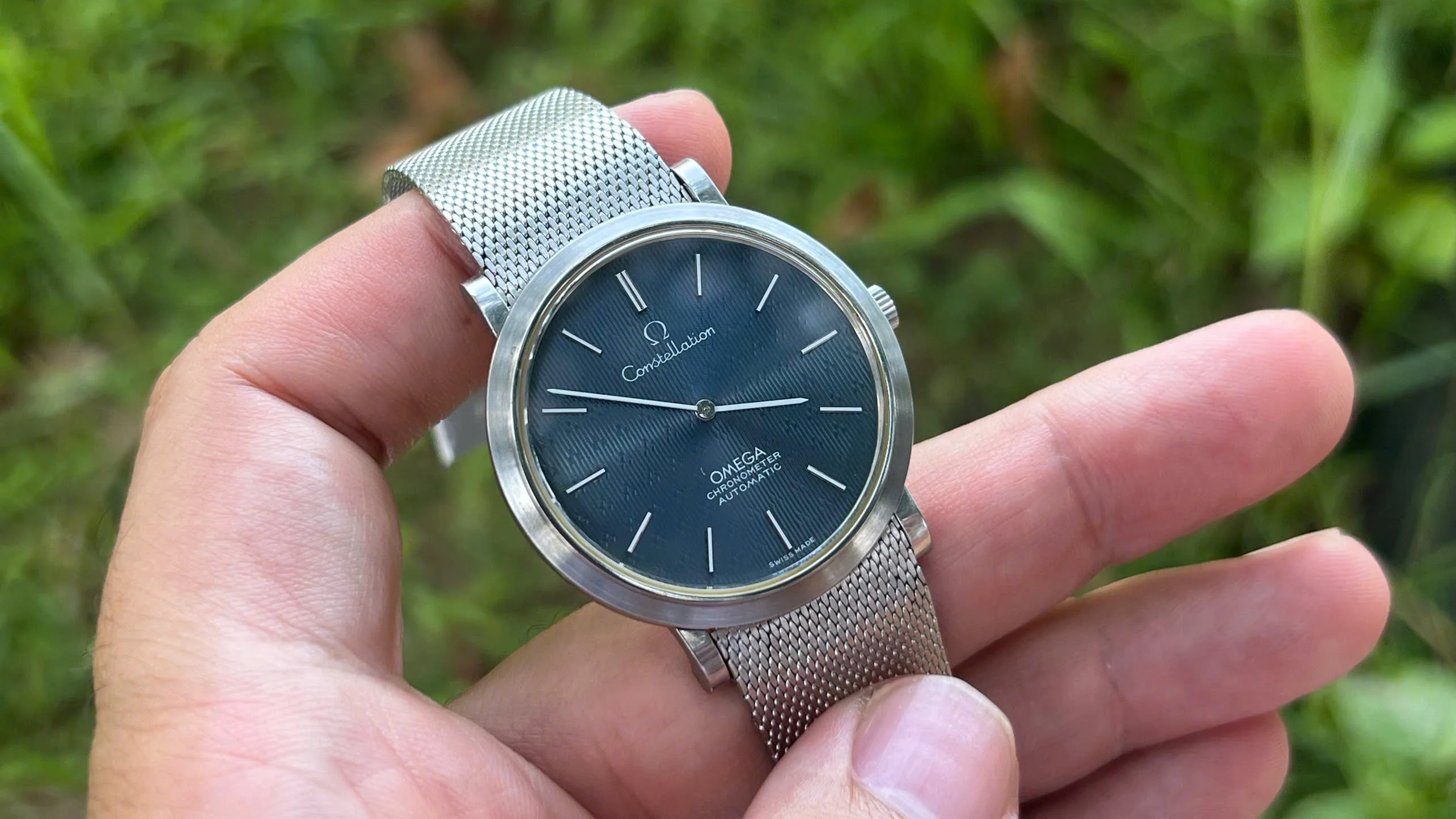 For sale is a 1968 Omega Constellation ref. 157.0001, featuring the ultra-thin chronometer-rated Cal. 712 automatic movement. This reference stands out with its slim case profile and elegant design, and this example is particularly attractive with an original blue textured dial and the correct Omega mesh bracelet (ref. 2041). It also comes with the original Omega double box set (cream outer + red inner), a seldom seen bonus.