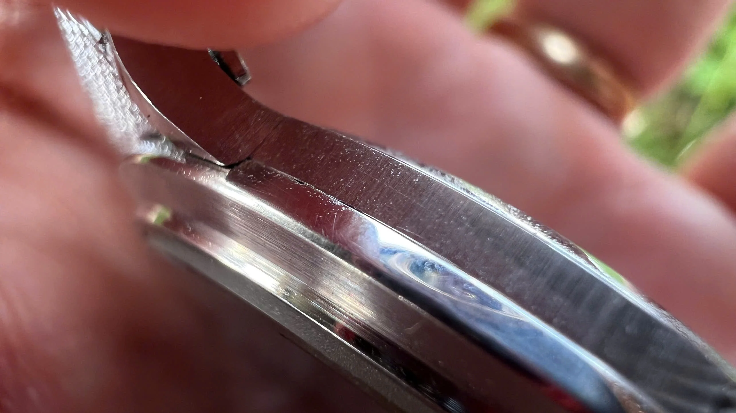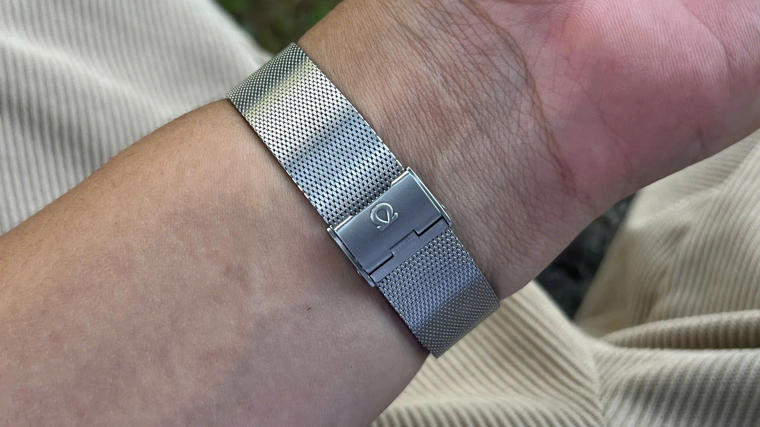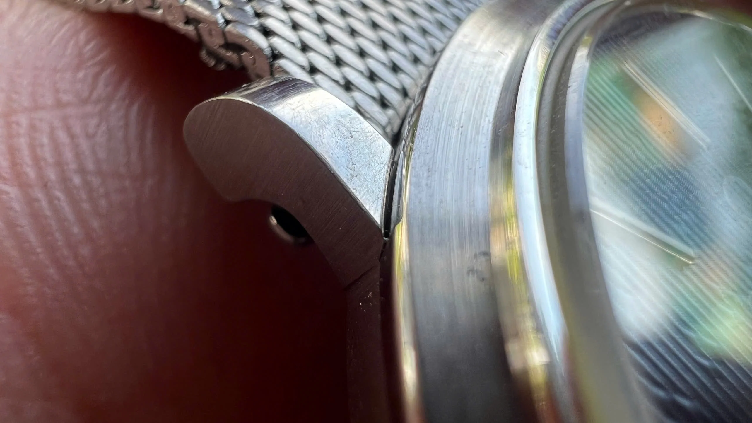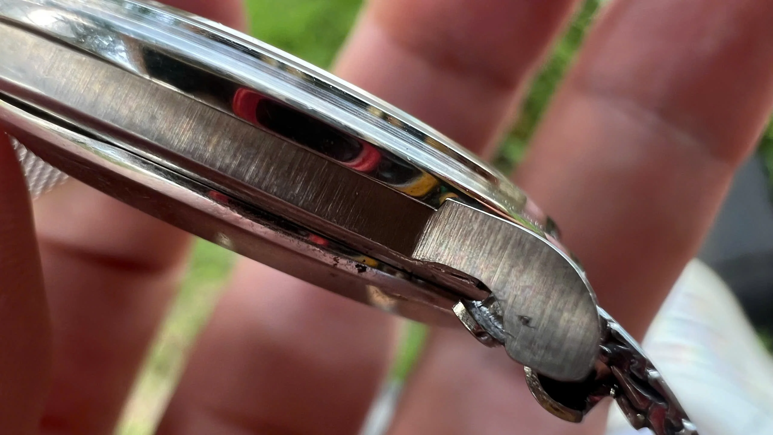 Case: Stainless steel case with factory brushing and crisp lines, unpolished, showing only light handling marks.