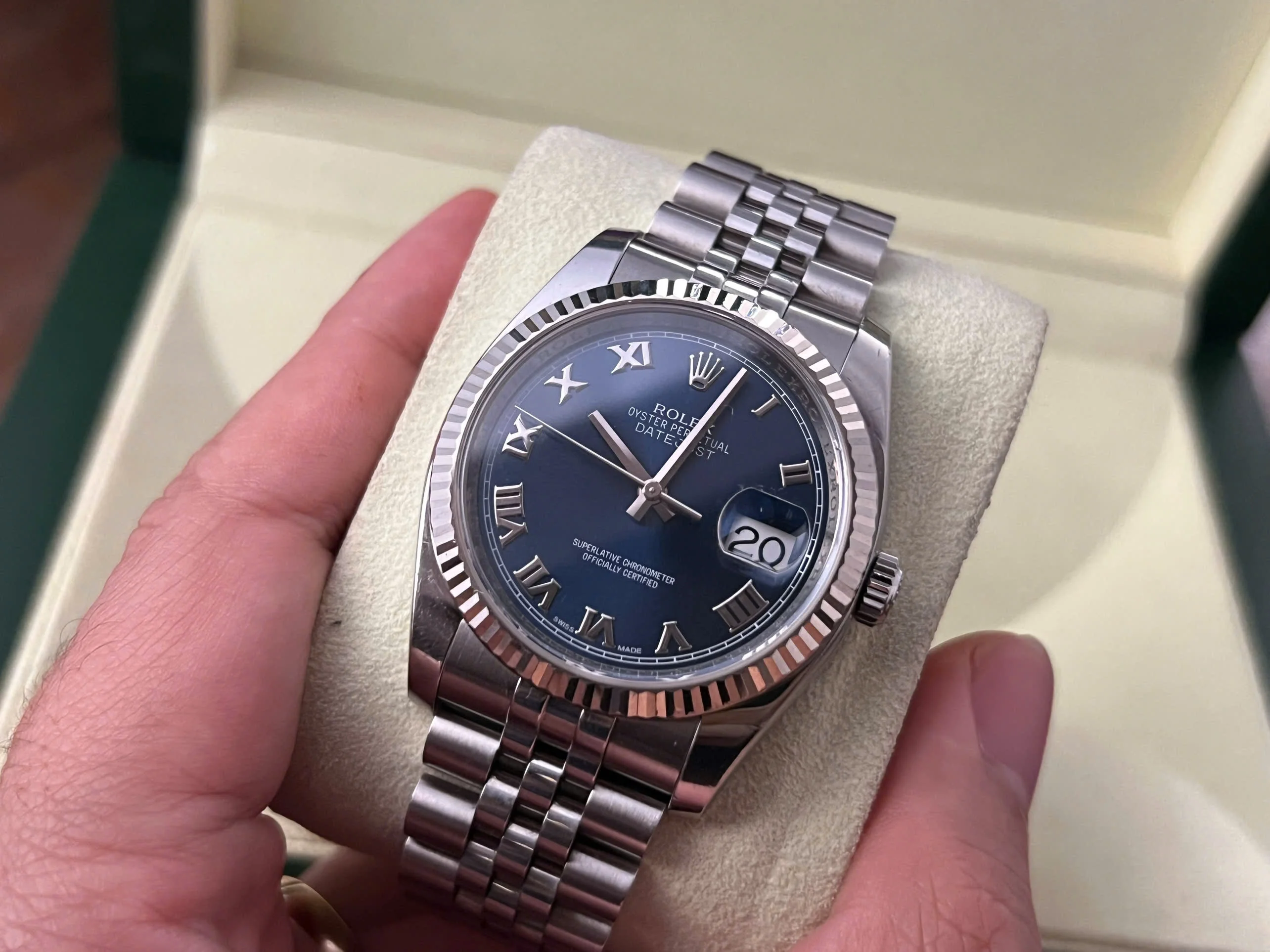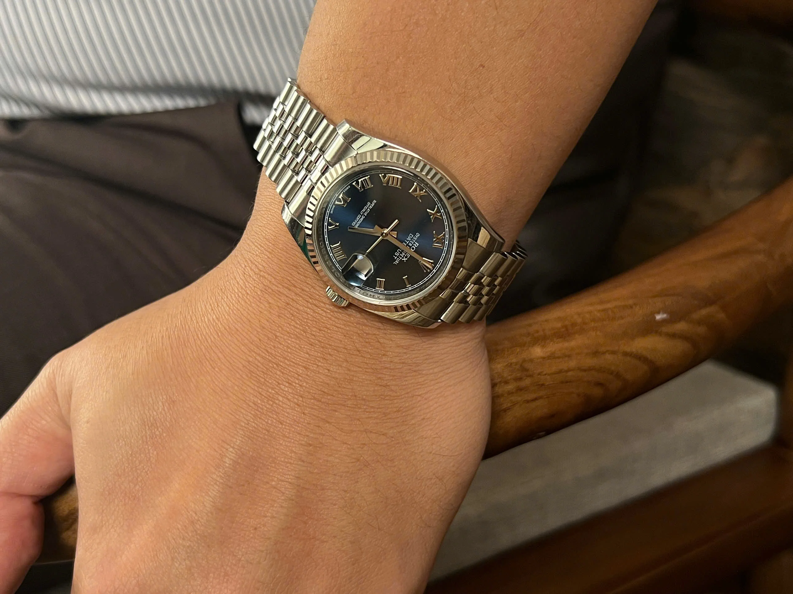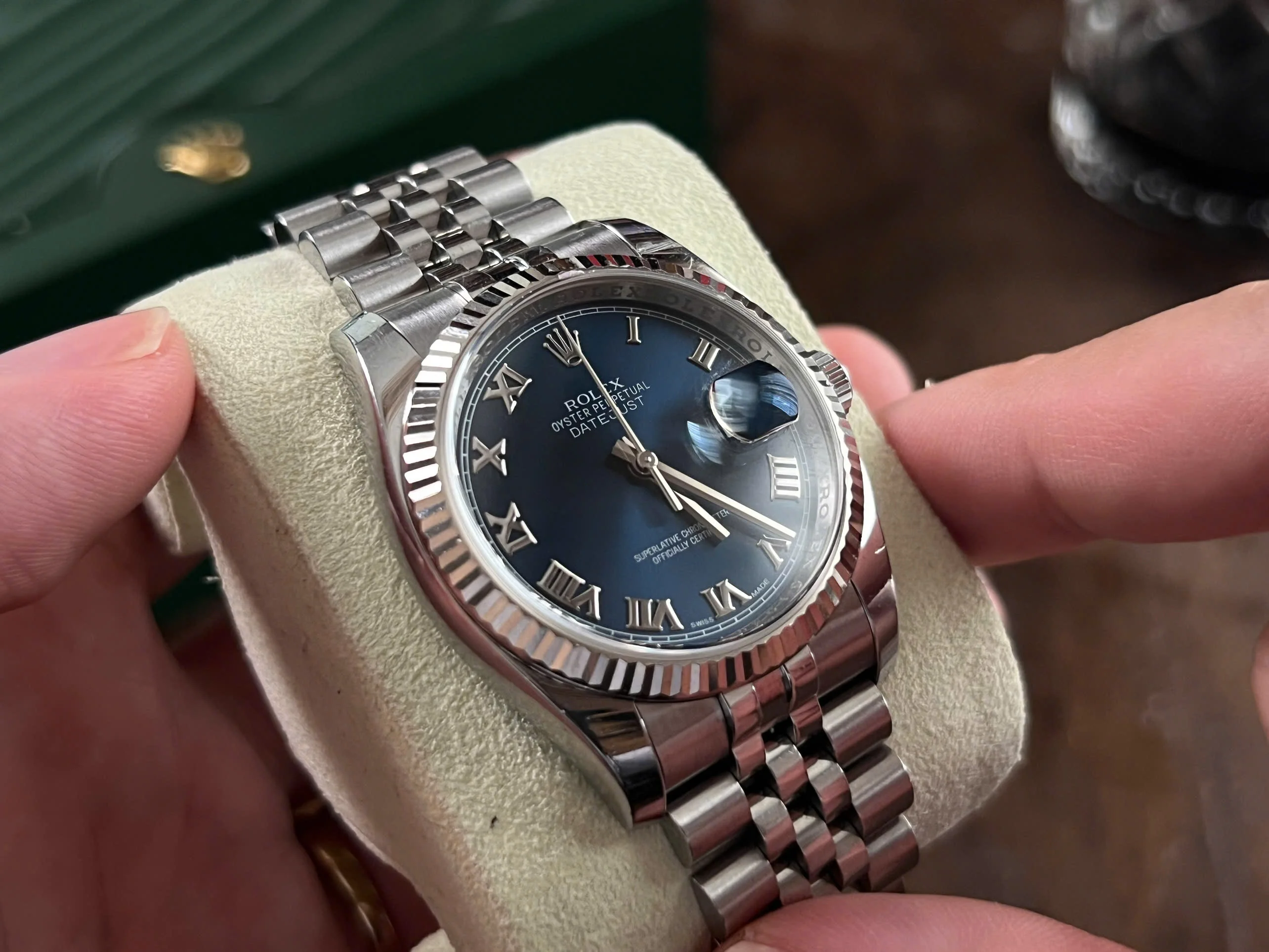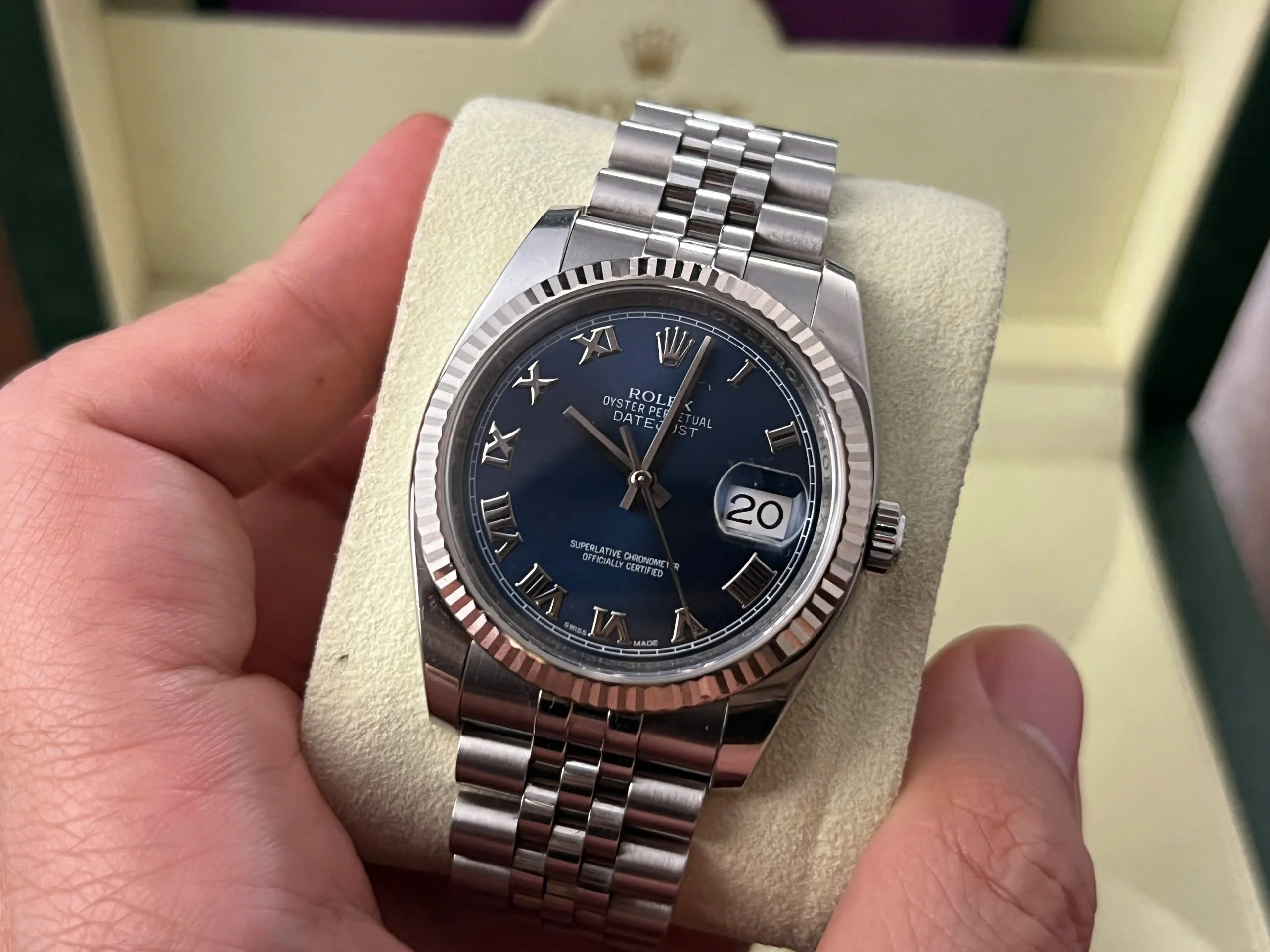 The dial is in flawless condition. A blue dial with Roman numerals is exactly the combination I wanted when I was looking for a Datejust.
