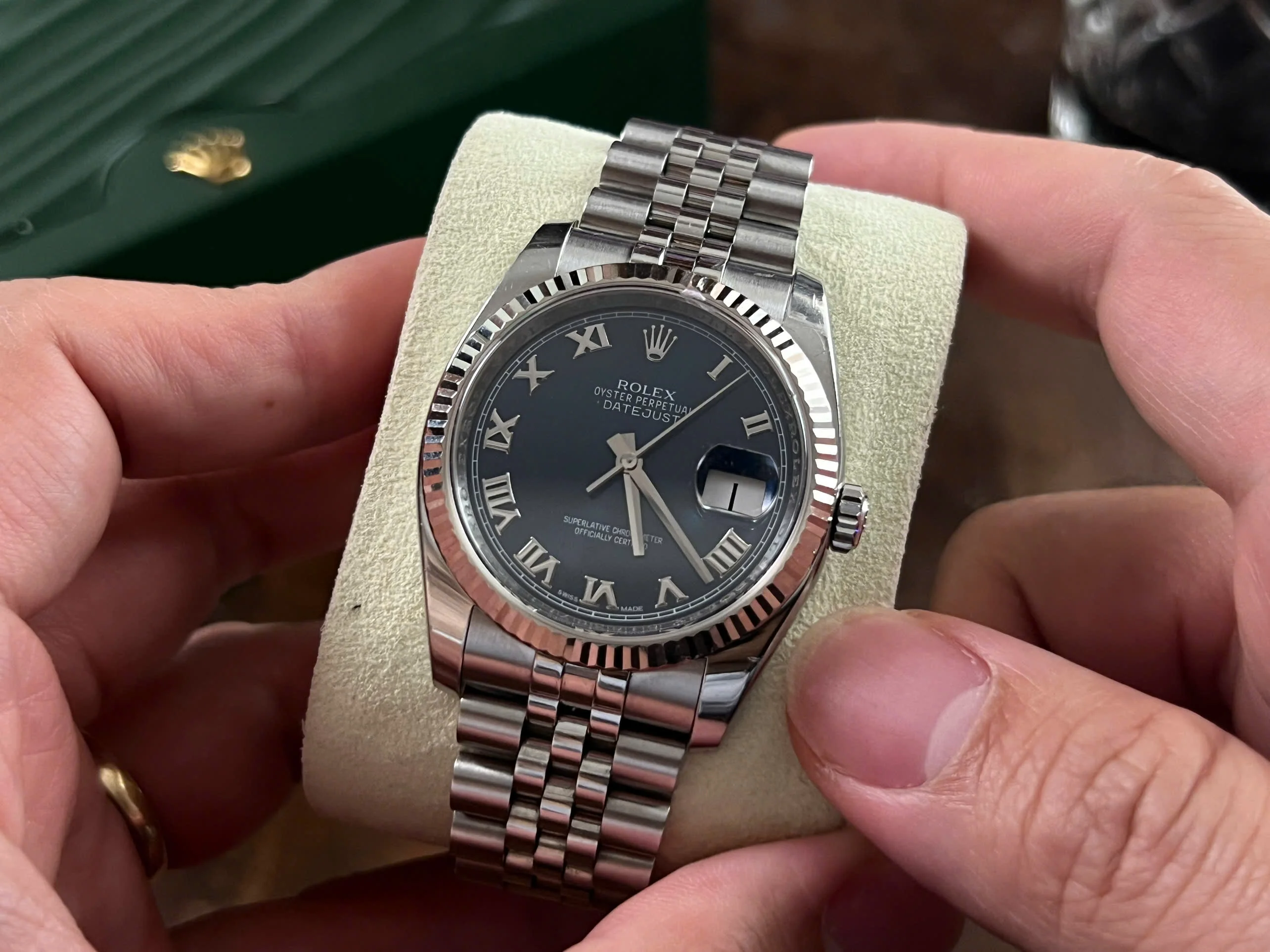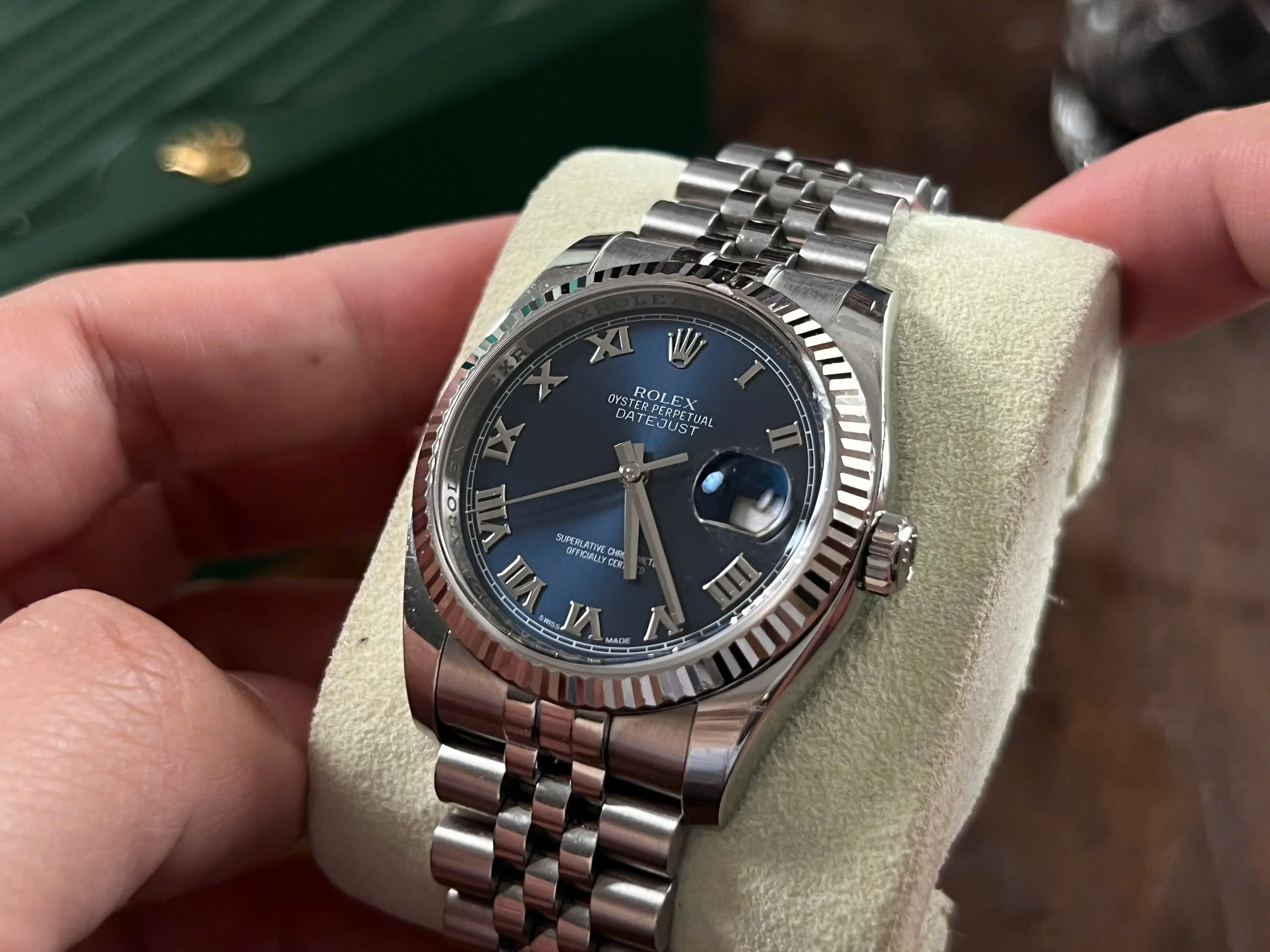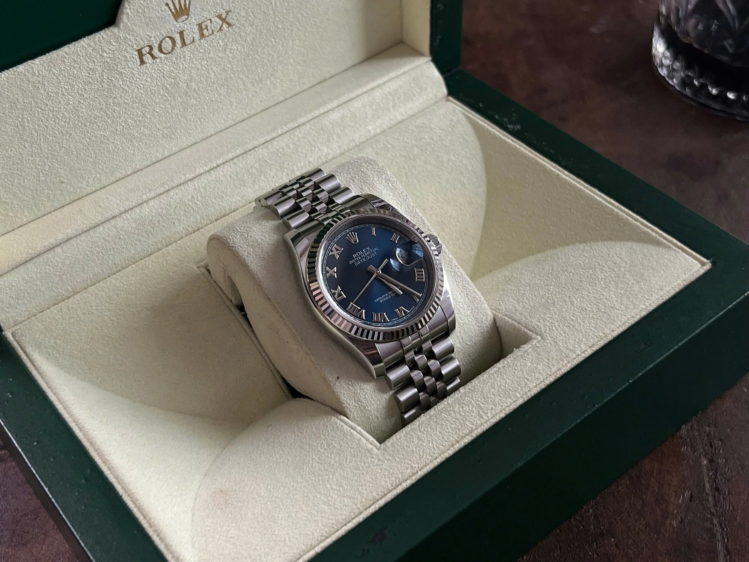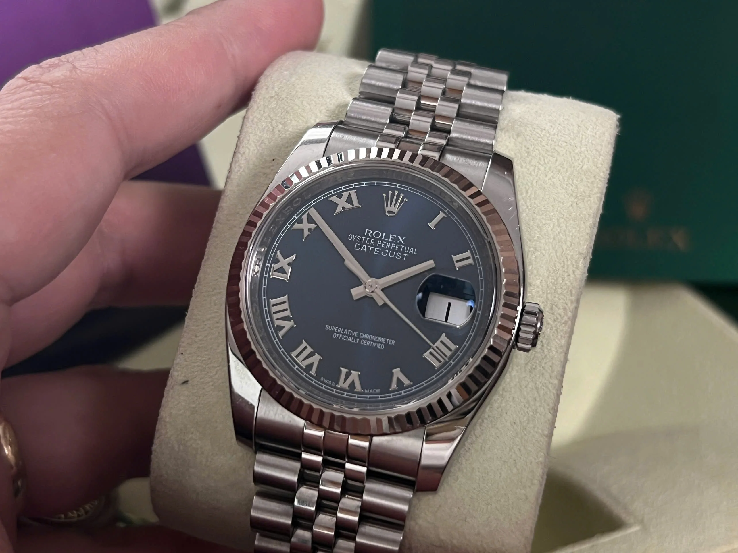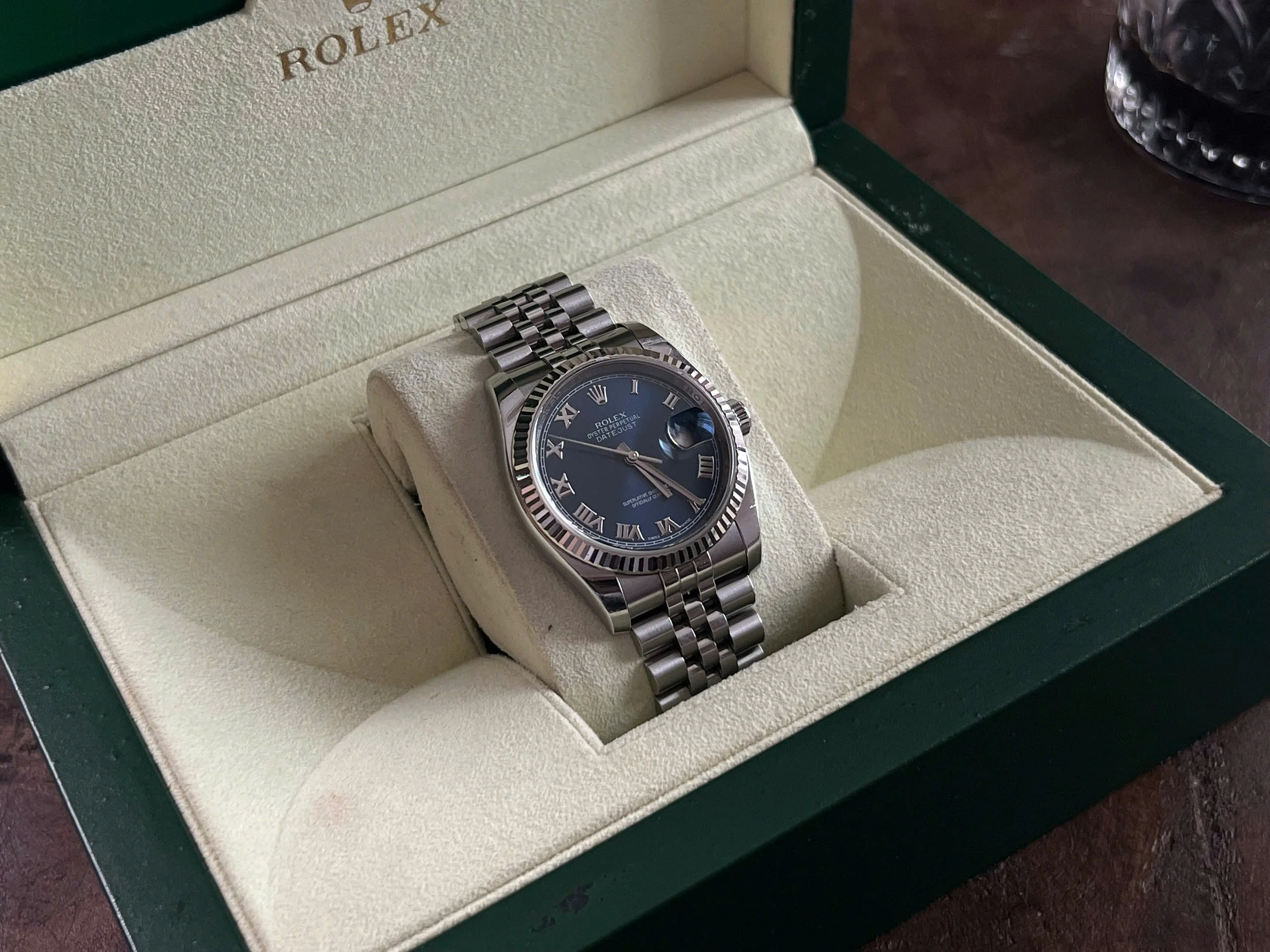 The dial is in flawless condition. A blue dial with Roman numerals is exactly the combination I wanted when I was looking for a Datejust.